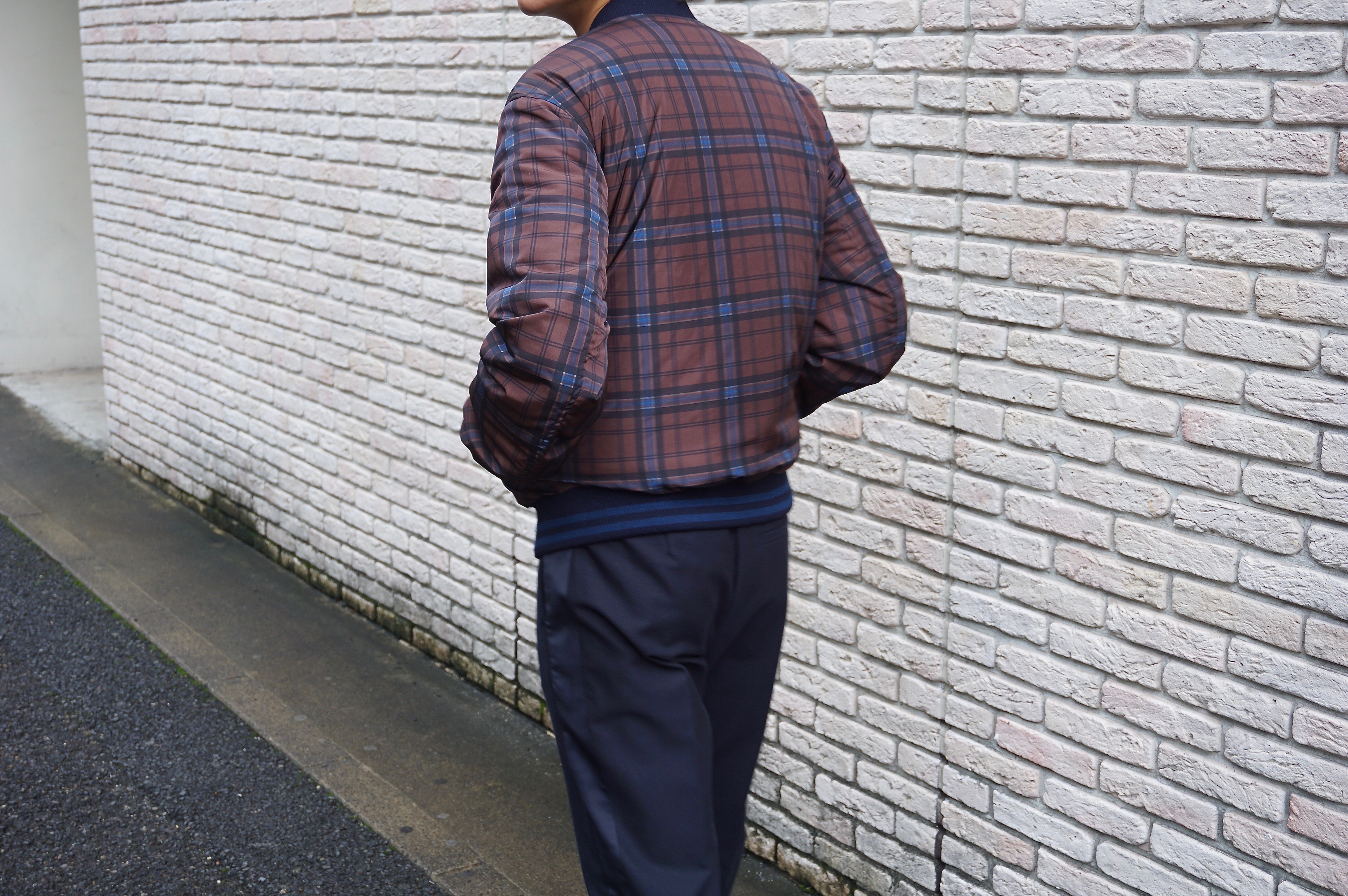毎シーズン好評のリバーシブルのボンバージャケット。今シーズンはゆるやかなオーバーサイズはそのままにクラシックなチェックとダークネイビーで登場。光沢のある上質なナイロン生地とトラディショナルなカラーリングが上品な大人のカジュアルを演出します。印象の強いチェック側とシンプルなネイビーの無地側、一着で正反対の2面性を持つことで二着分の着こなしを楽しむことができます。