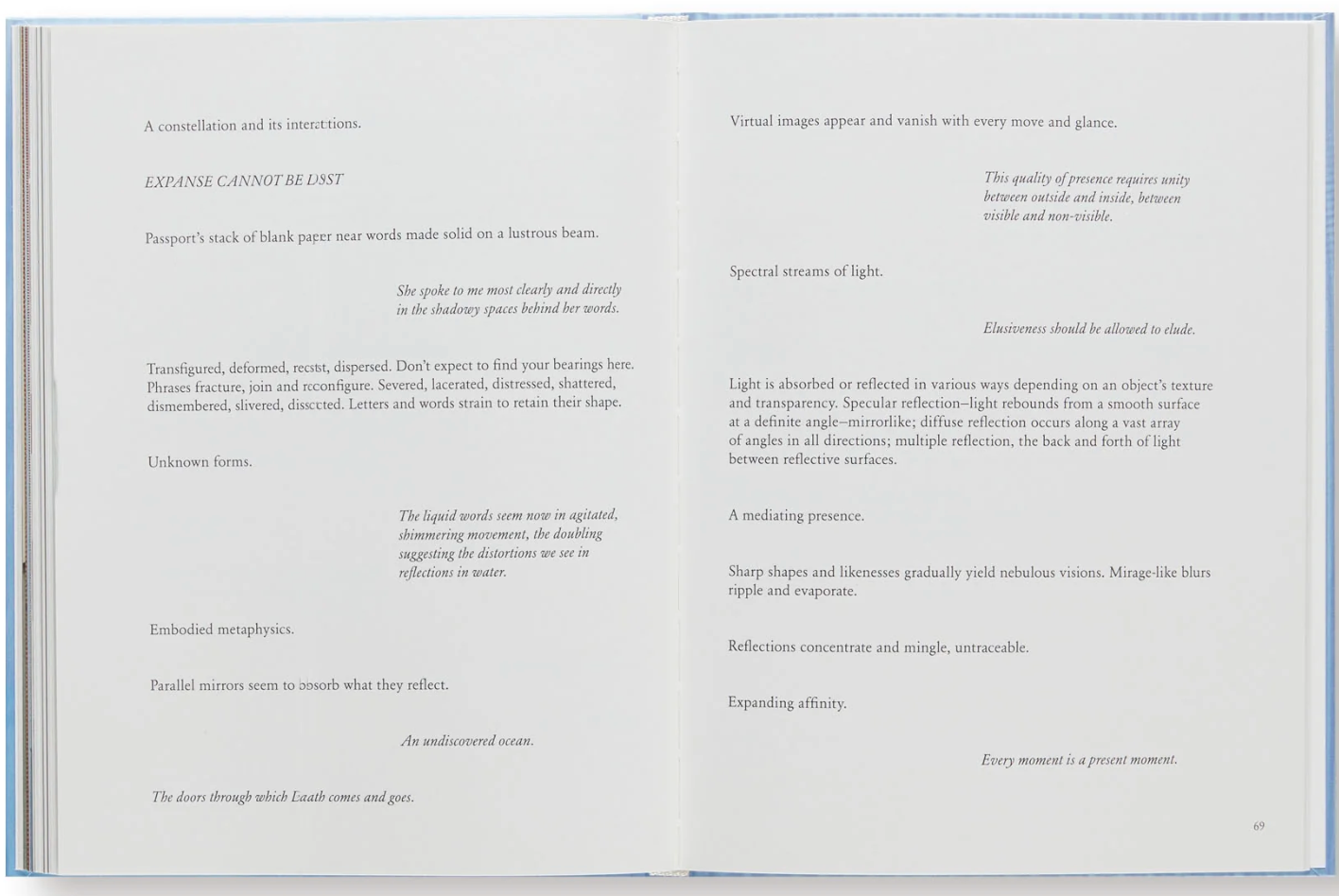キューバ人アーティスト、フェリックス・ゴンザレス=トレス(Felix Gonzalez-Torres)とアメリカ人アーティスト、ロニ・ホーン(Roni Horn)による作品集。1990年、ゴンサレス=トレスは、「ロサンゼルス現代美術館(Los Angeles Museum of Contemporary Art / MOCA)」の床に置かれたシンプルな薄い金箔の作品に出会った。ホーンの作品「Gold Field」(1980年/1982年)である。その後、1996年にゴンサレス=トレスがこの世を去るまで、両者の交流は続いた。本書は、二者の作品がもたらす体験的な特性と、その根底にある深遠な関係性を鑑賞者に共有することを意図したフォト・エッセイとして制作されている。ゴンサレス=トレスの「Untitled(For Stockholm)」(1992年)、「Untitled(Blood)」(1992年)、ホーンの「Well and Truly」(2009-10)、「a.k.a」(2008-09)という代表作4点を中心にフォーカスを当て、二者による折り重なることによる増幅、二元性、反復、アイデンティティという観念を強調している。本作の展覧風景は、2022年にパリの現代美術館「ピノーコレクション(Pinault Collection)」で開催された展覧会の際に撮影されたものであり、両者の過激なまでの視覚的語彙とともに、言葉や文章や詩に対する共通の情熱を感じ取ることができる。アーティスト、鑑賞者、作品との間に緊張感を与えること、また表現できないものや測り知れないものを理解しようとすること、その2つの意図が浮かび上がってきます。