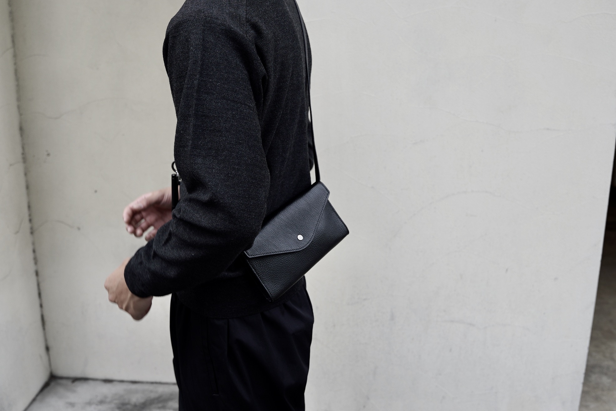 小さな封筒のような形で、スナップ フラップでの開閉、トップステッチが印象的です。