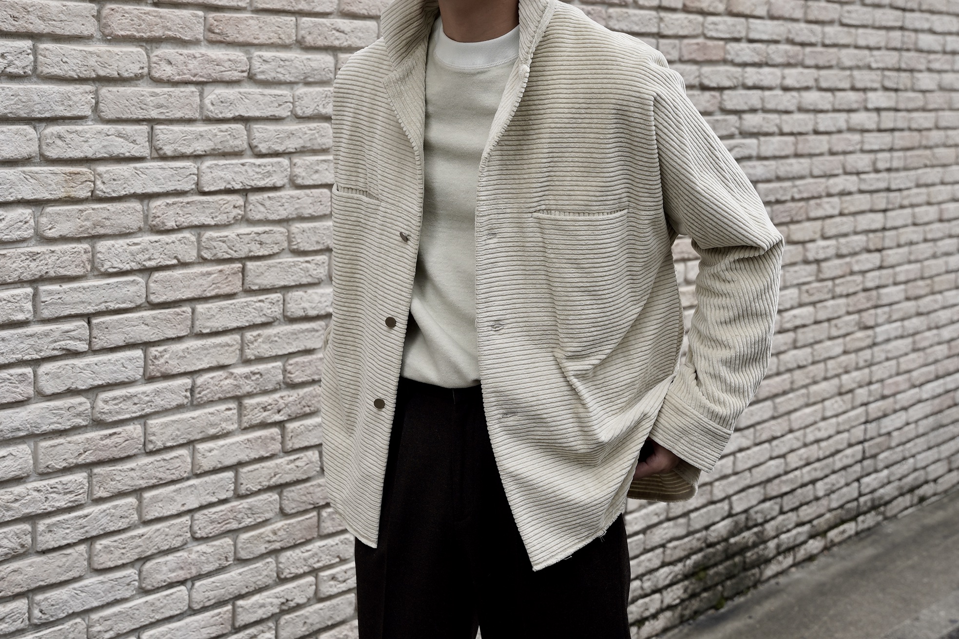 コーデュロイの畝は後ろ身頃上部がバイアスに配置されているのに加え、全体を横にあしらう事で表情豊かな仕上がりに。