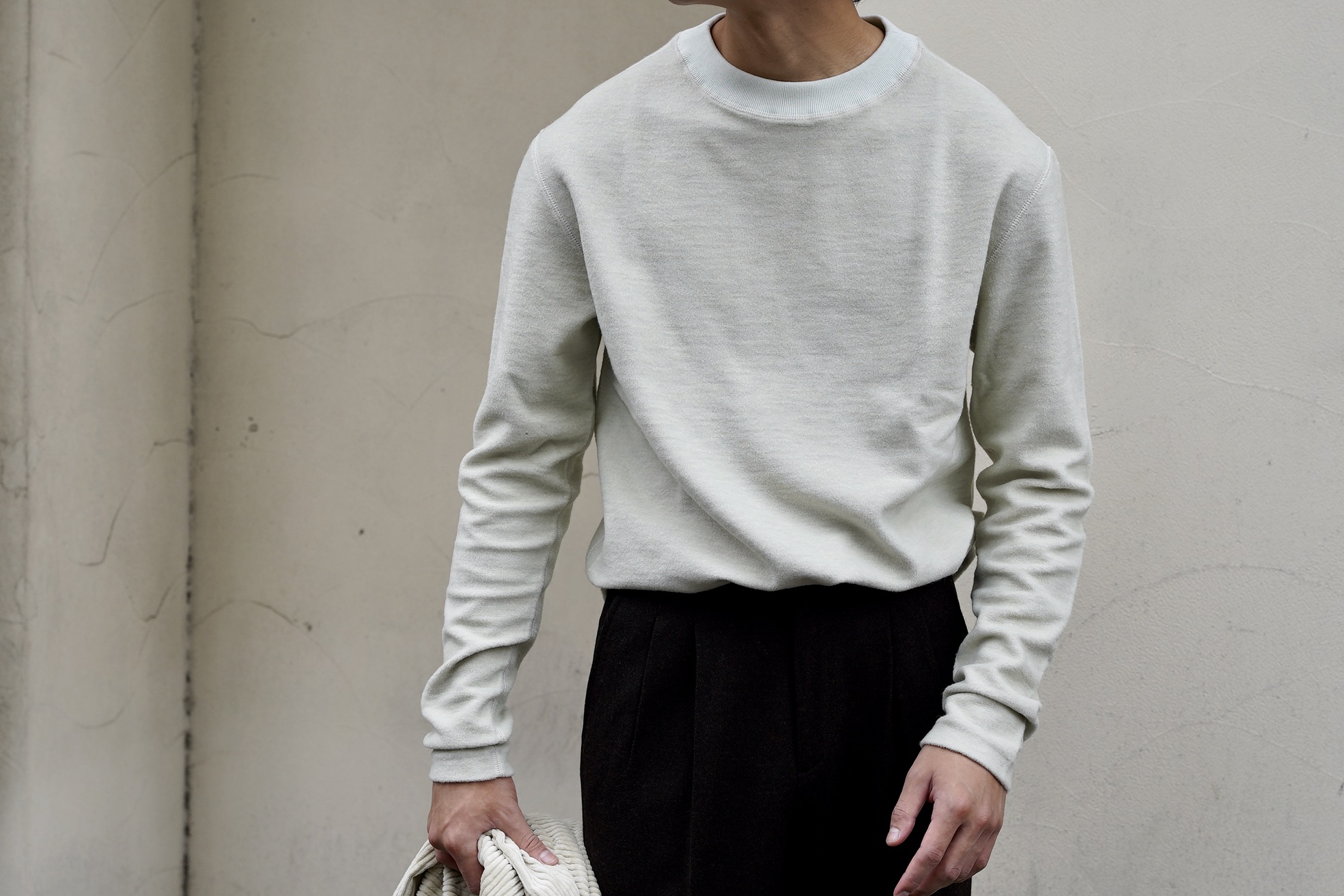 柔らかなウール地で仕立てられており、ニットに近い保温性とスウェットの気楽さを合わせ持ちます。
