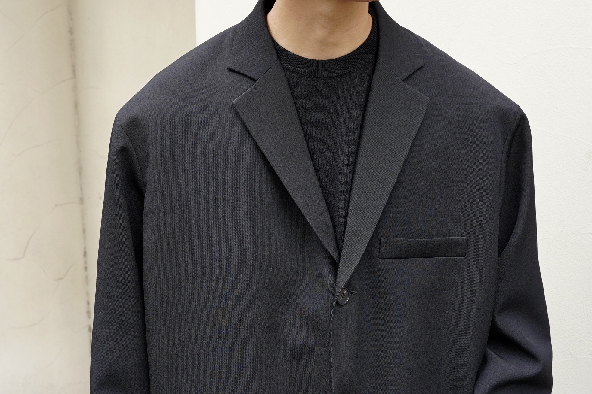 3つボタン仕様、ピークドラペルで仕上げている事で端正ななかにクラシカルな華やぎをもたらしています。