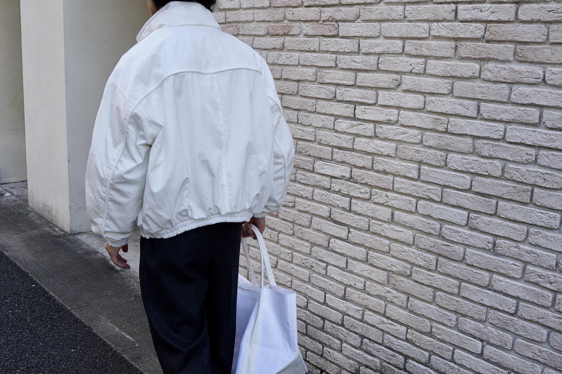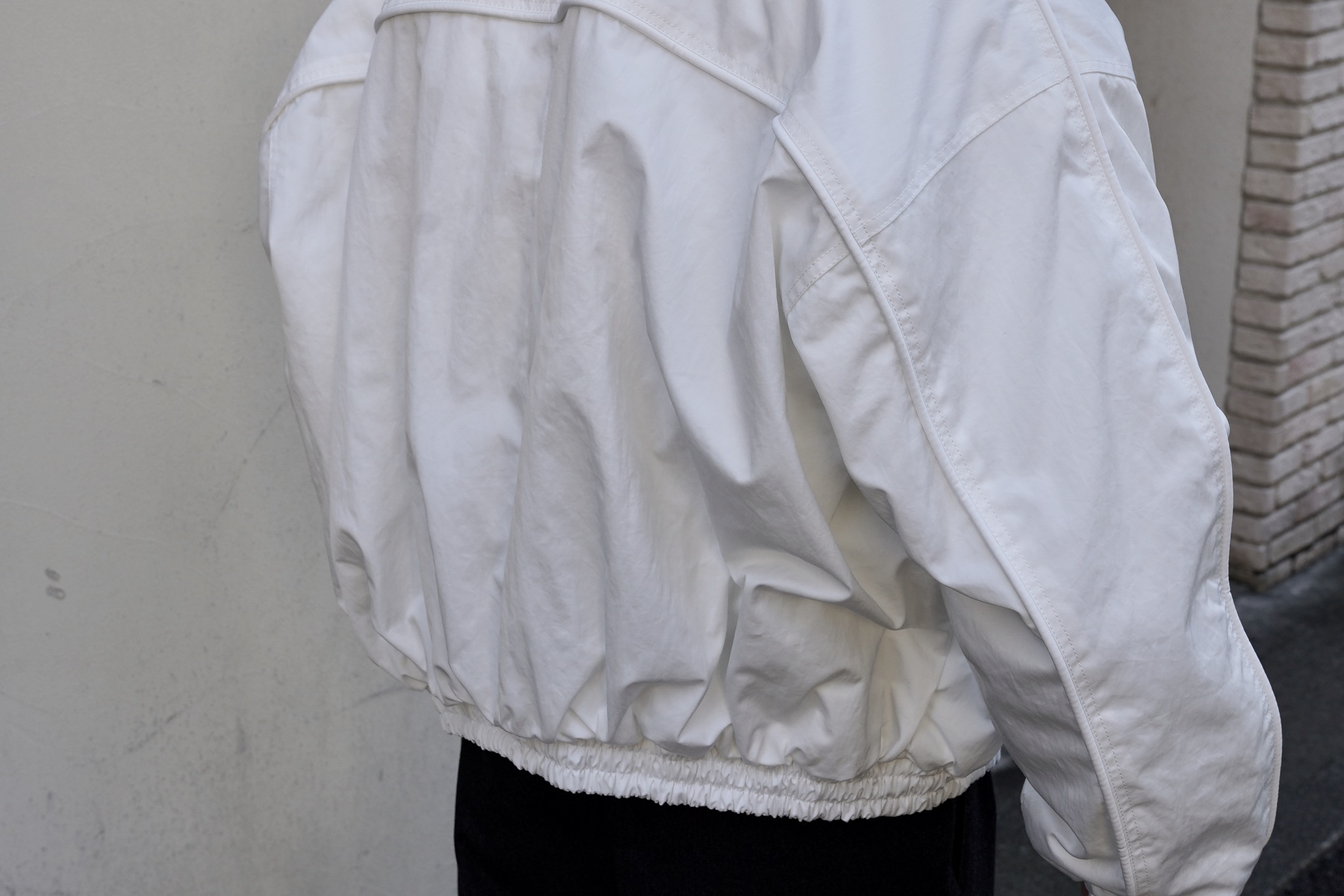 大胆なシルエットを引き立てる背中から袖にかけてのパイピング仕様、裾にリブをあしらう事でシルエットにメリハリをつけています。