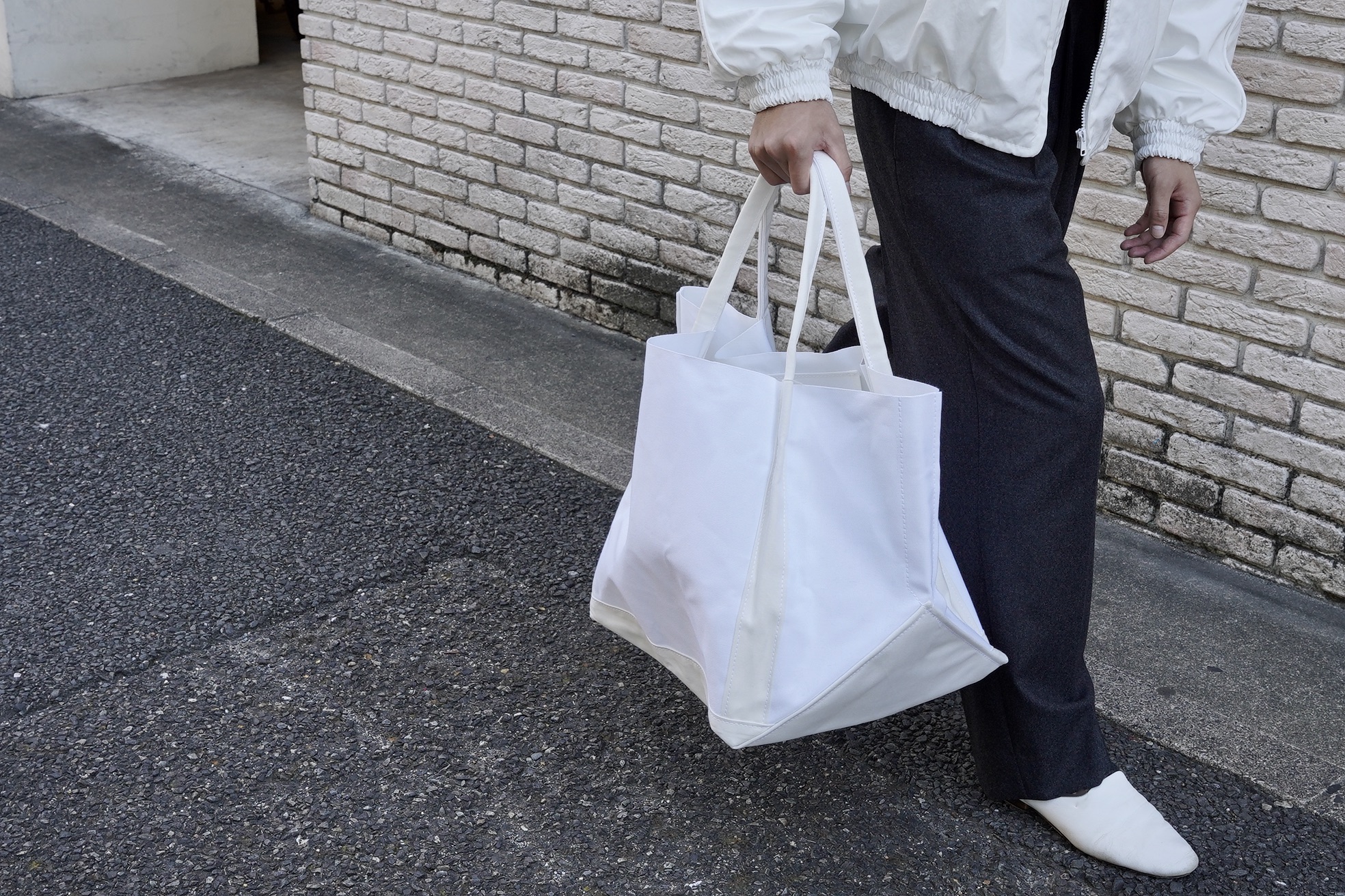 オーバーシルエット、独特のマチデザインがコンテンポラリーなムードを見せます。