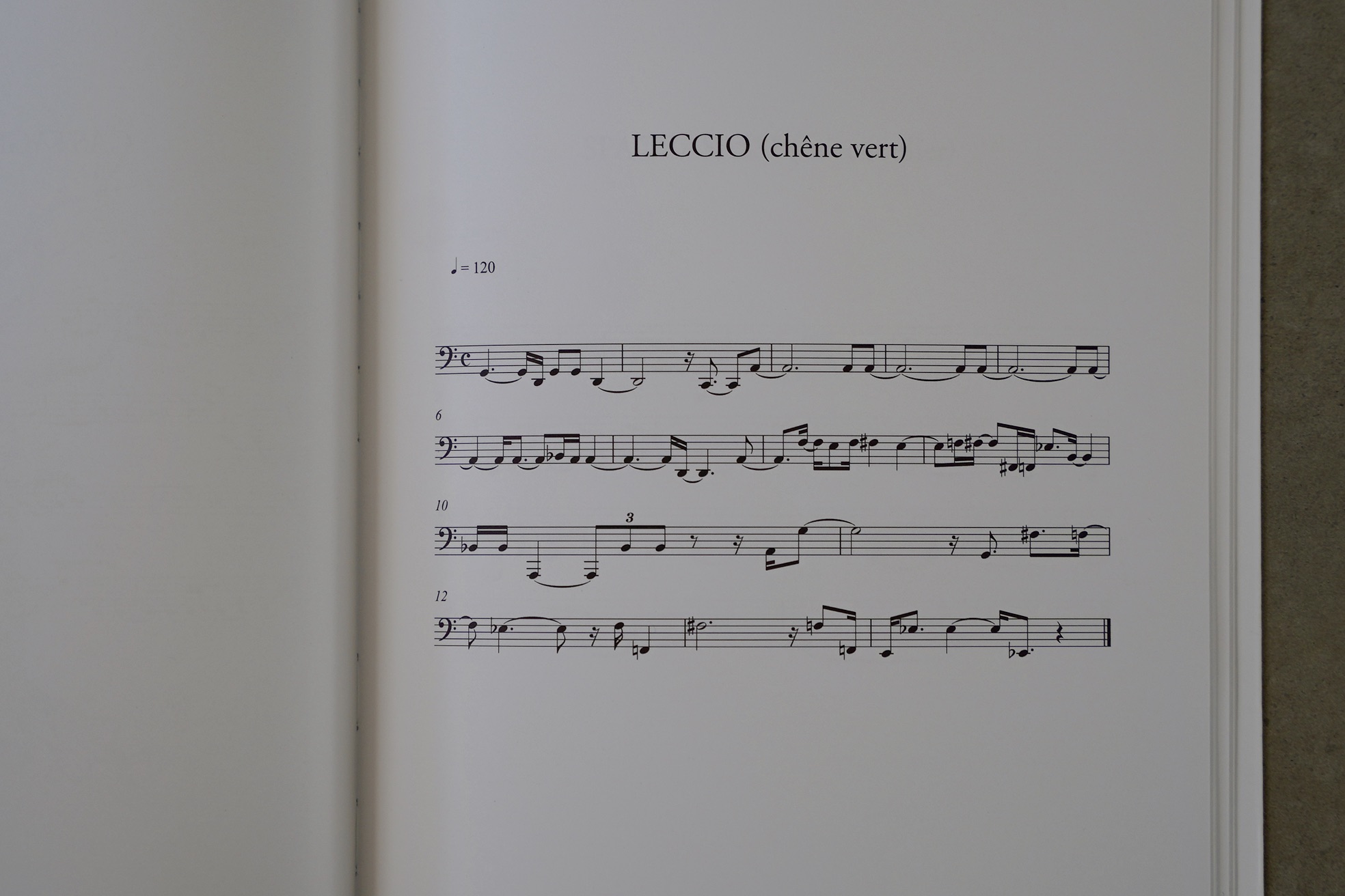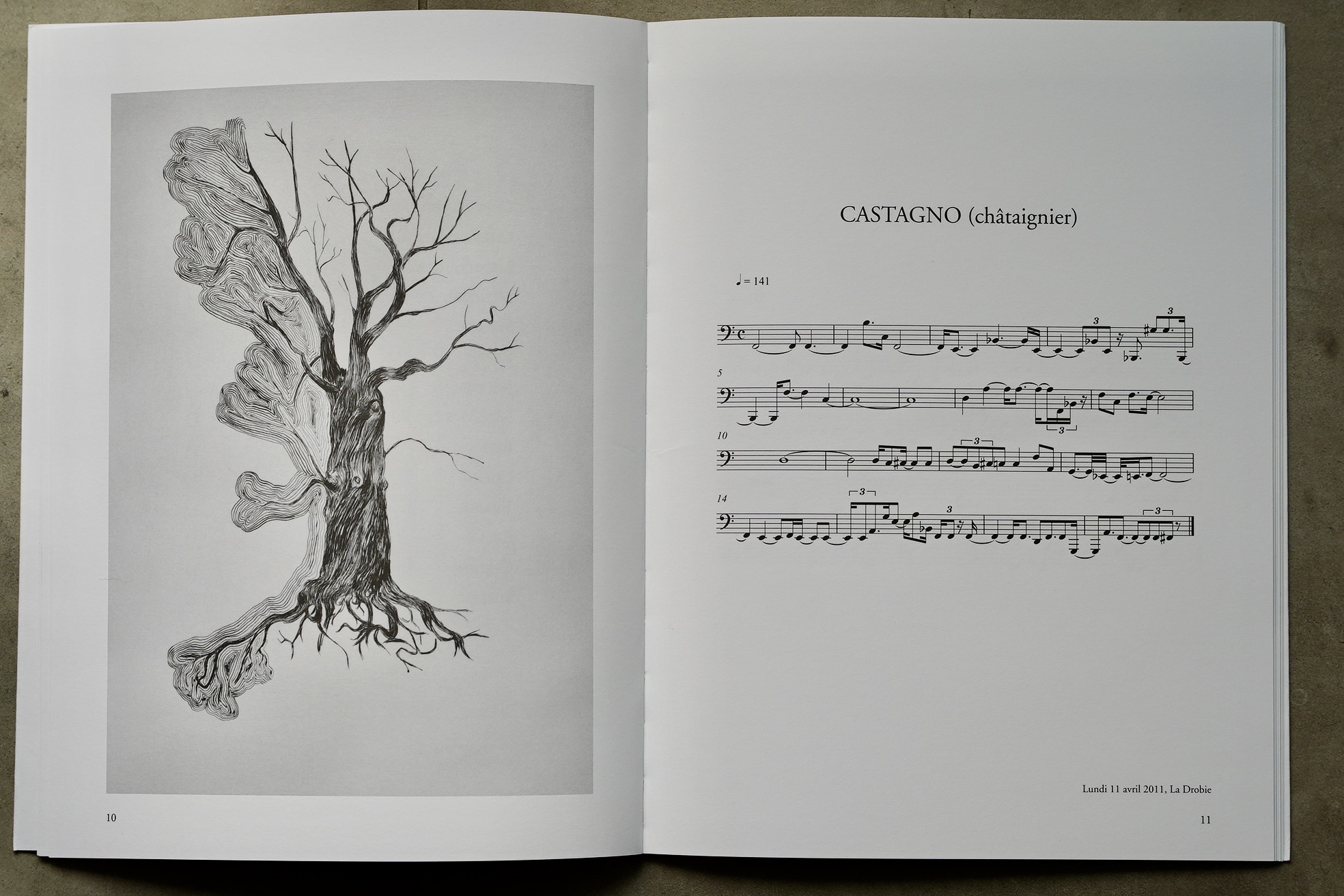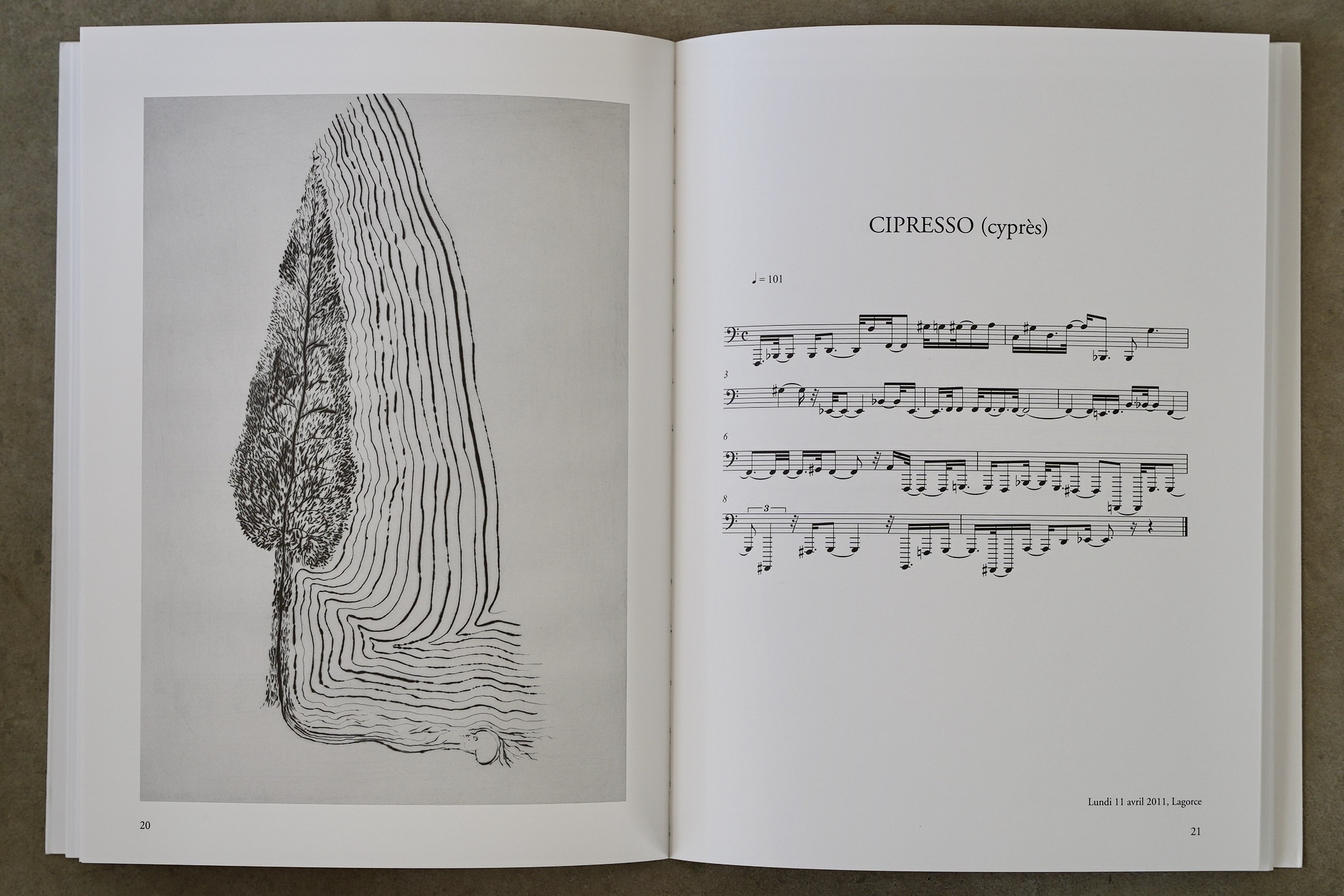 彼は、トラヴェルセ集団の招待により、フランス・アルデシュでの創作滞在中に(2011年)、作品『木の構造の音楽転写』を制作しました。アルデシュの領土を旅するよう誘われたペノーネは、ゴム槌を手に歩き、33 本の木を叩きます。各ストロークが記録され、拡張されて楽譜に変換されます。この作品は、14本の木の構造の秘密のメロディーを明らかにし、そのうちの7種は彫刻で描かれており芸術家とアルデーシュの森との出会いを造形的な言語で証言しています。