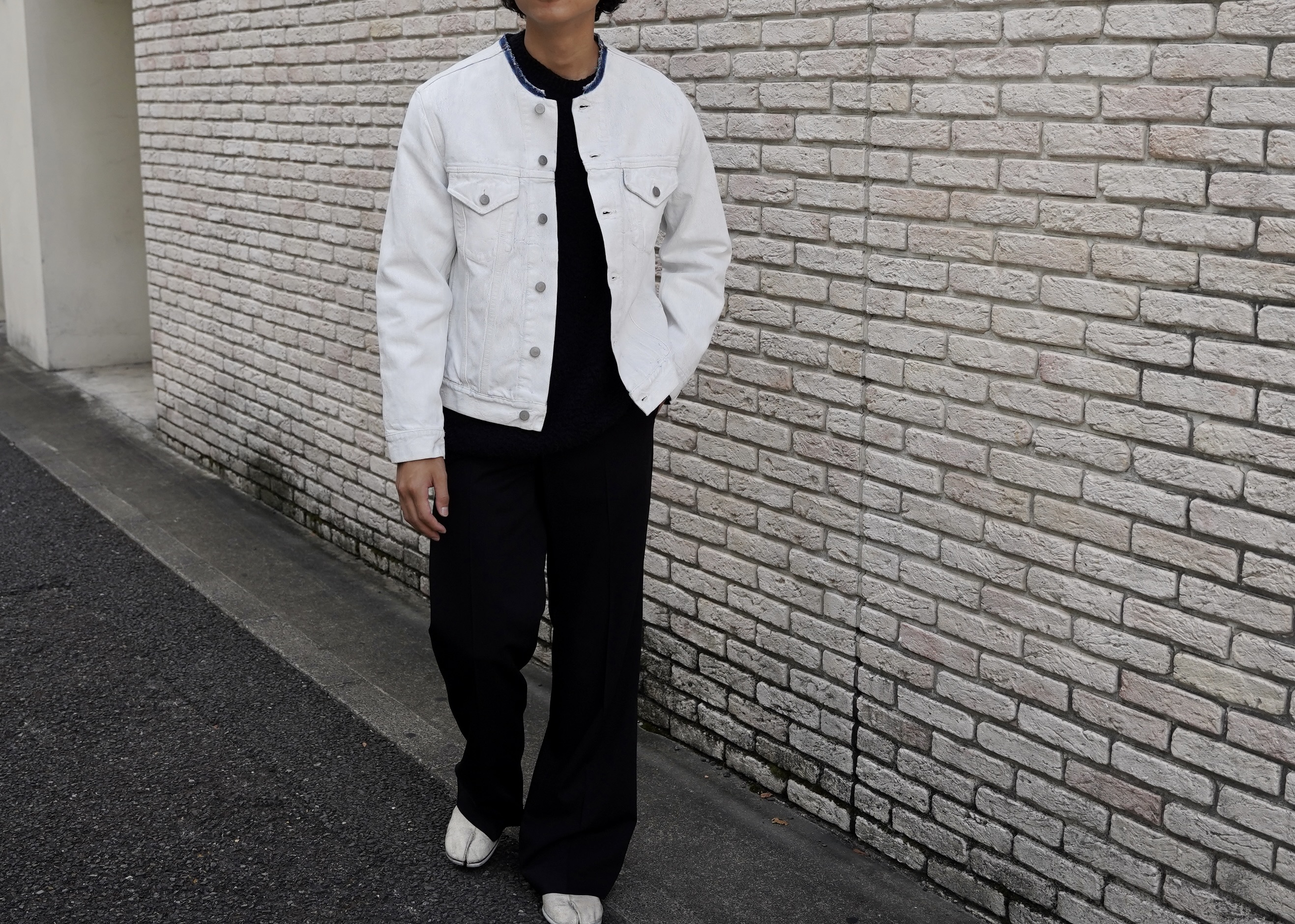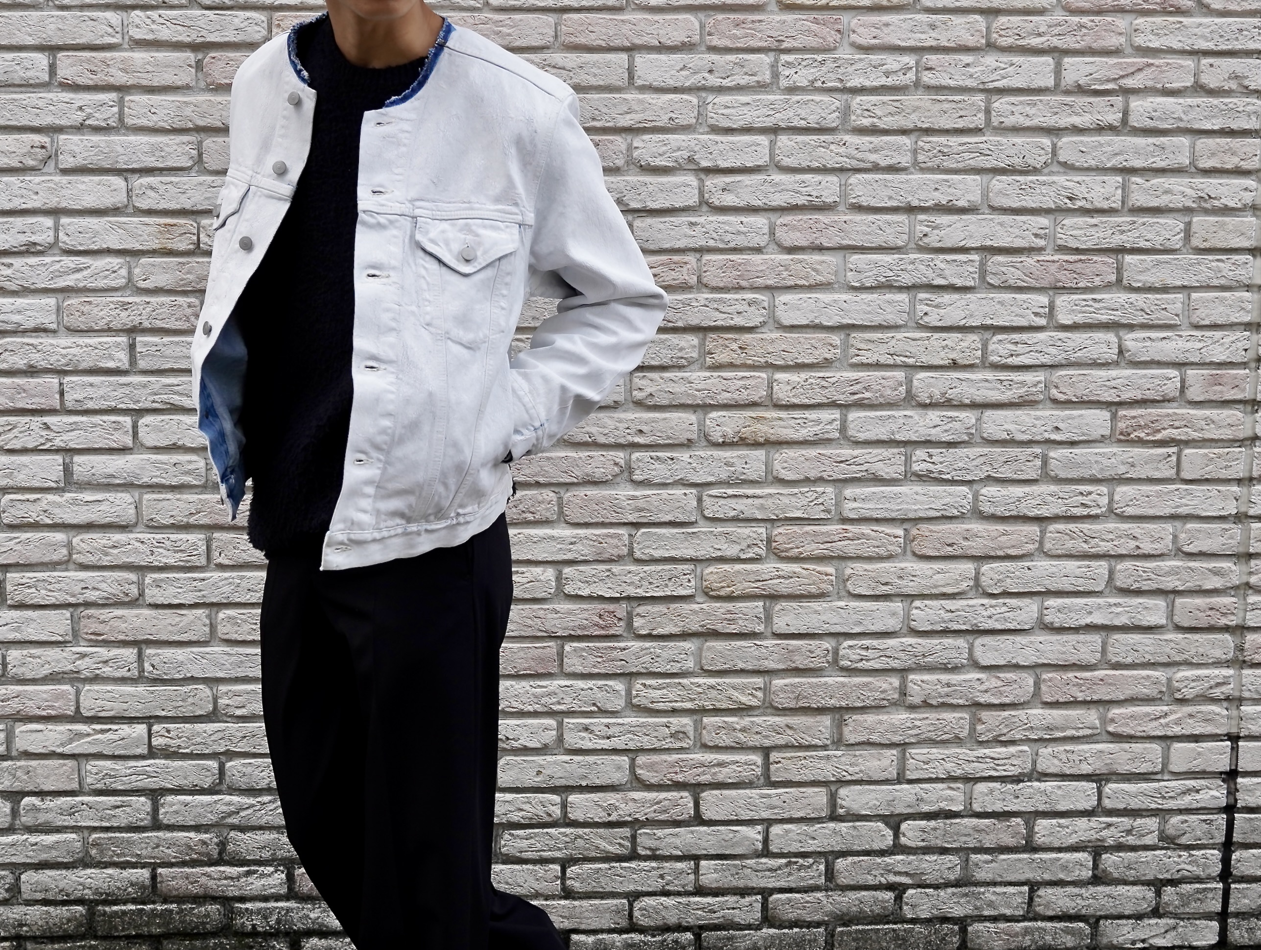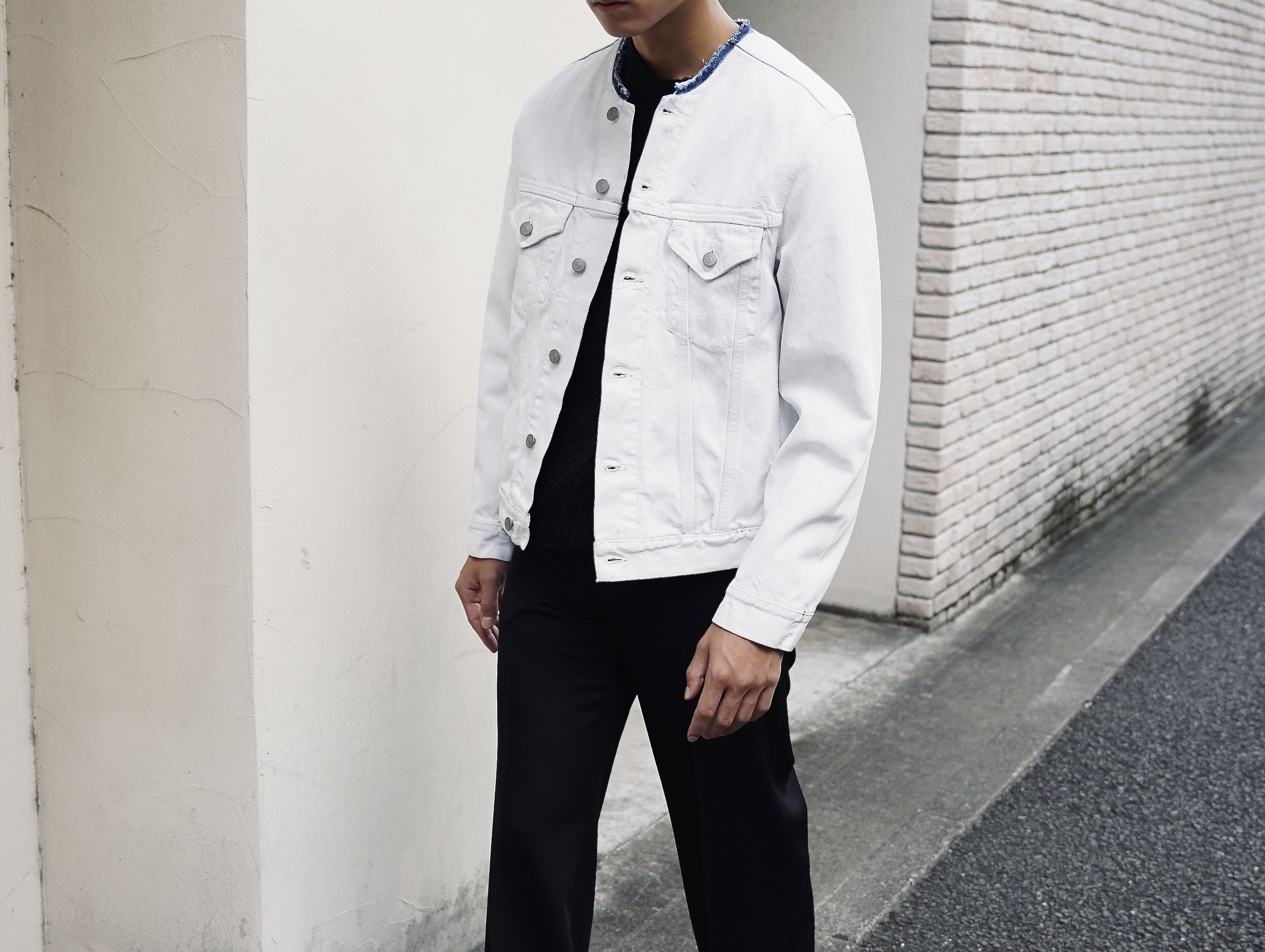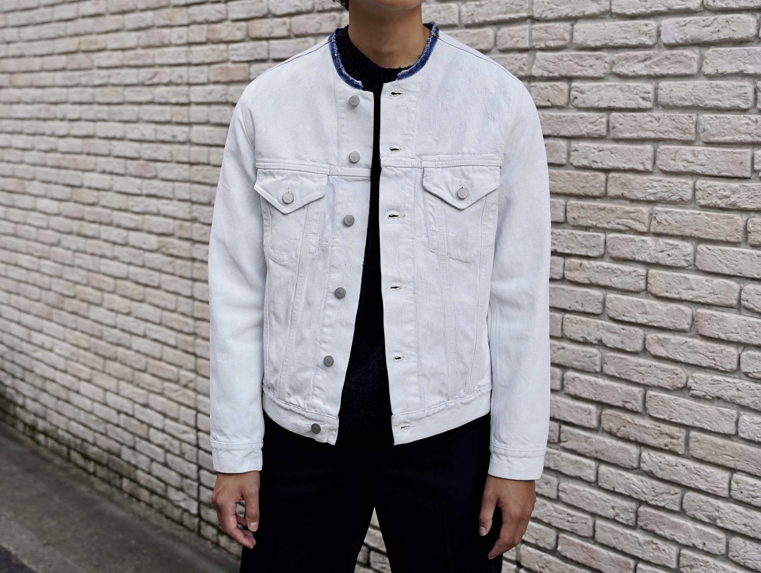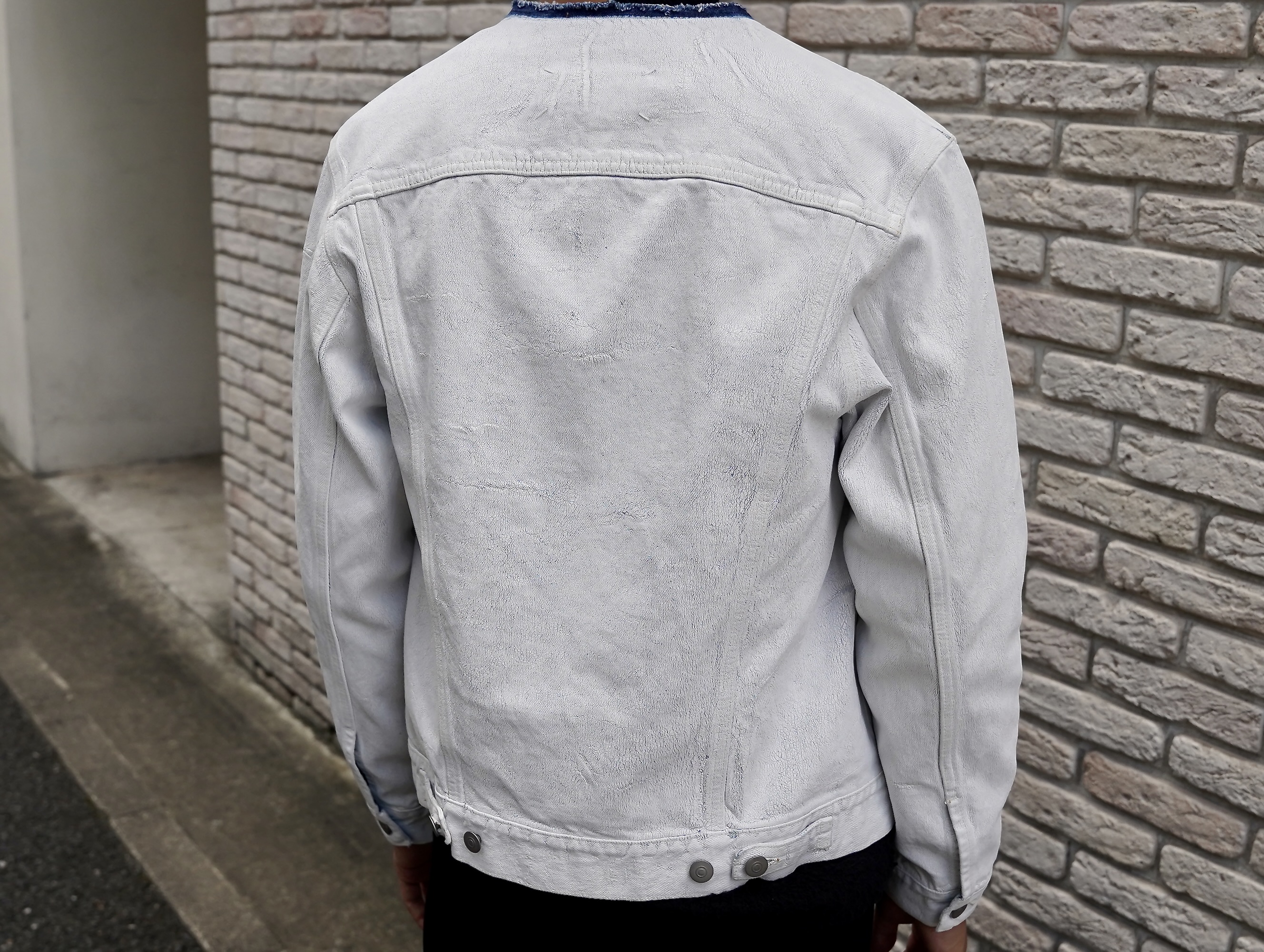 タイトフィットのカラーレスデニムジャケットに、ホワイトエフェクト加工(ペンキ加工)が施されています。