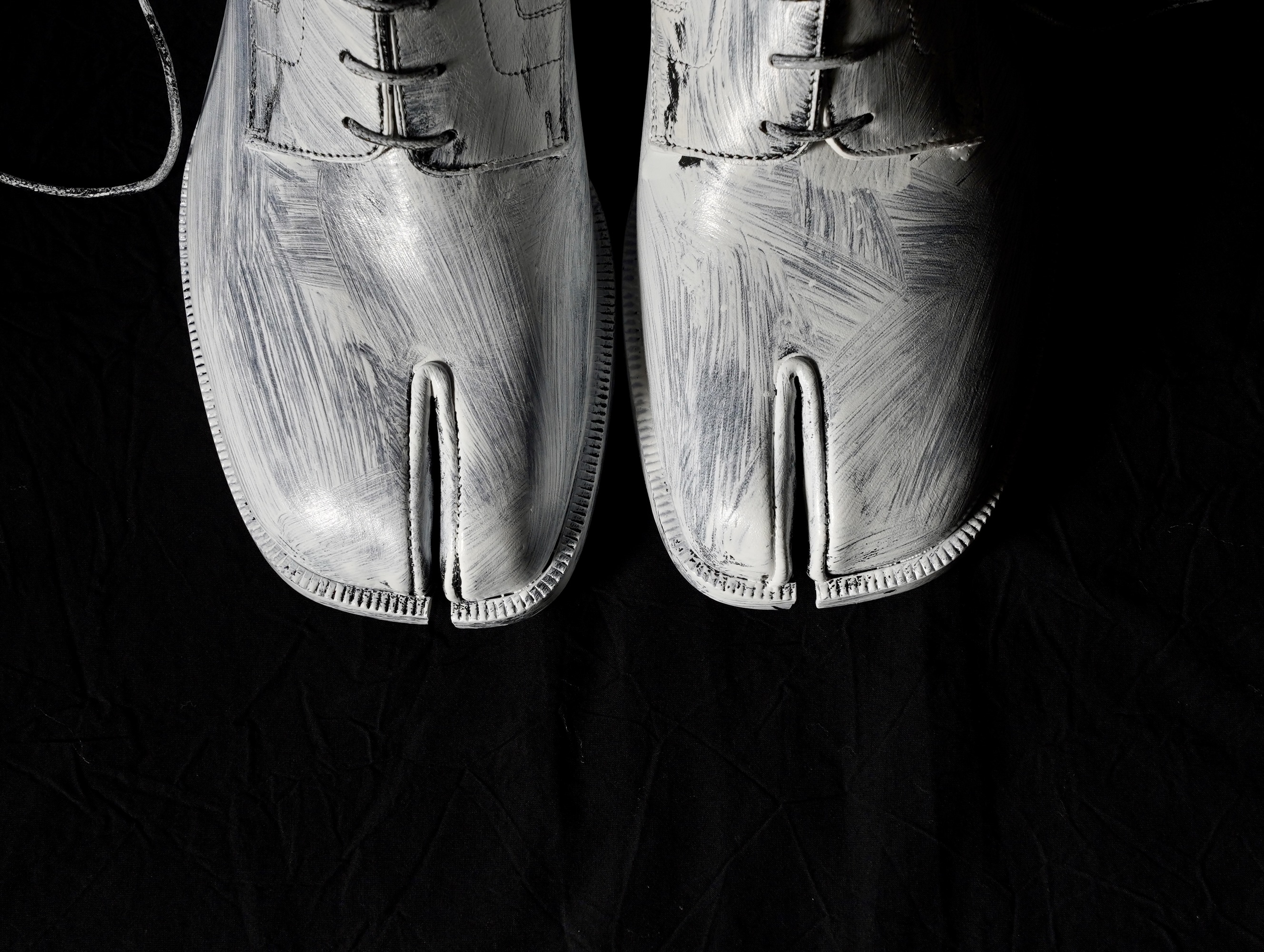 トラディショナルなレースアップシューズに、メゾンの アイコン的存在の 「タビ」 シューズのフォルムをかたどった デザインを加えています。