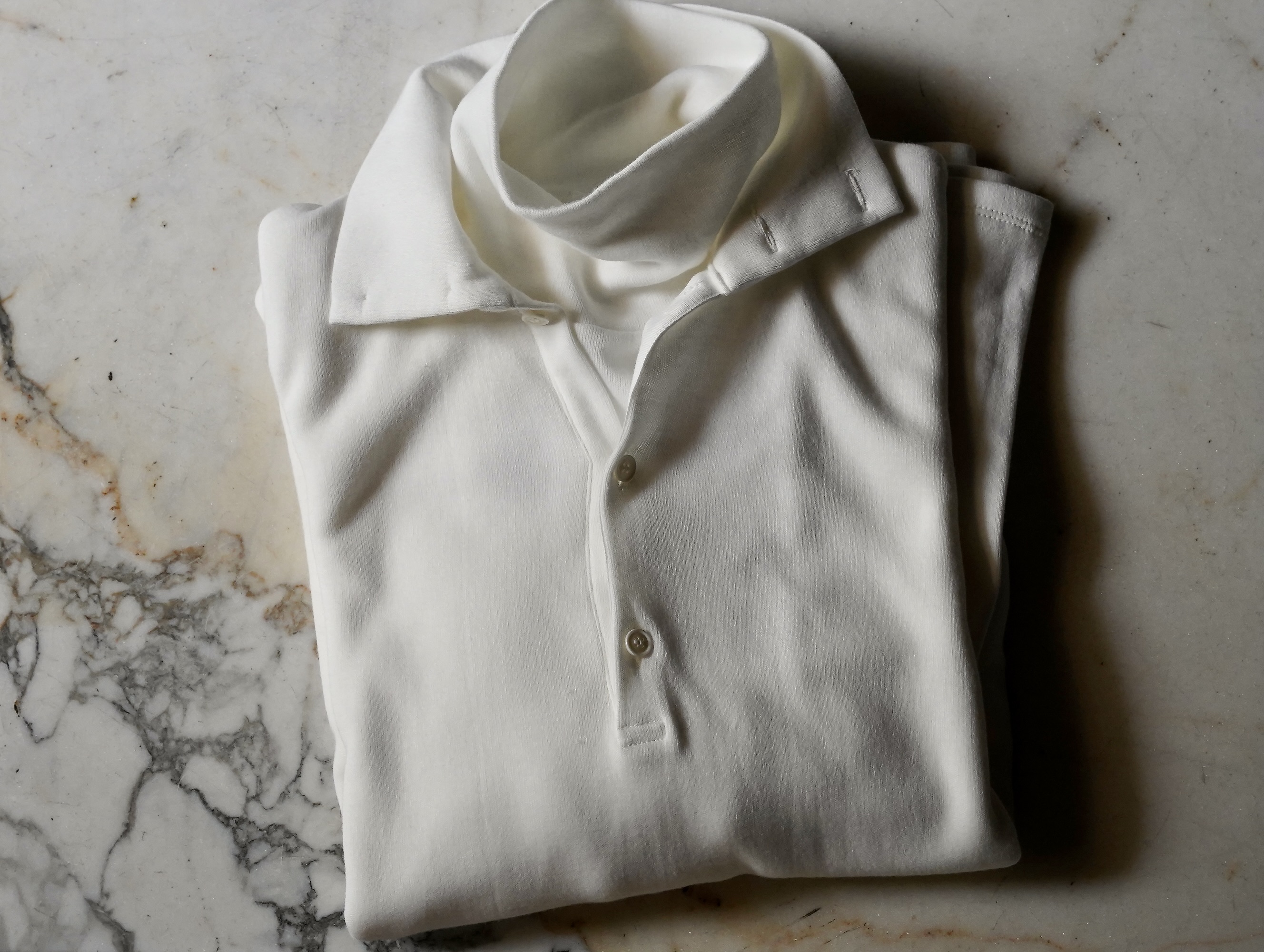 ハイネックとポロシャツを重ね着している様な襟のデザイン。