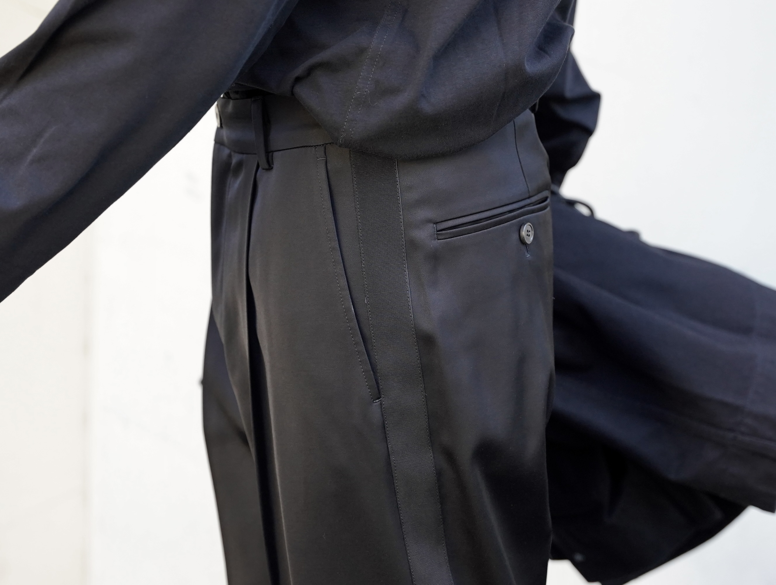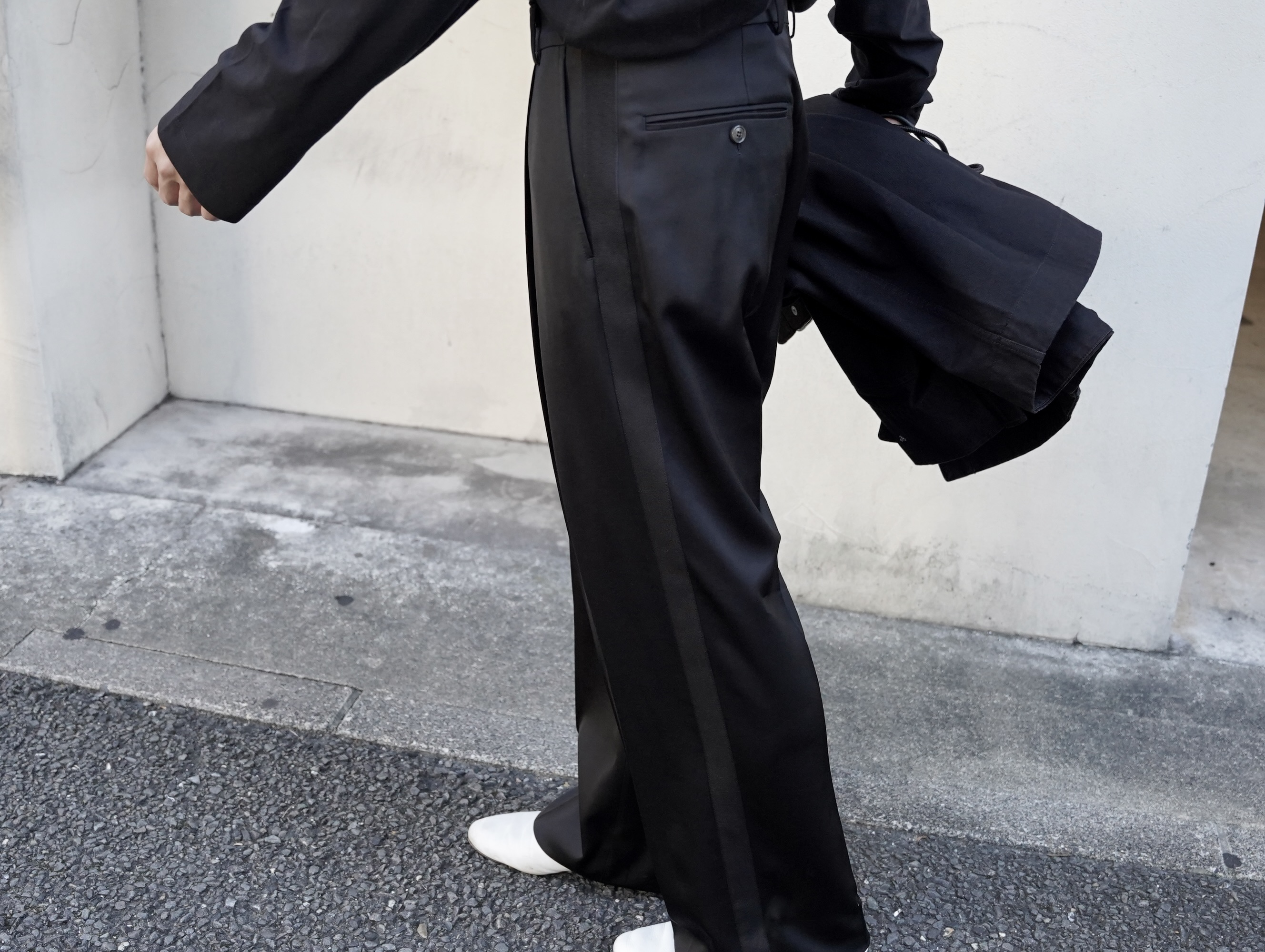 股上から裾にかけて真っ直ぐに落ちたワイドシルエットのタキシードパンツ。