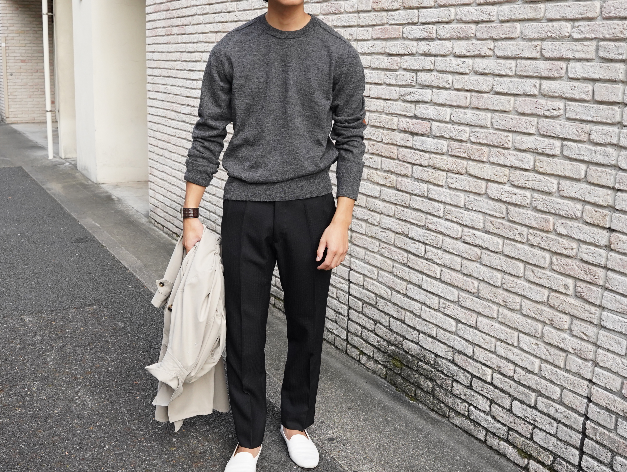 素朴なGrey Melangeとキャメルレザーの絶妙な配色です。