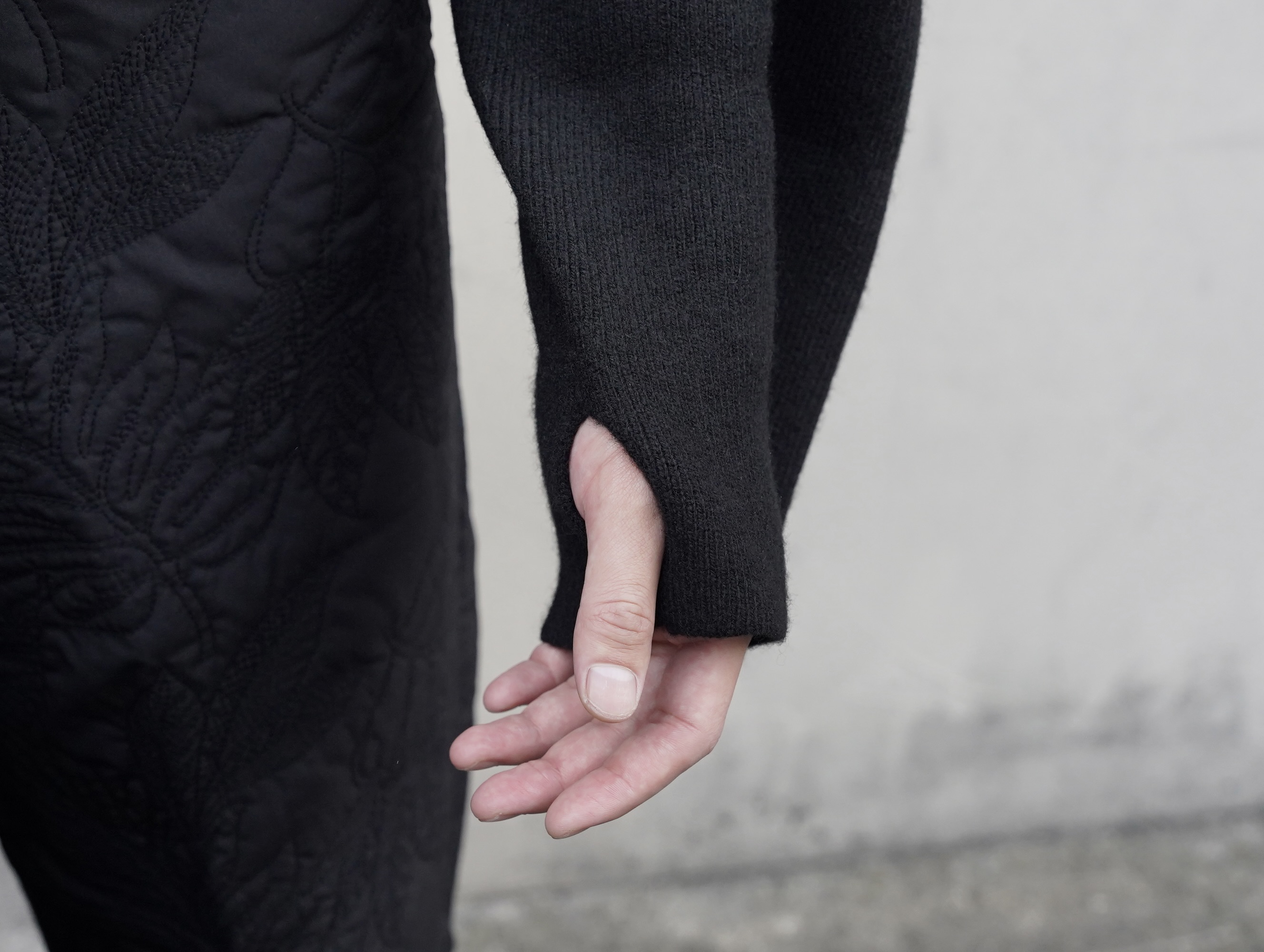 袖は指を通せるグローブ仕様になっています。カラーはブラックとダークネイビーをご用意しています。ユニセックス。