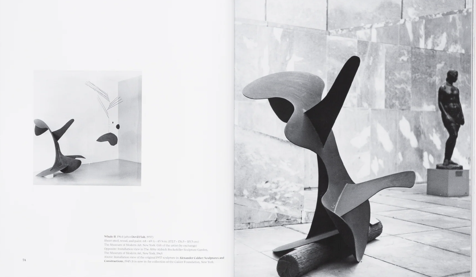 作者の作品が「ニューヨーク近代美術館」で初めて展覧されたのは、1930年の「Painting and Sculpture by Living Americans」展であった。その後数十年にわたり作者と美術館との繋がりは深く、実りがあり、お互いに助けとなるものであった。作者は、同美術館の初代館長であるアルフレッド・H・バー・ジュニア(Alfred H. Barr Jr.)、1943年の大規模回顧展の際にコラボレートした美術史家でありキュレーターのジェームス・ジョンソン・スウィーニー(James Johnson Sweeney)をはじめとした名の知れた面々と友情を育み、協力関係を築いた。作者の作品は、その素材やコンセプトの革新性だけでなく、重要な場面場面における存在感を振り返っても、同美術館の初期の歴史に深く刻まれている。例えば、フィリップ・L・グッドウィン(Philip L. Goodwin)とエドワード・ダレル・ストーン(Edward D. Stone)のデザインにより大型美術館としてリニューアルオープンした際にロビーの大階段に飾られたモビール(現在も飾られている「Lobster Trap and Fish Tail」)、周年記念イベントを祝して、テーブルを飾った精巧な燭台、象徴的な展覧会「キュビズムと抽象芸術(Cubism and Abstract Art)」展を宣伝すべく旗竿から飛ばした彫刻作品などが挙げられる。