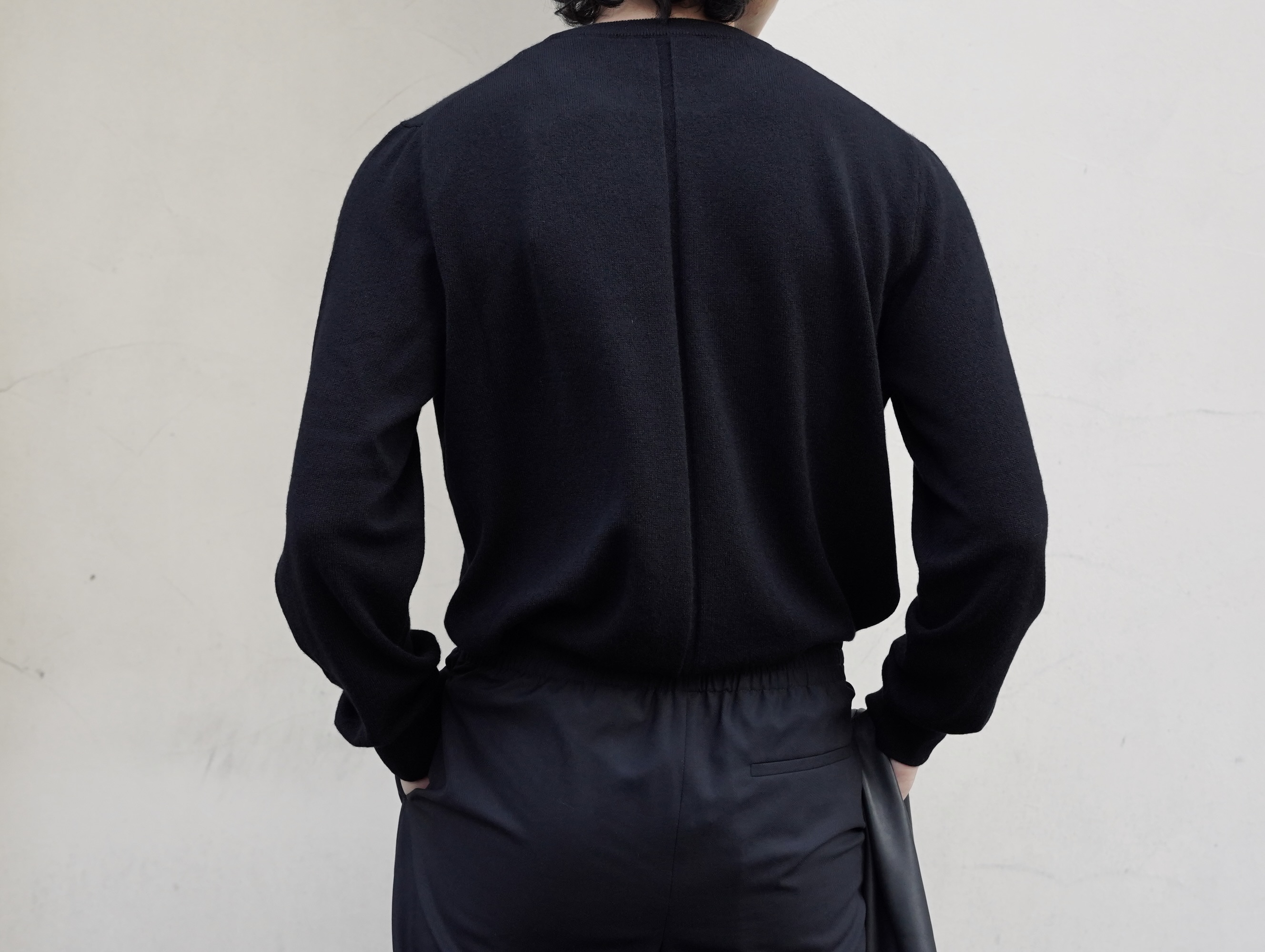 ネックライン、袖口、裾のリブ編み、シグネチャーのセンターバックディテール。