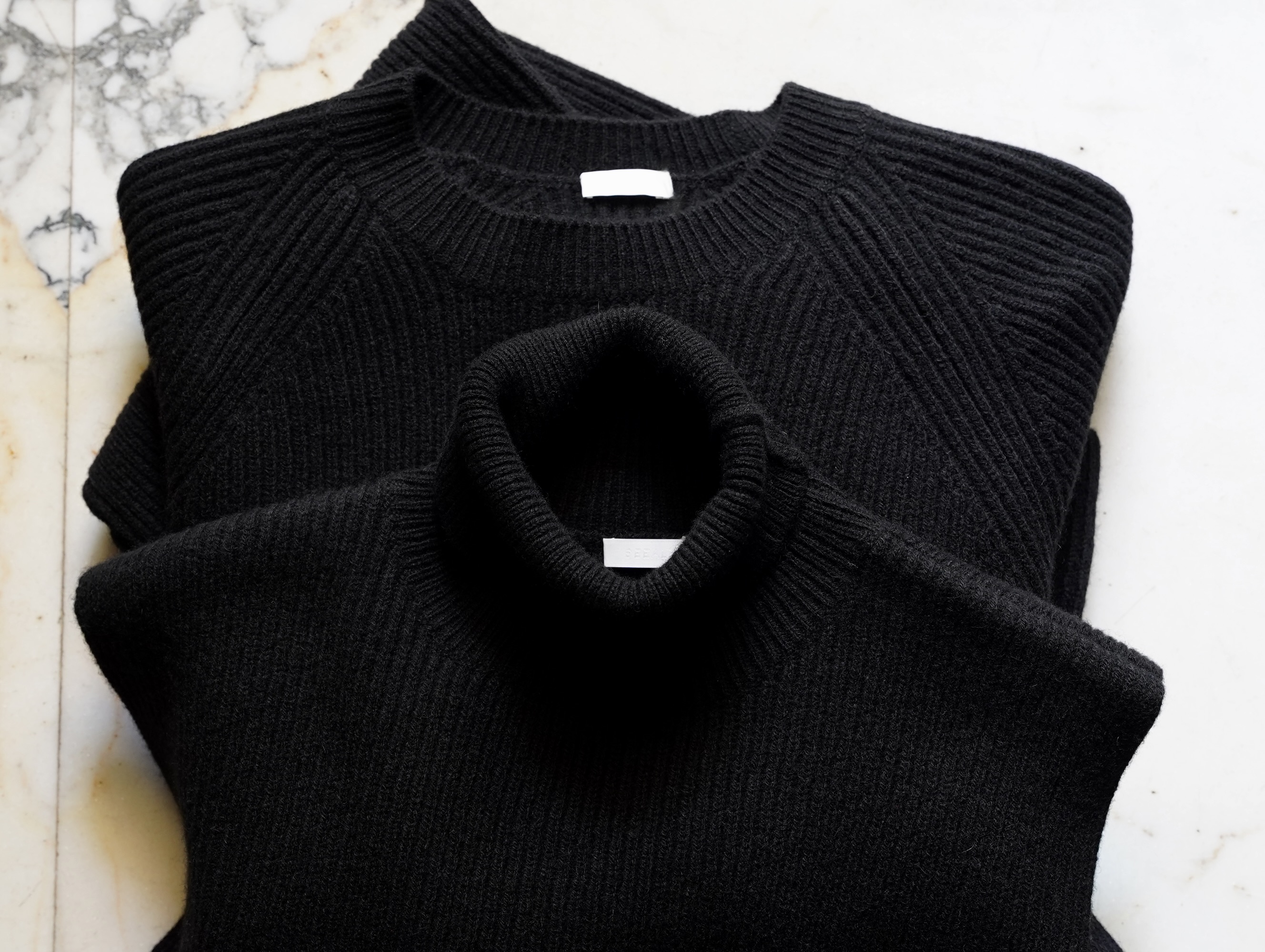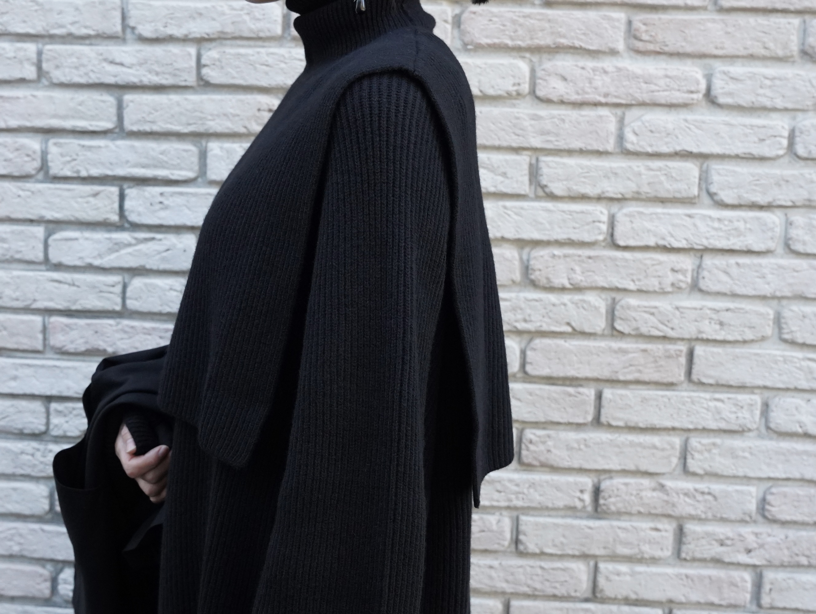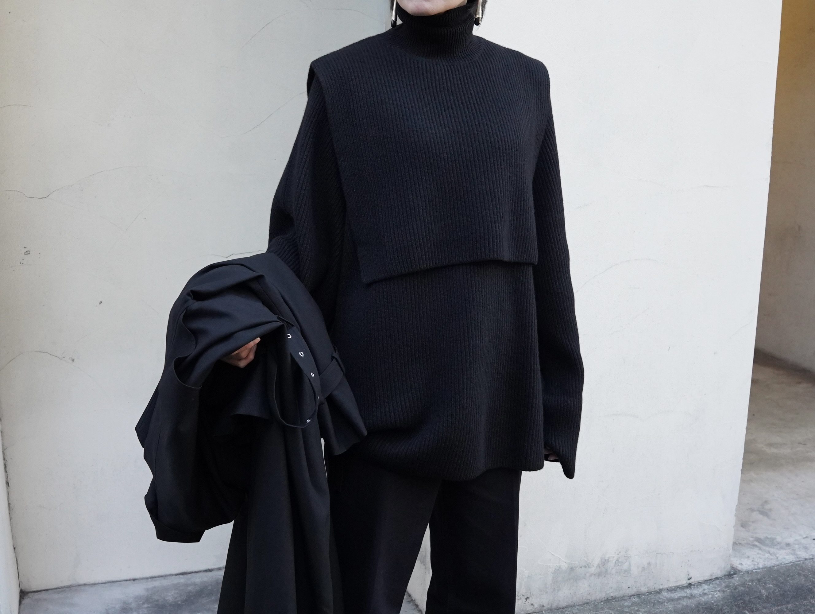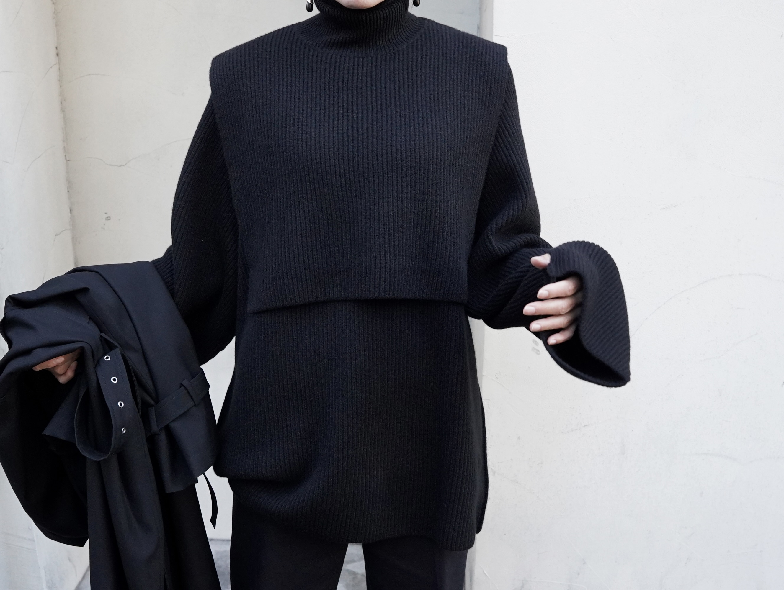 ダイナミックなオーバーニットとハイネックベストをミックスしたニット。