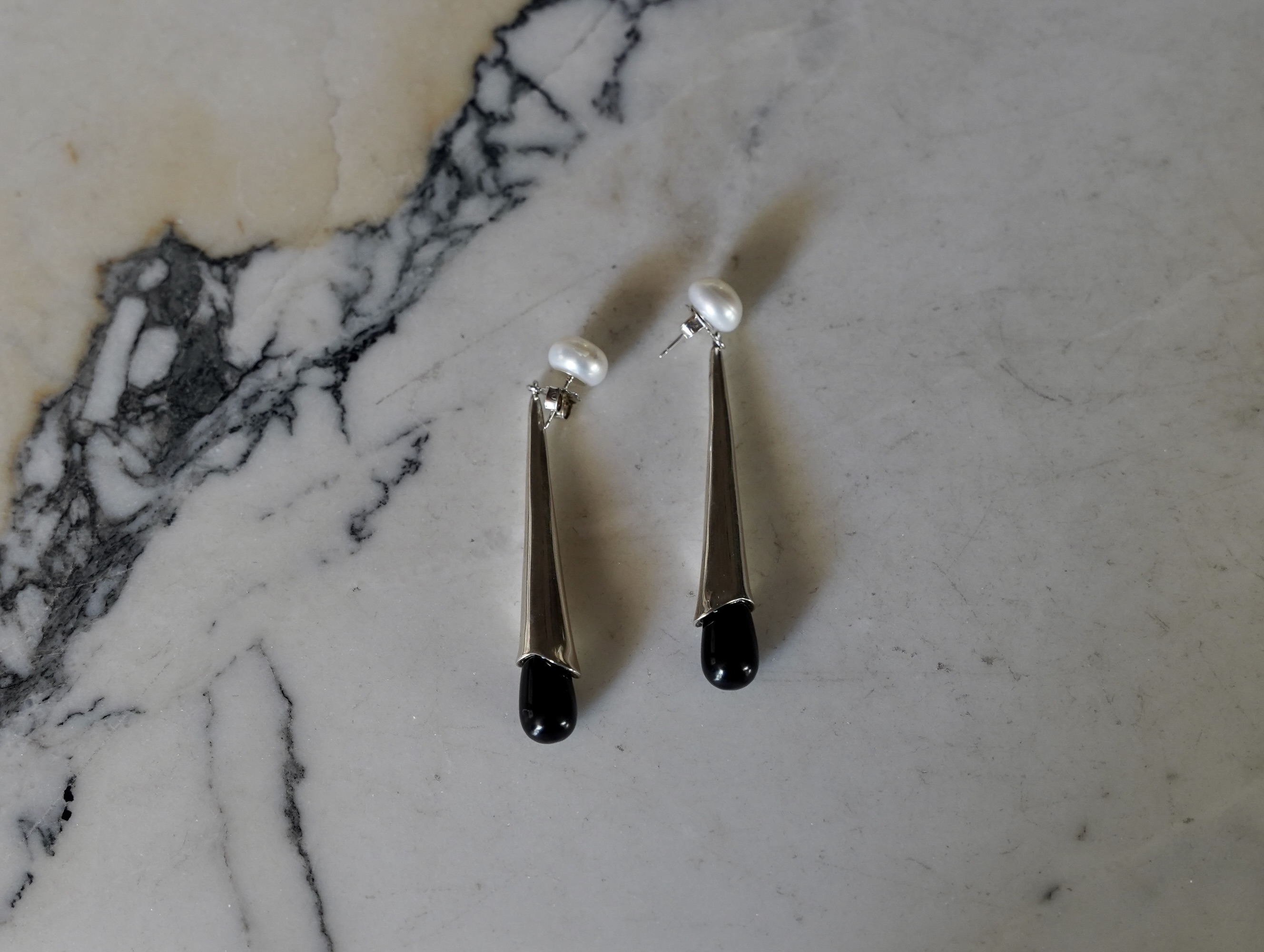 見事な淡水パールのトップとオニキスのドロップが秀逸なデザイン。