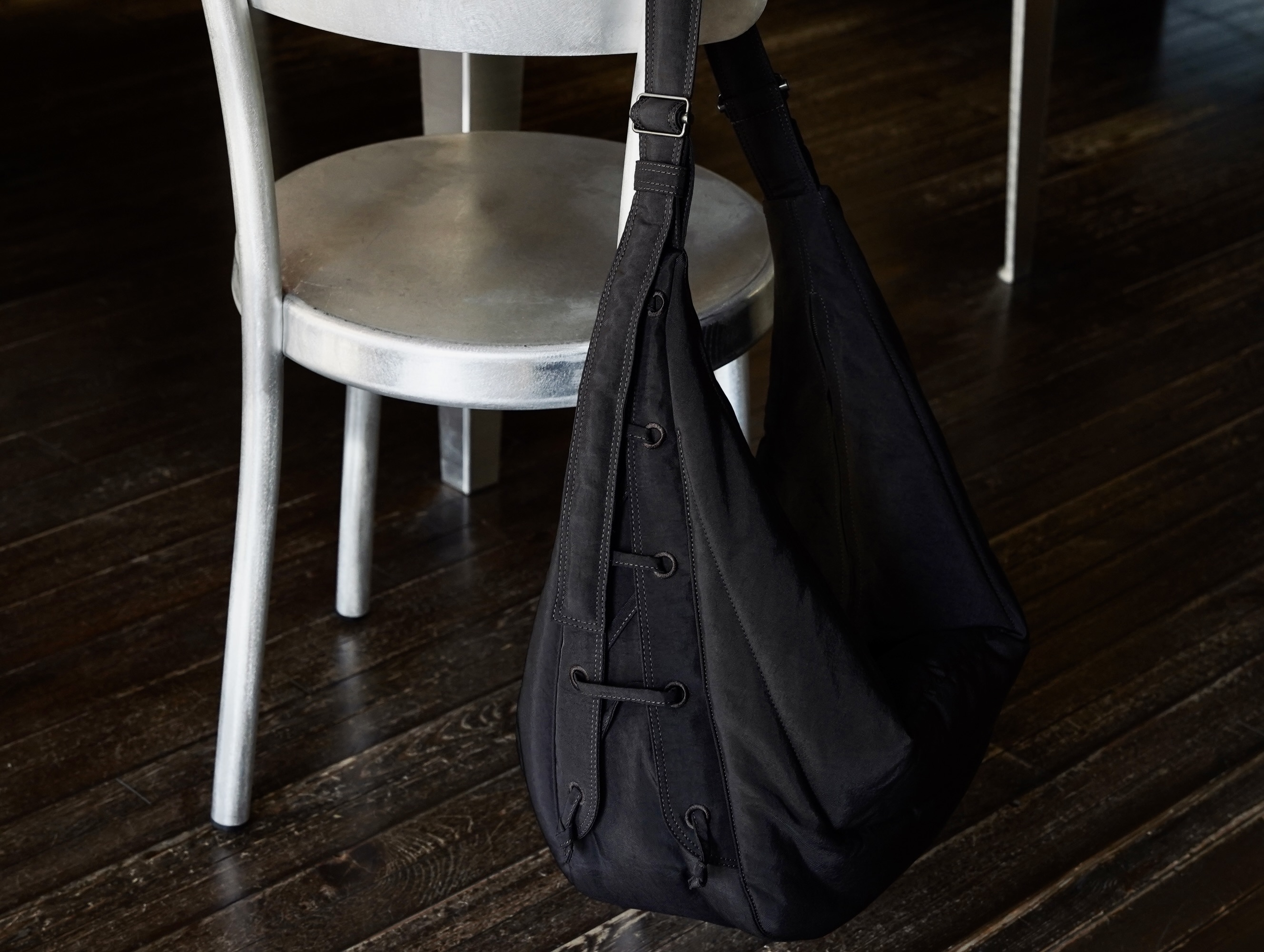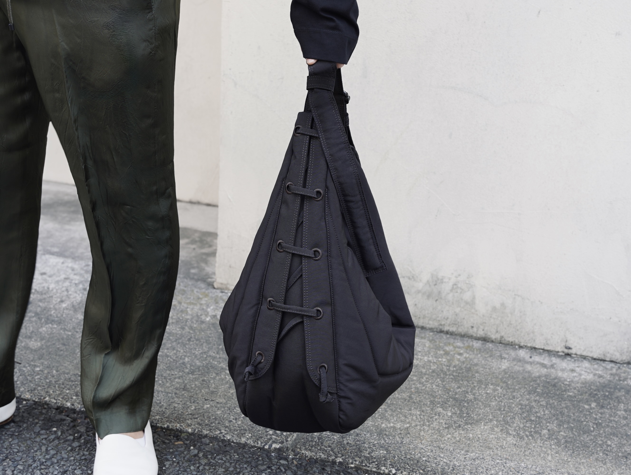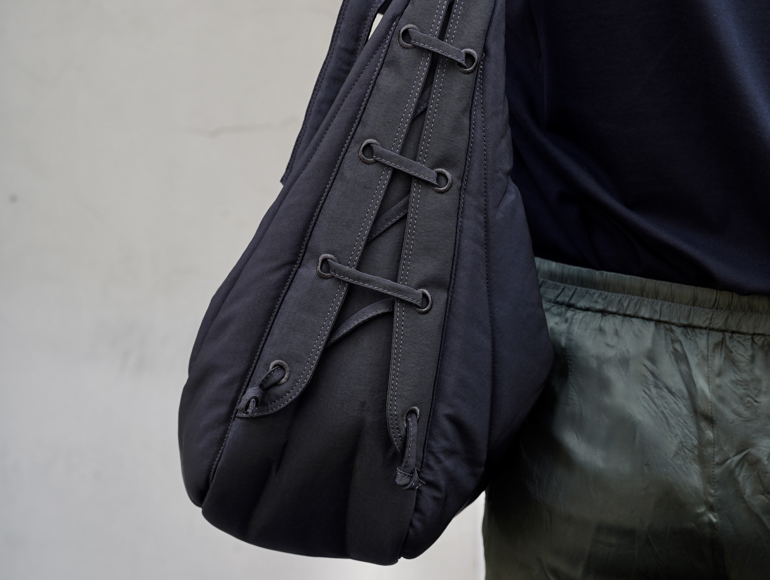 バッグの両側には刺繍入りのアイレットとレースアップディテールが施されており、ボリュームの調整も可能です。