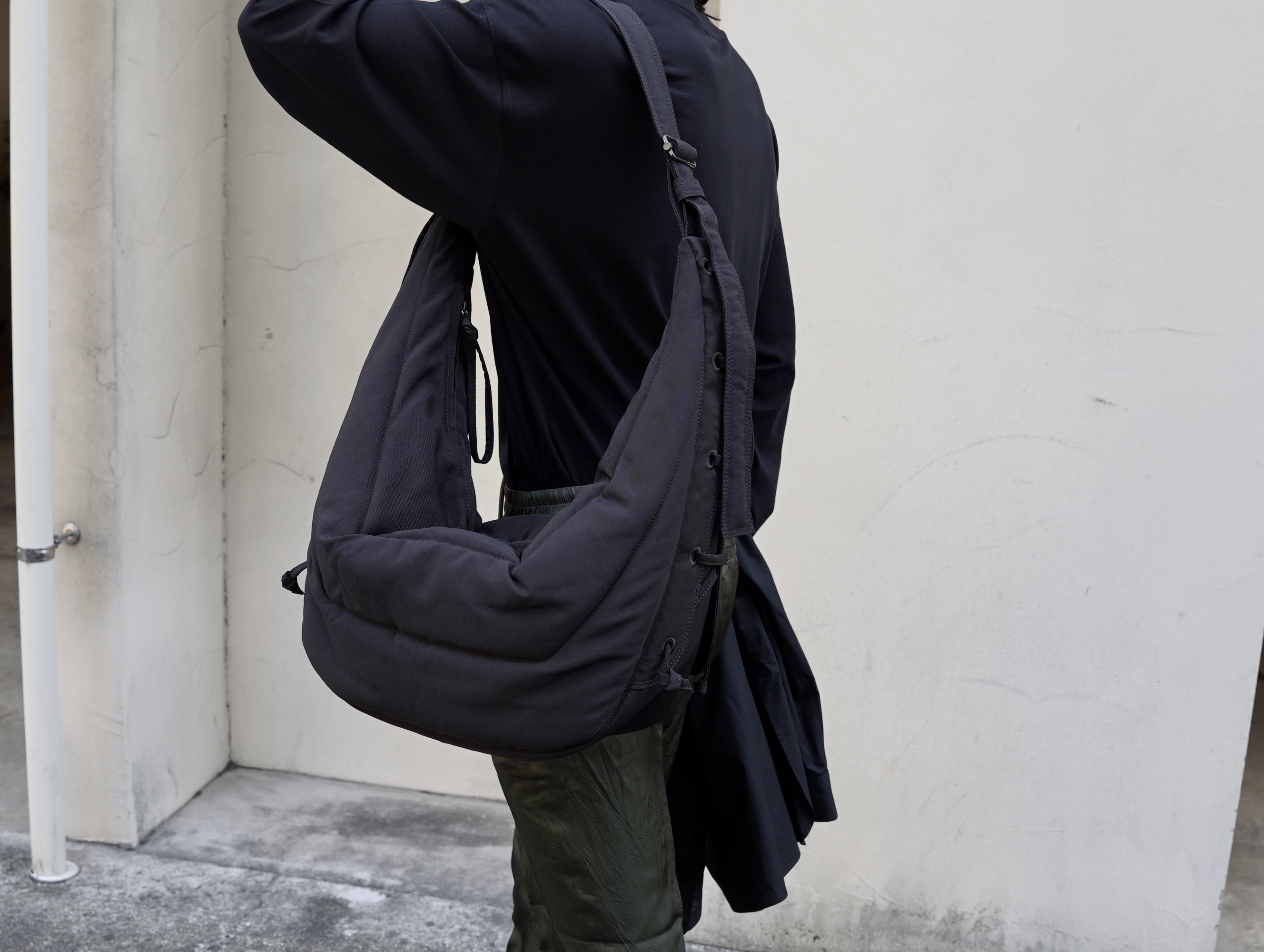 クロワッサンバッグの形をベースにパテッドを巧みに使い、機能的なバッグへと消化しています。