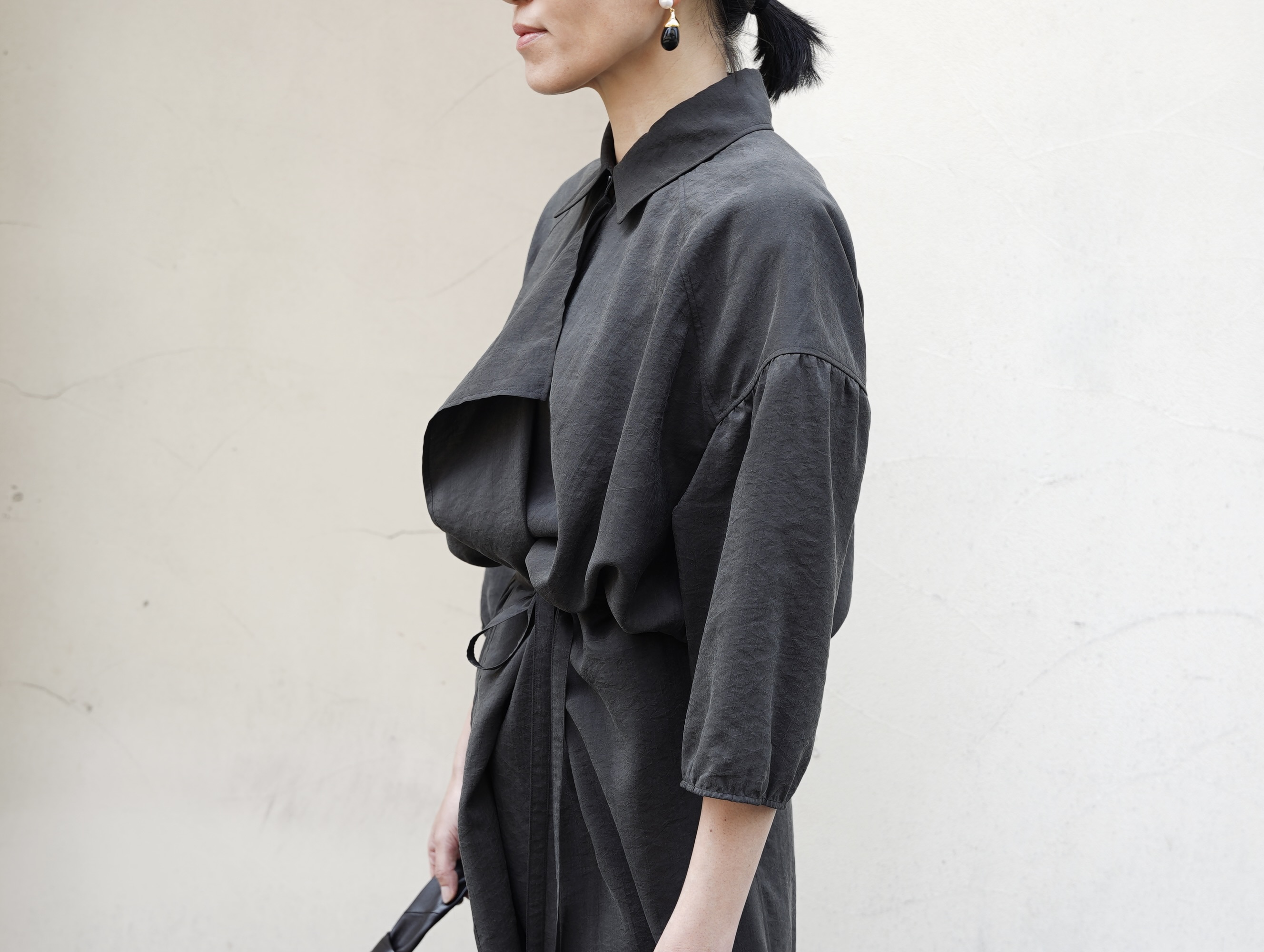 ワイドカットのシルエットわずかにギャザーの入った袖によって引き締められ、ドロップショルダーが自然なボリューム感を演出。フロントには、優雅なドレープを描くアシンメトリーなフラップと、それを際立たせるコントラストの効いたボックスプリーツが施されています。