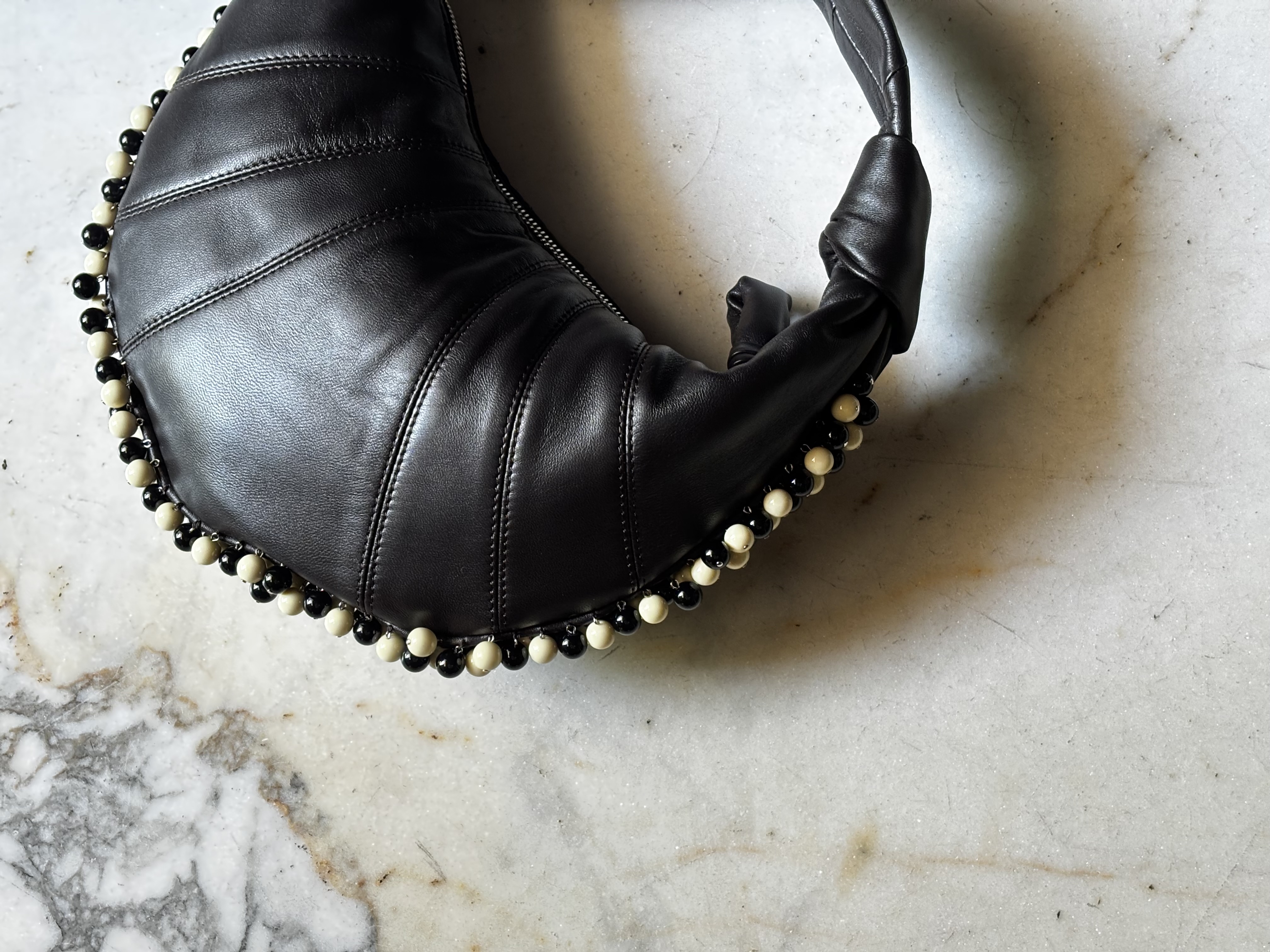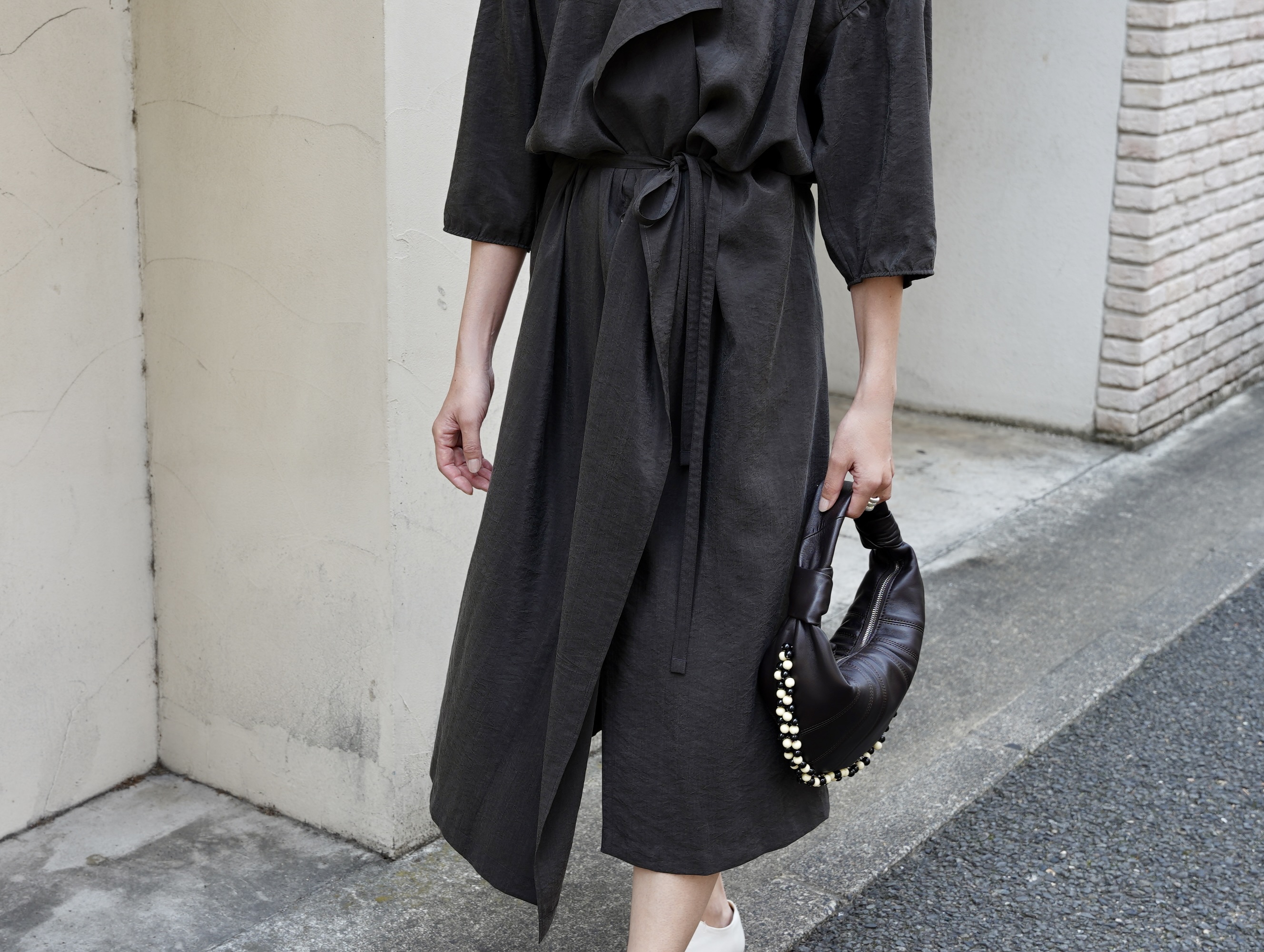 表面に刺繍されたビーズの装飾がミニマルな世界観の上品なアクセントに。