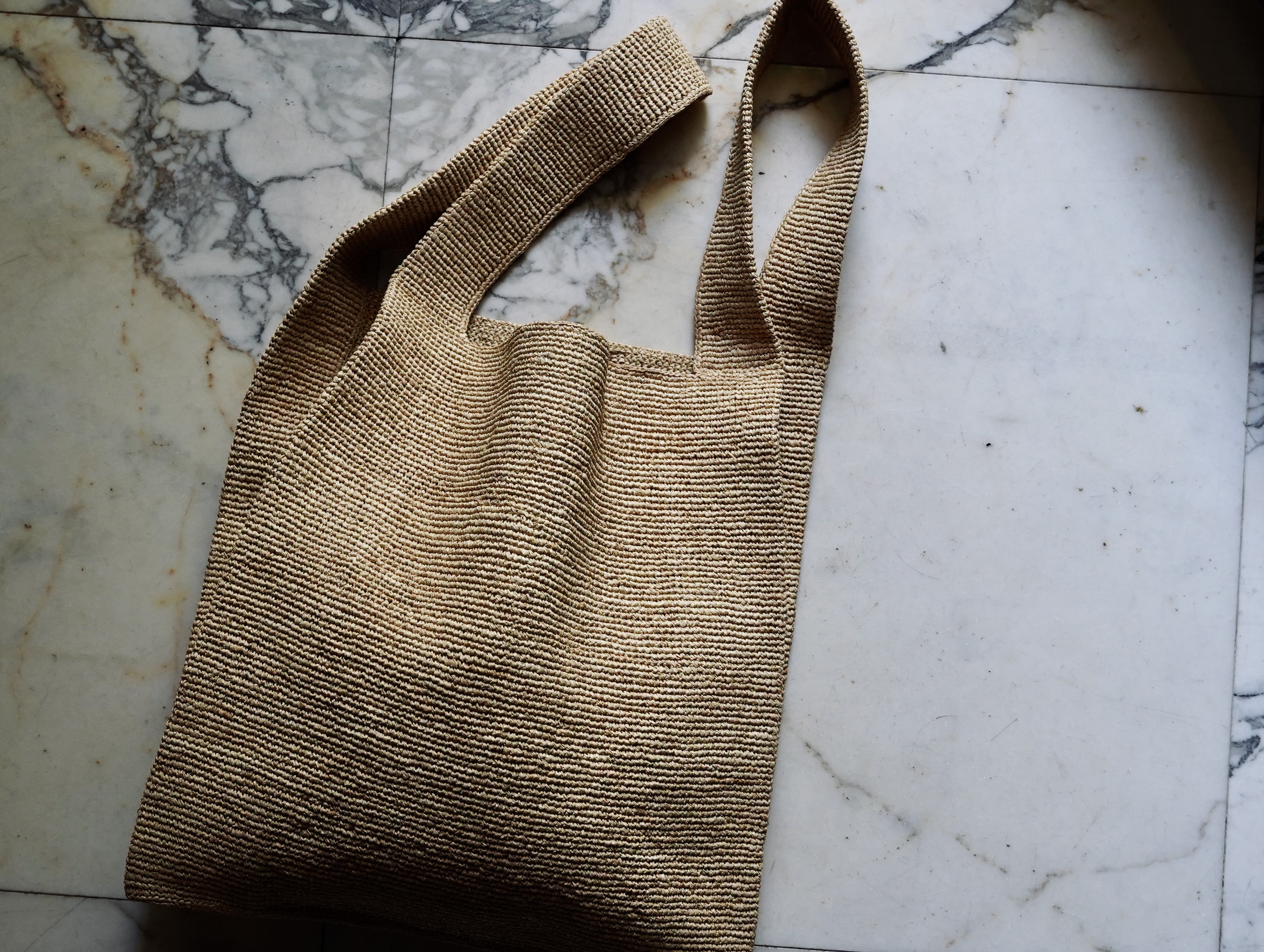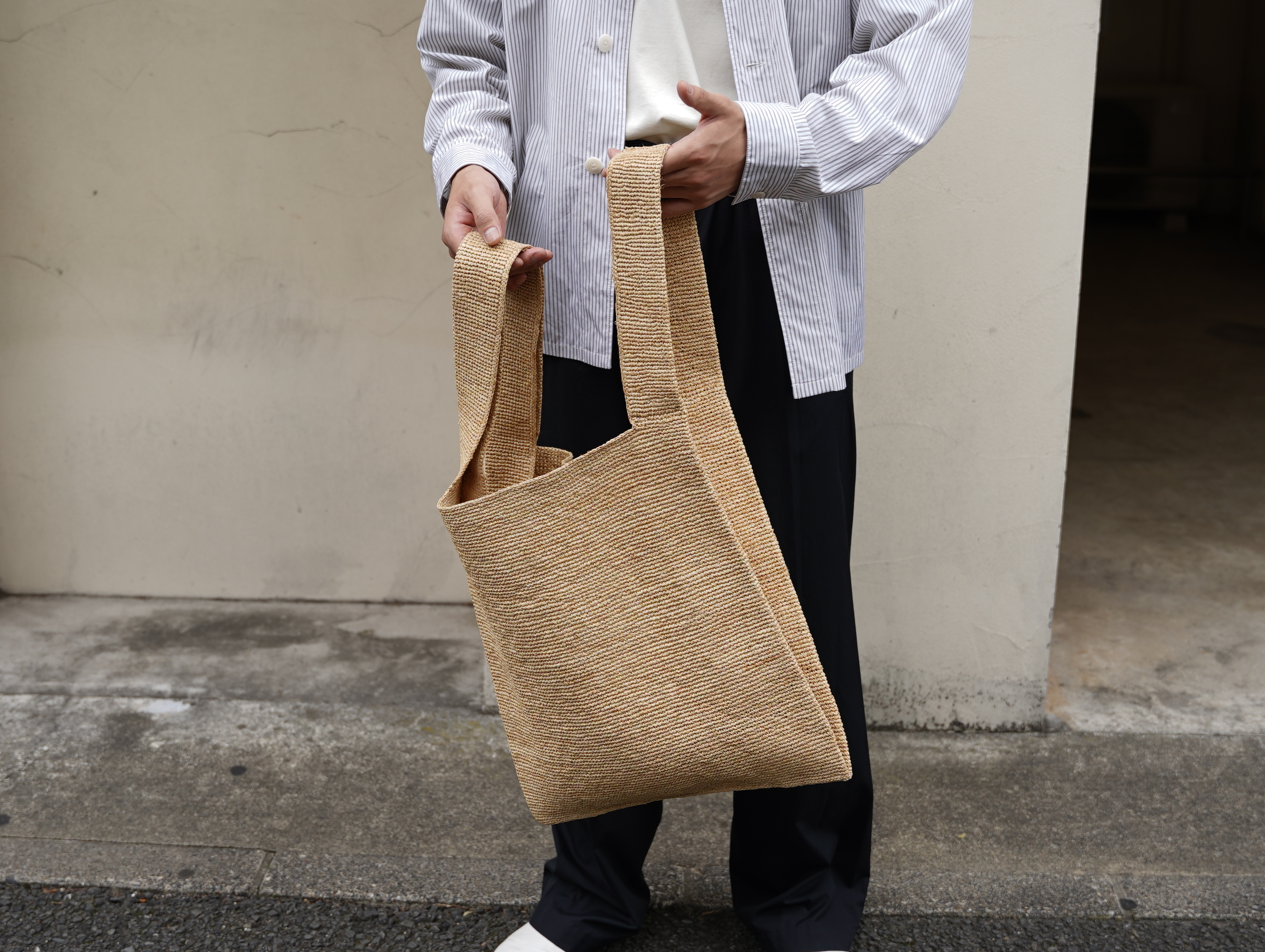 ラフィア椰子の葉を加工した天然素材である”RAFFIA”を使用したショッピングバッグ。