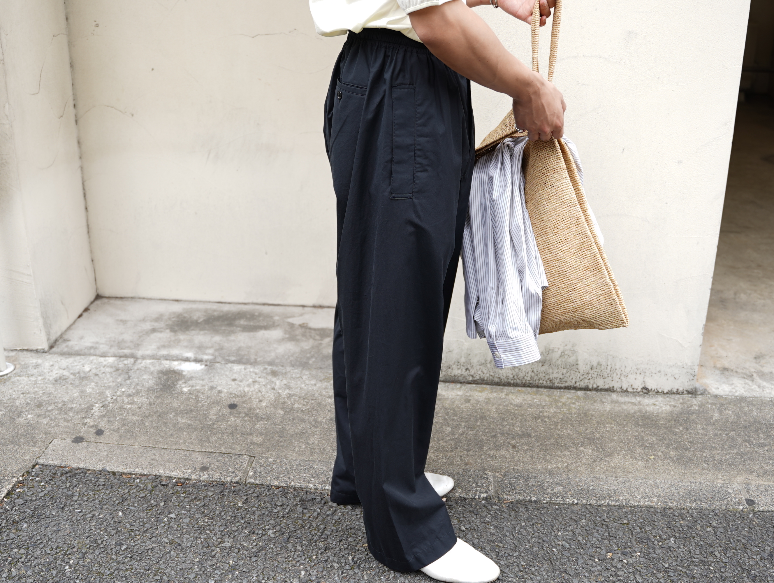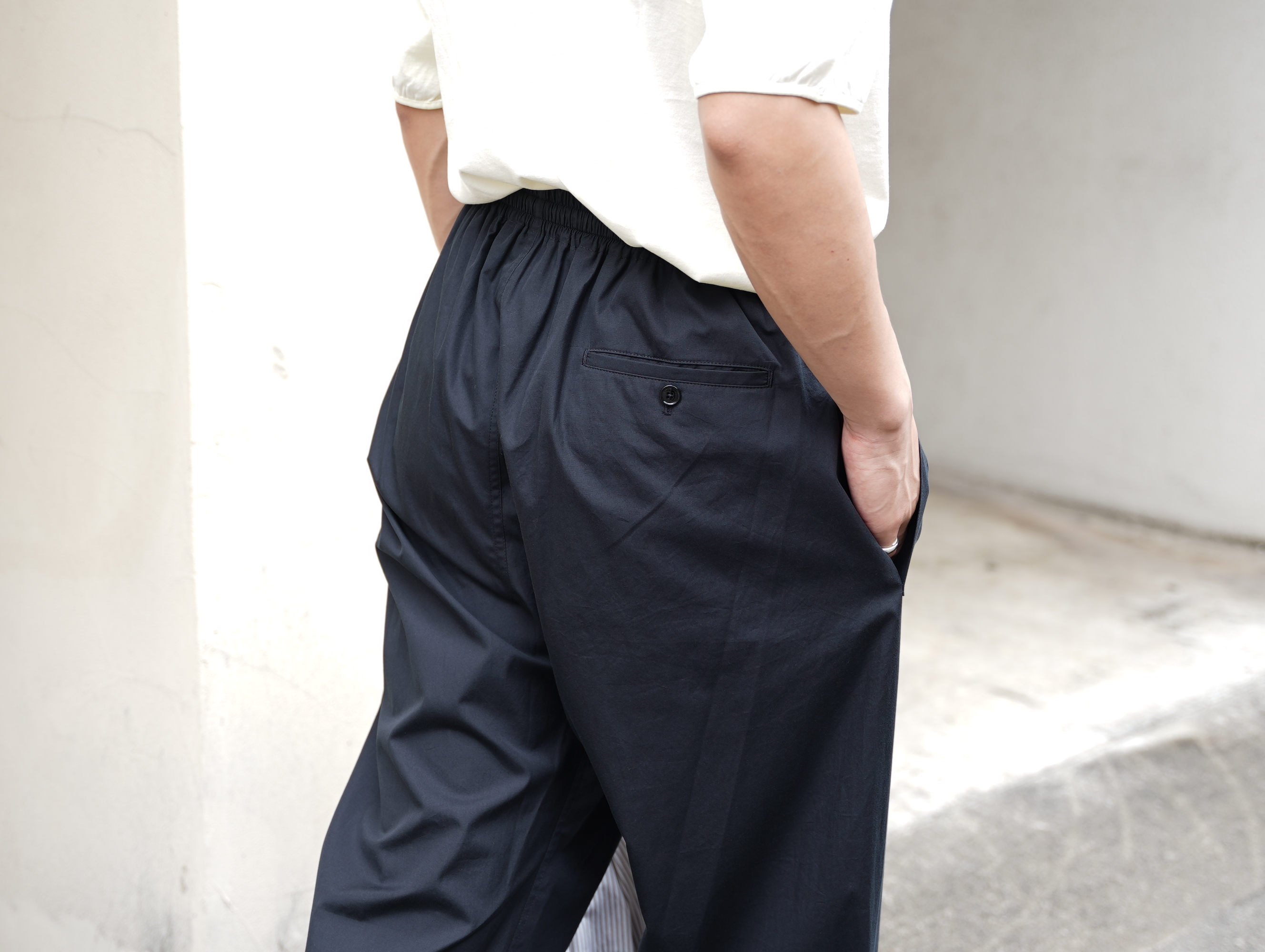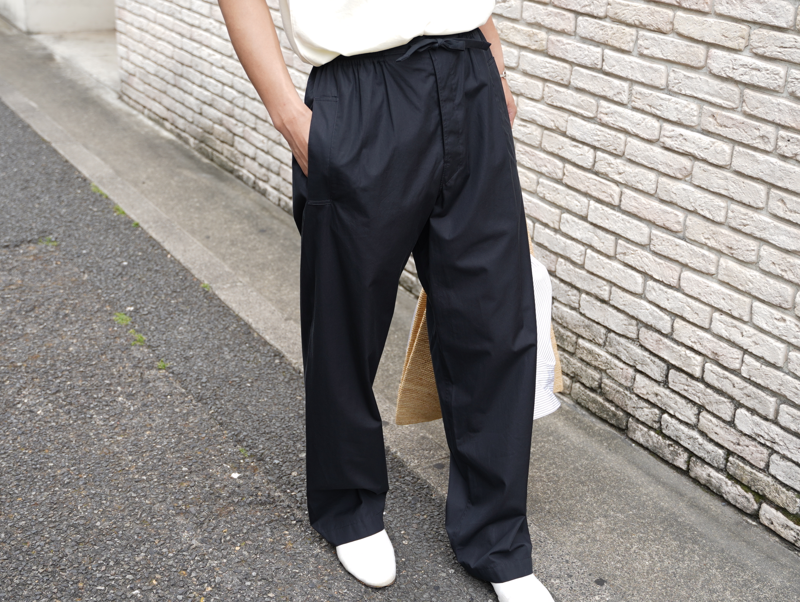 ウォッシュドコットンポプリンは履きやすさと形を保つ張り感を合わせ持ちます。カラーはCAVIAR(キャビア)。