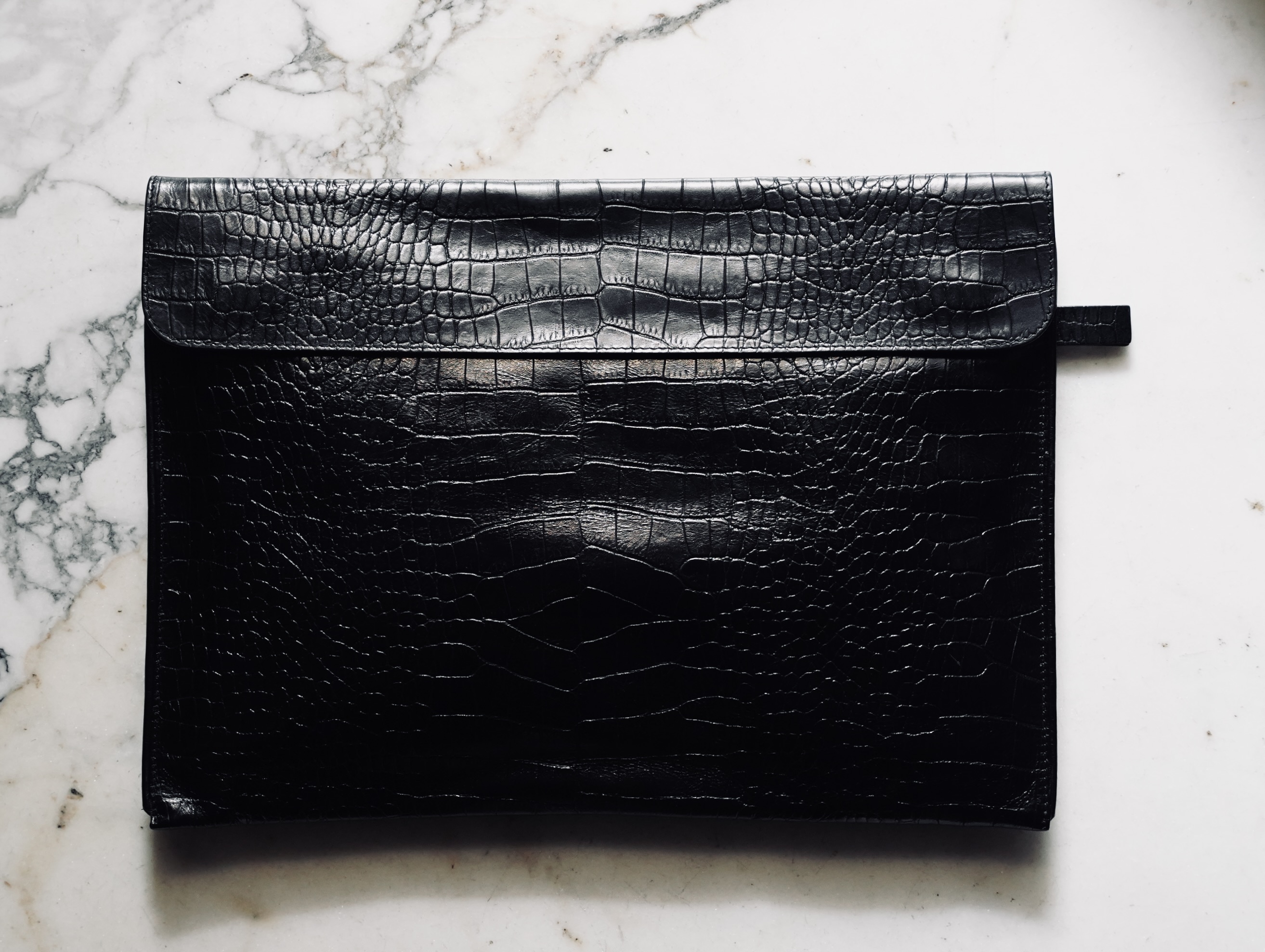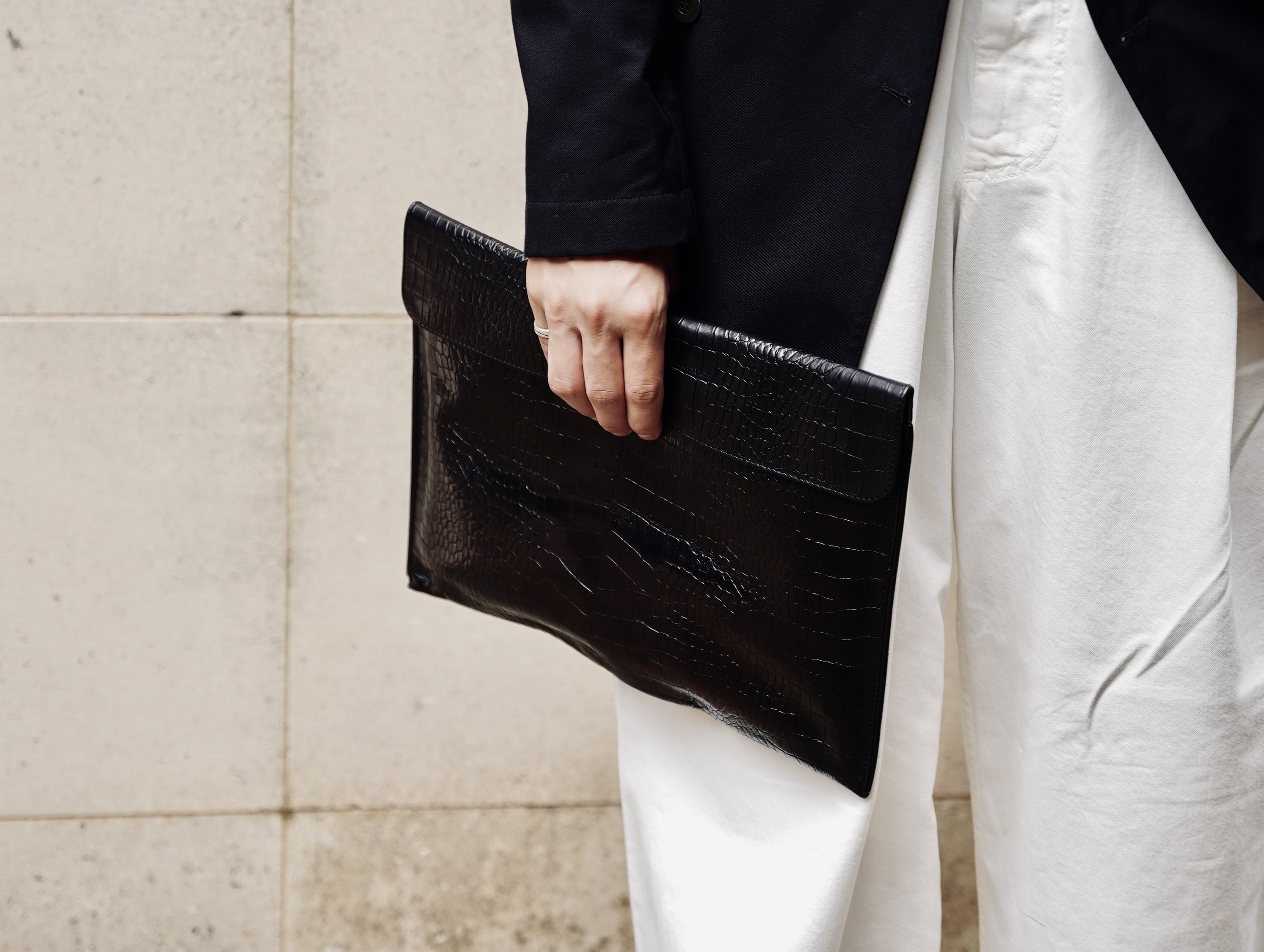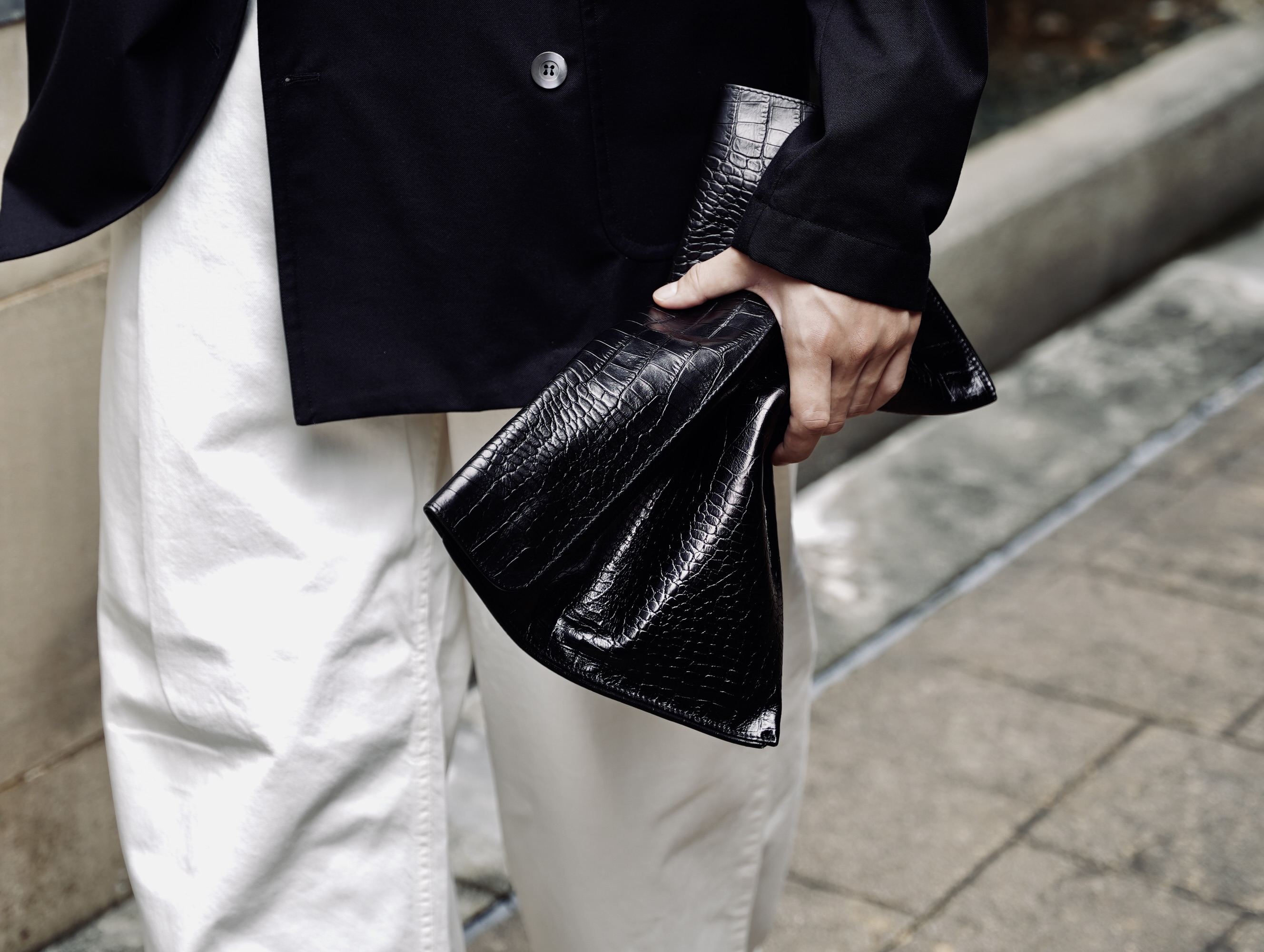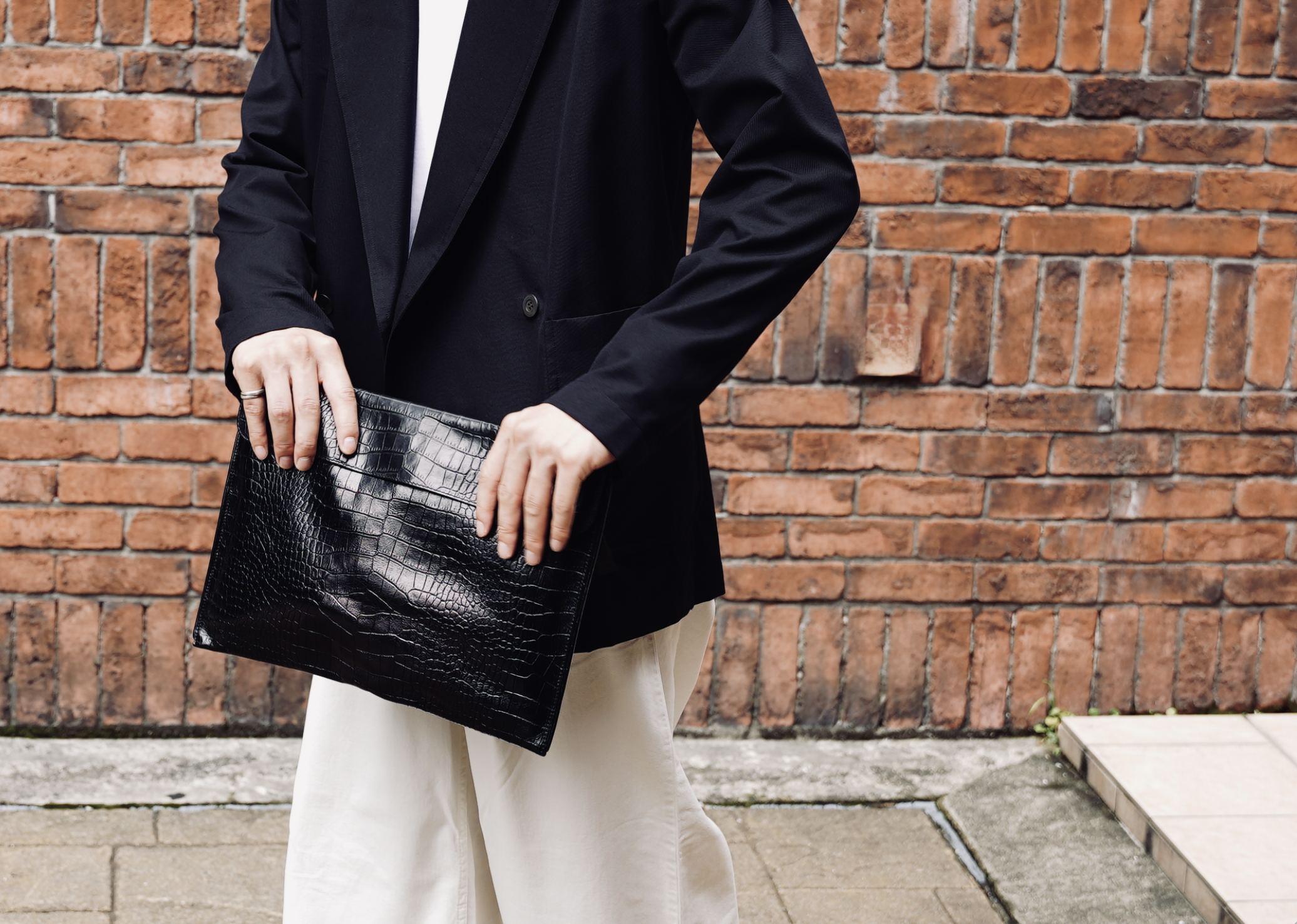 クロコダイルの型押しが施されたクラッチバッグは着こなしにシックでラグジュアリーなムードを添えます。