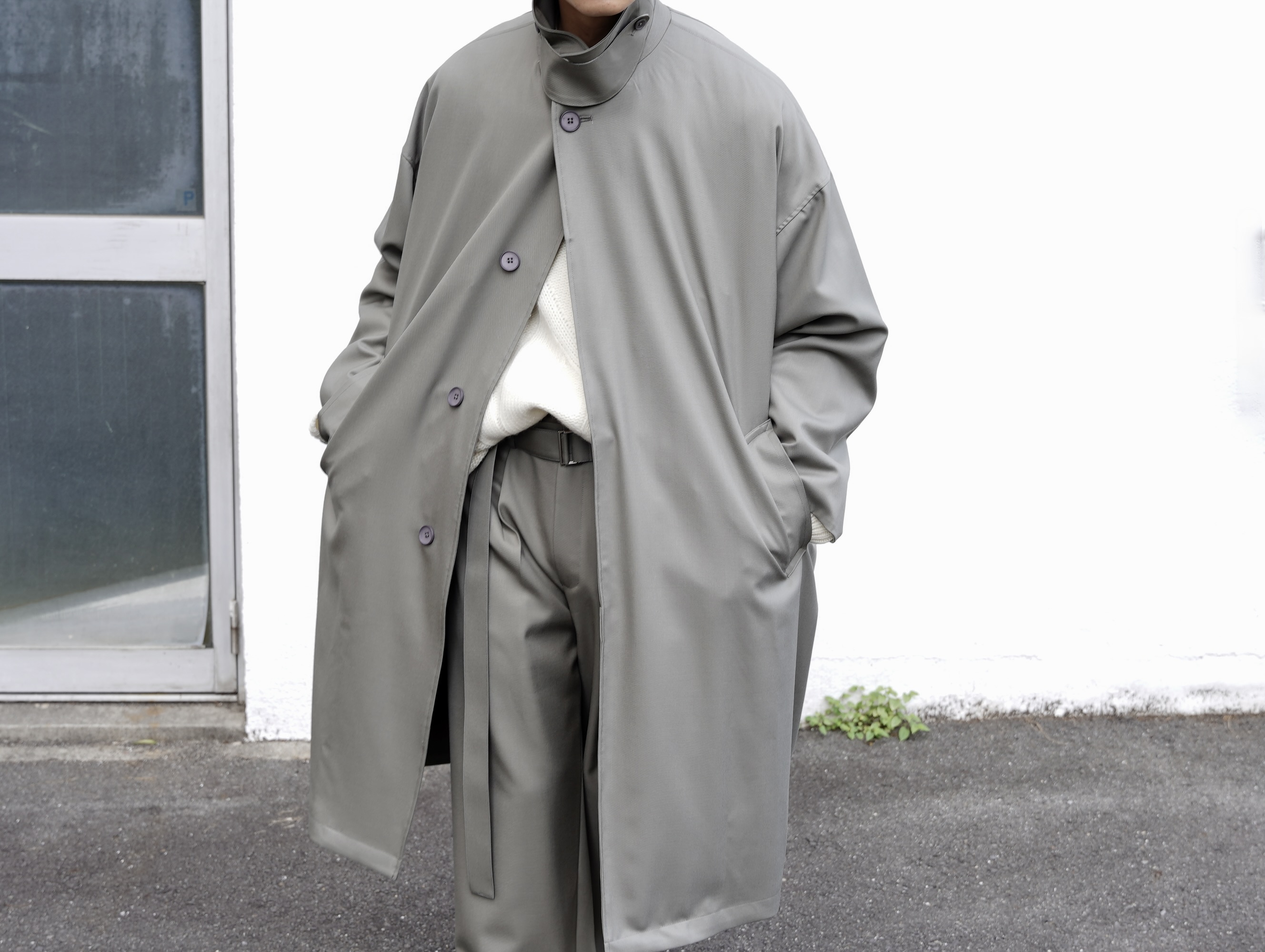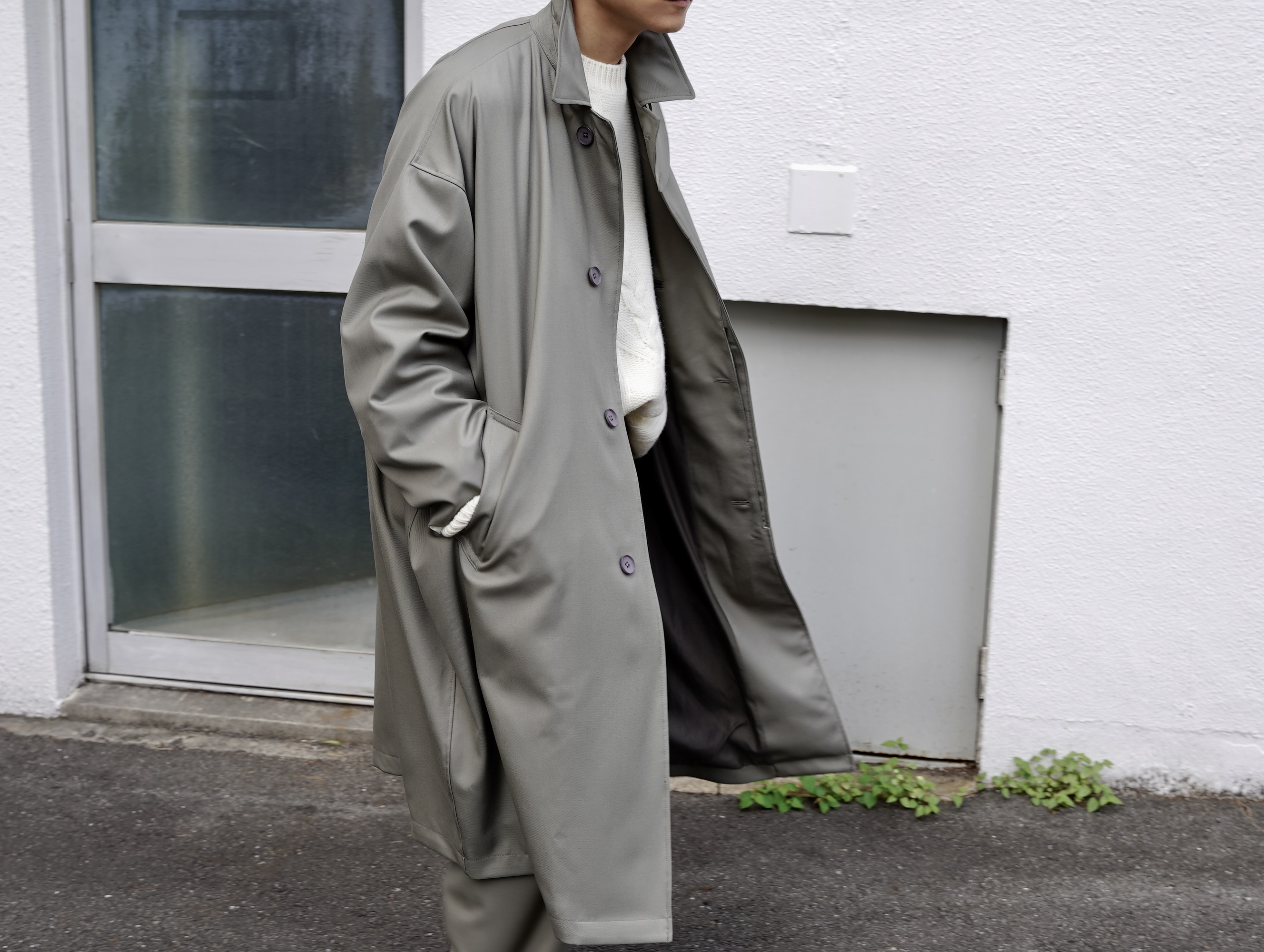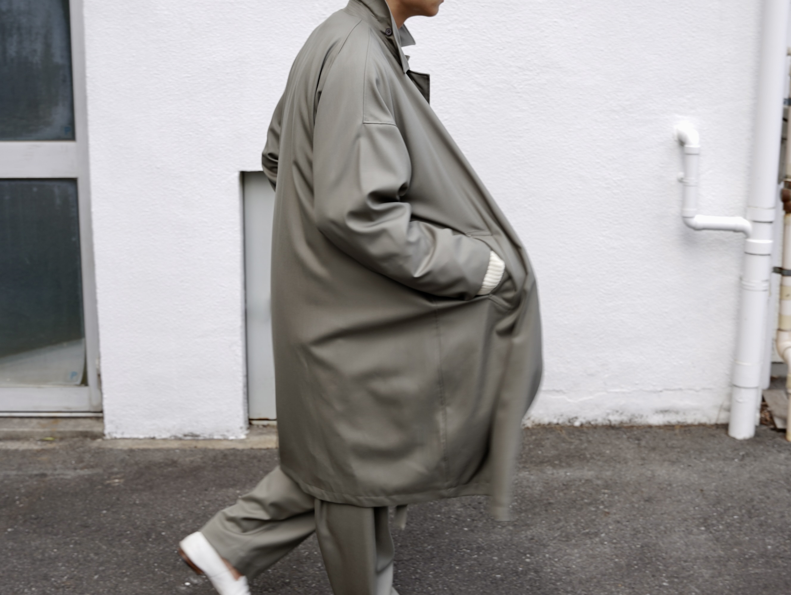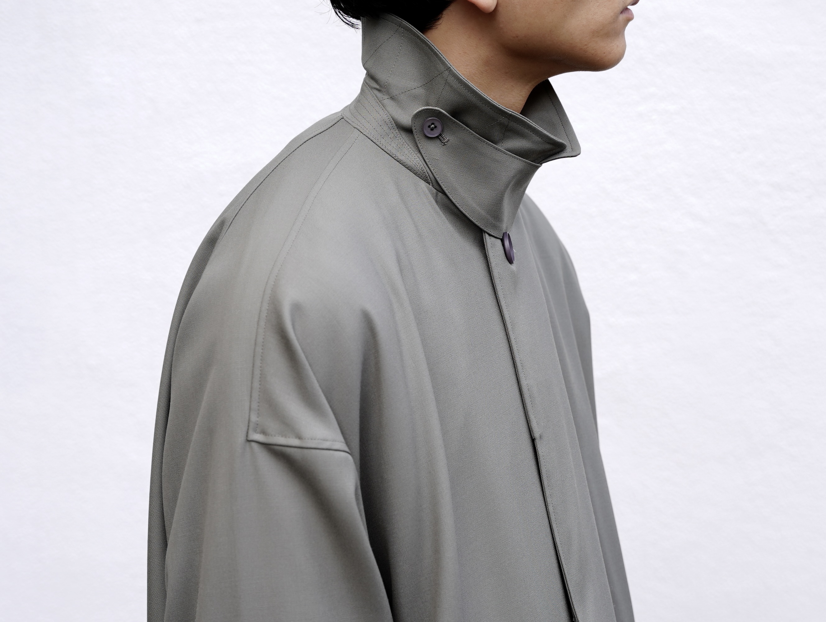 ドロップショルダーからなる、丸みのあるオーバーシルエット。メリノウールを使用したバックサテンギャバジン。タテが二重織組織になっていることから厚みがありながらもドレープや落ち感も感じられる生地です。裏がサテン織になっているため肌触りも柔らかく滑らかです。