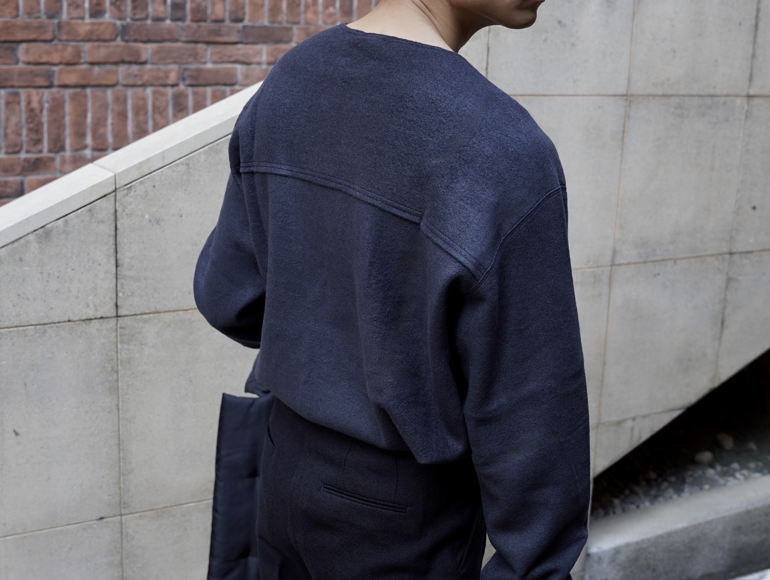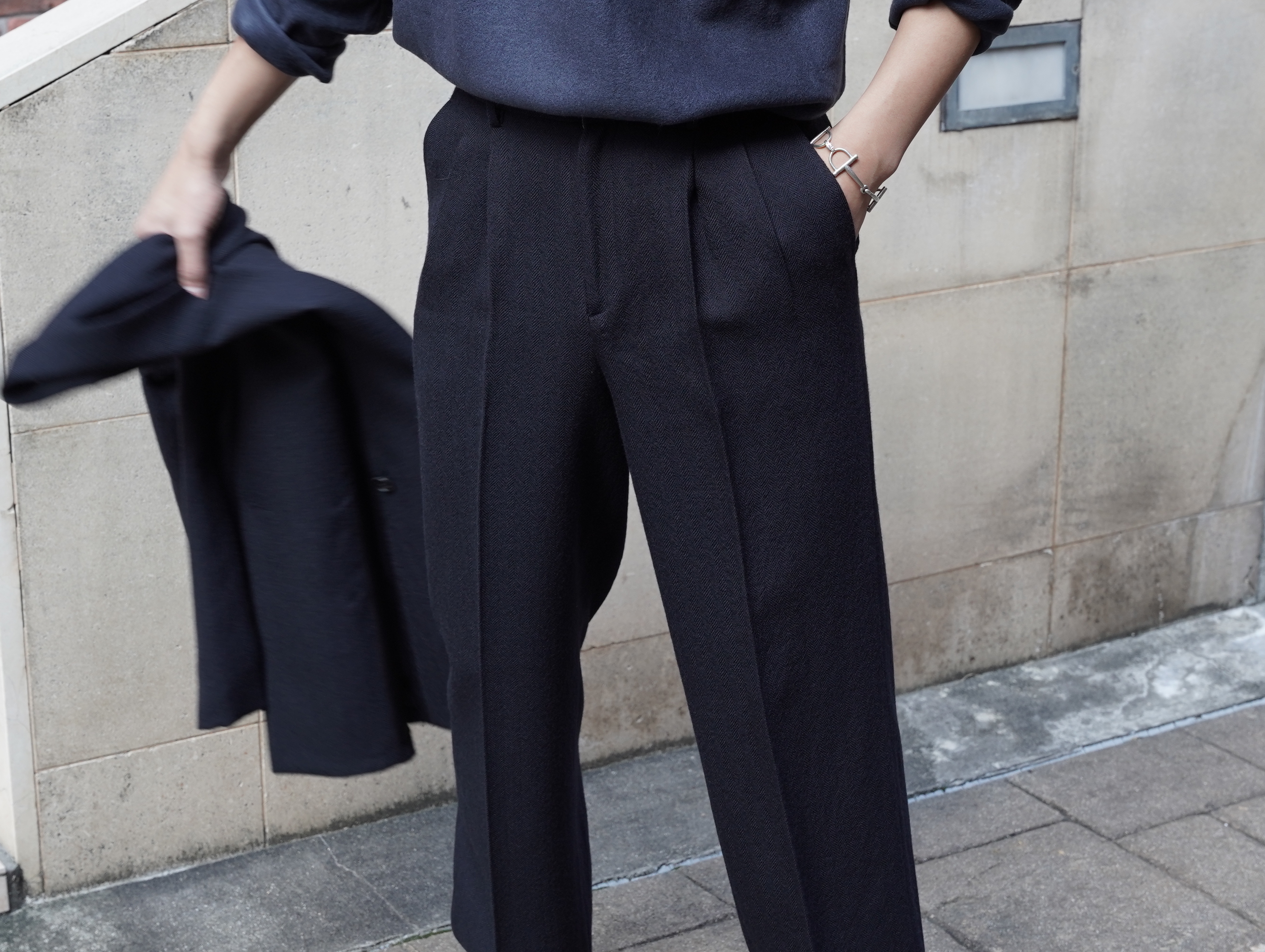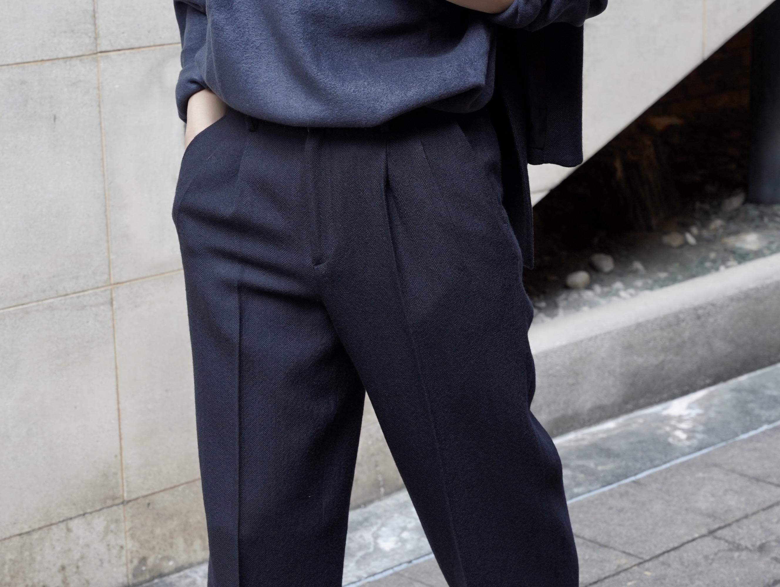 20世紀初めのようなヘリンボーン生地をテーマに、粗めの原料を使い最後に軽く抑える事で、ビンテージの梳毛生地のような風合いを持ったseya.のオリジナルファブリックです。