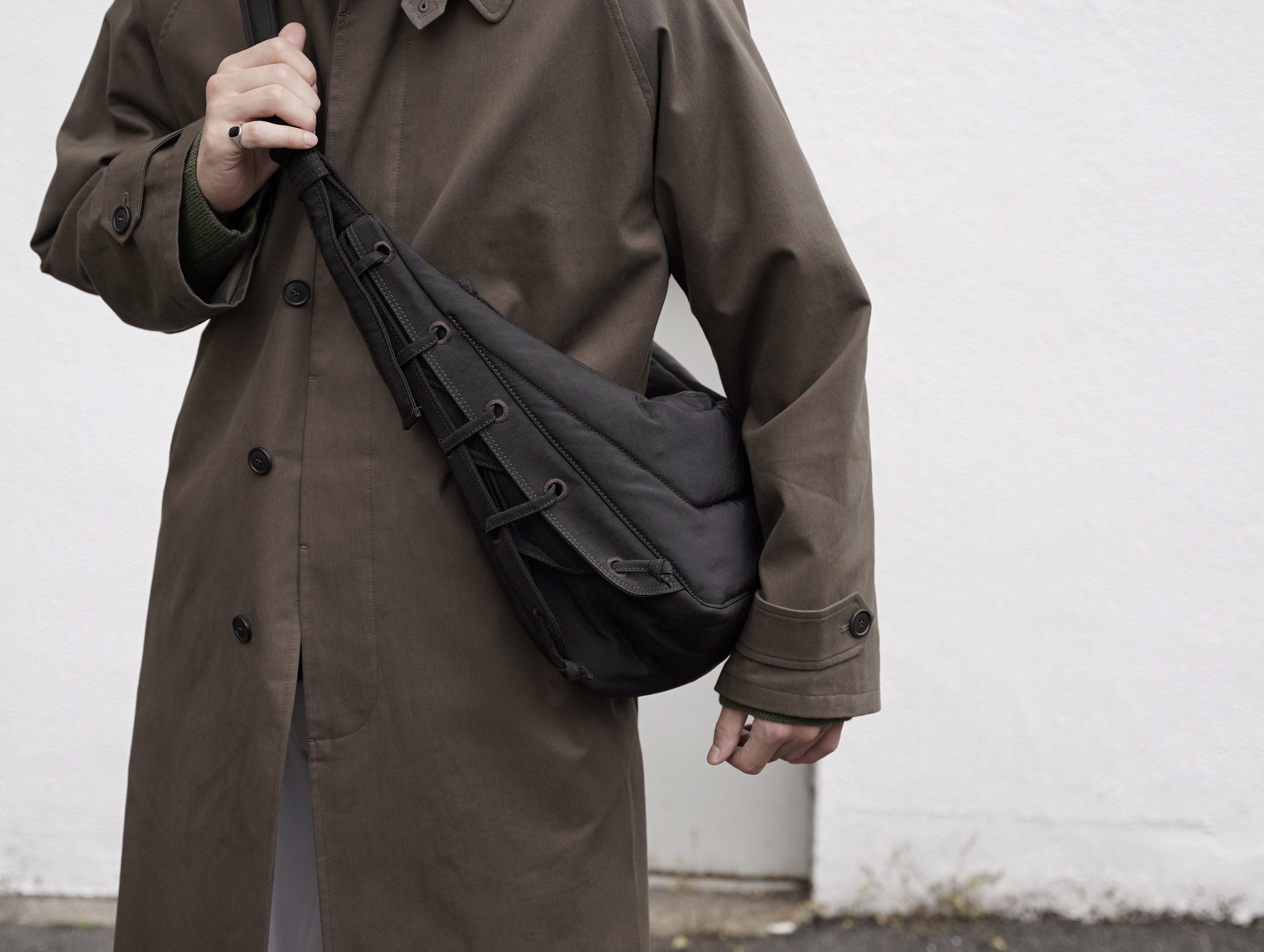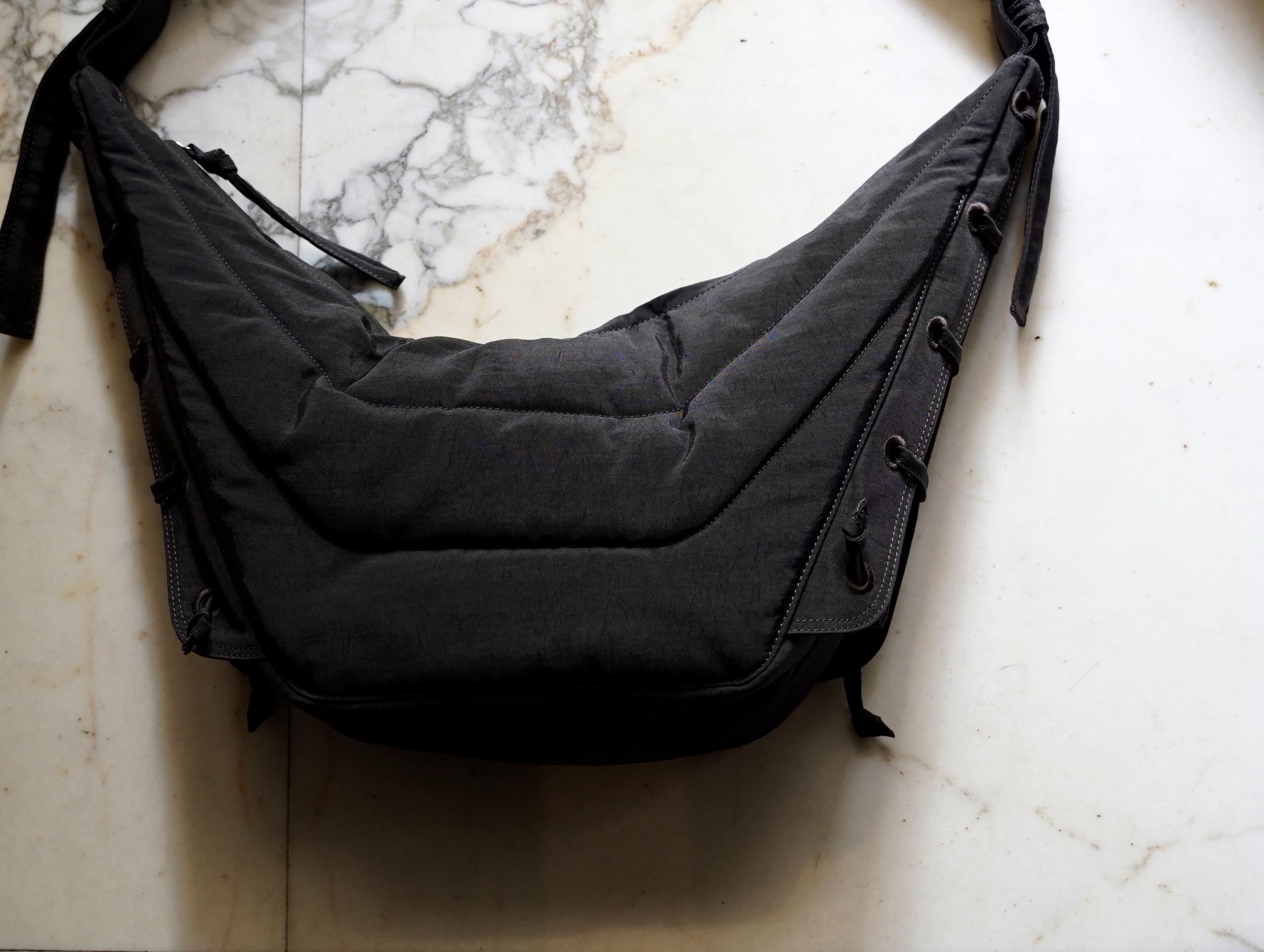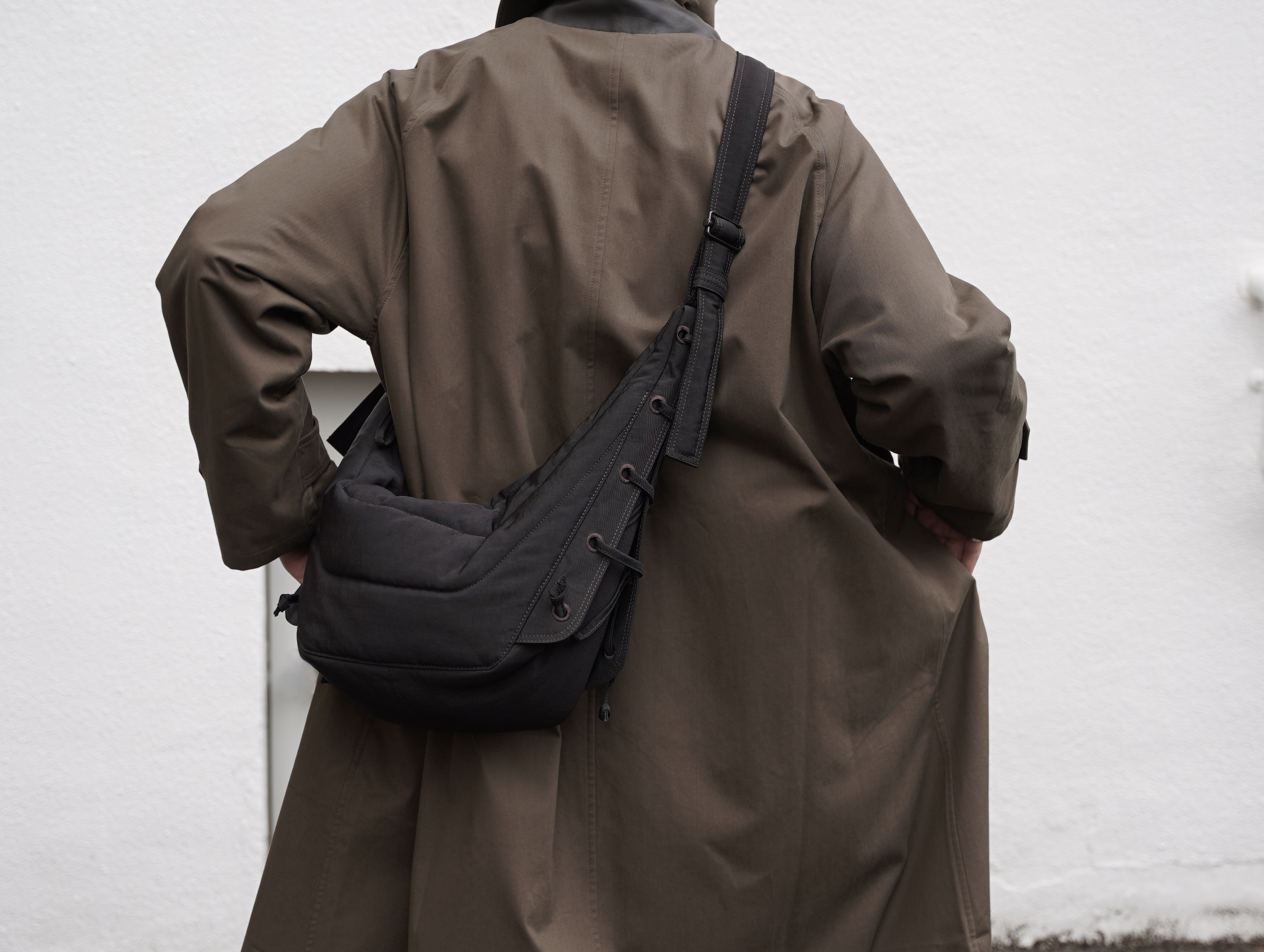 クロワッサンバッグの形をベースにパテッドを巧みに使い、機能的なバッグへと消化しています。
