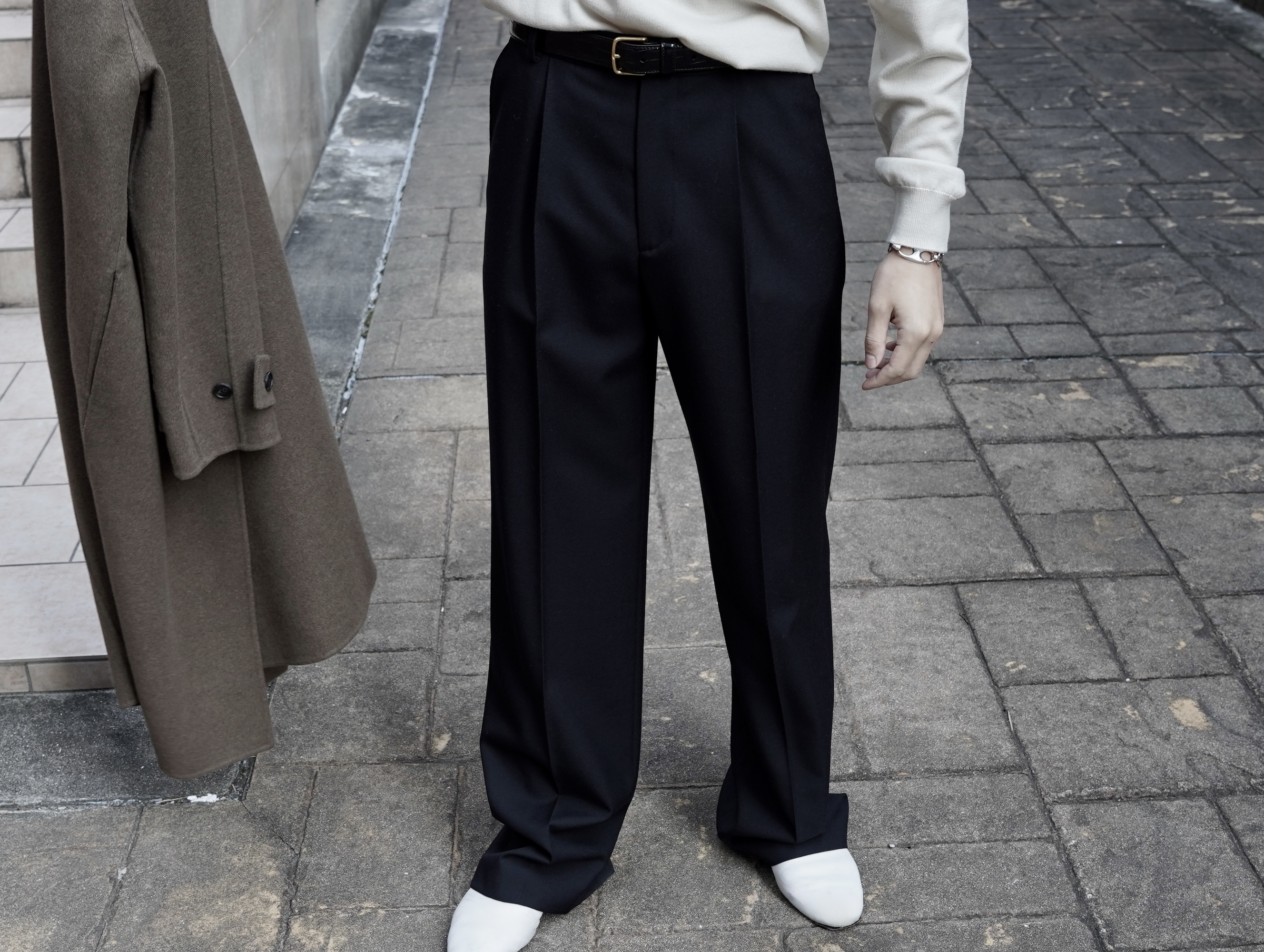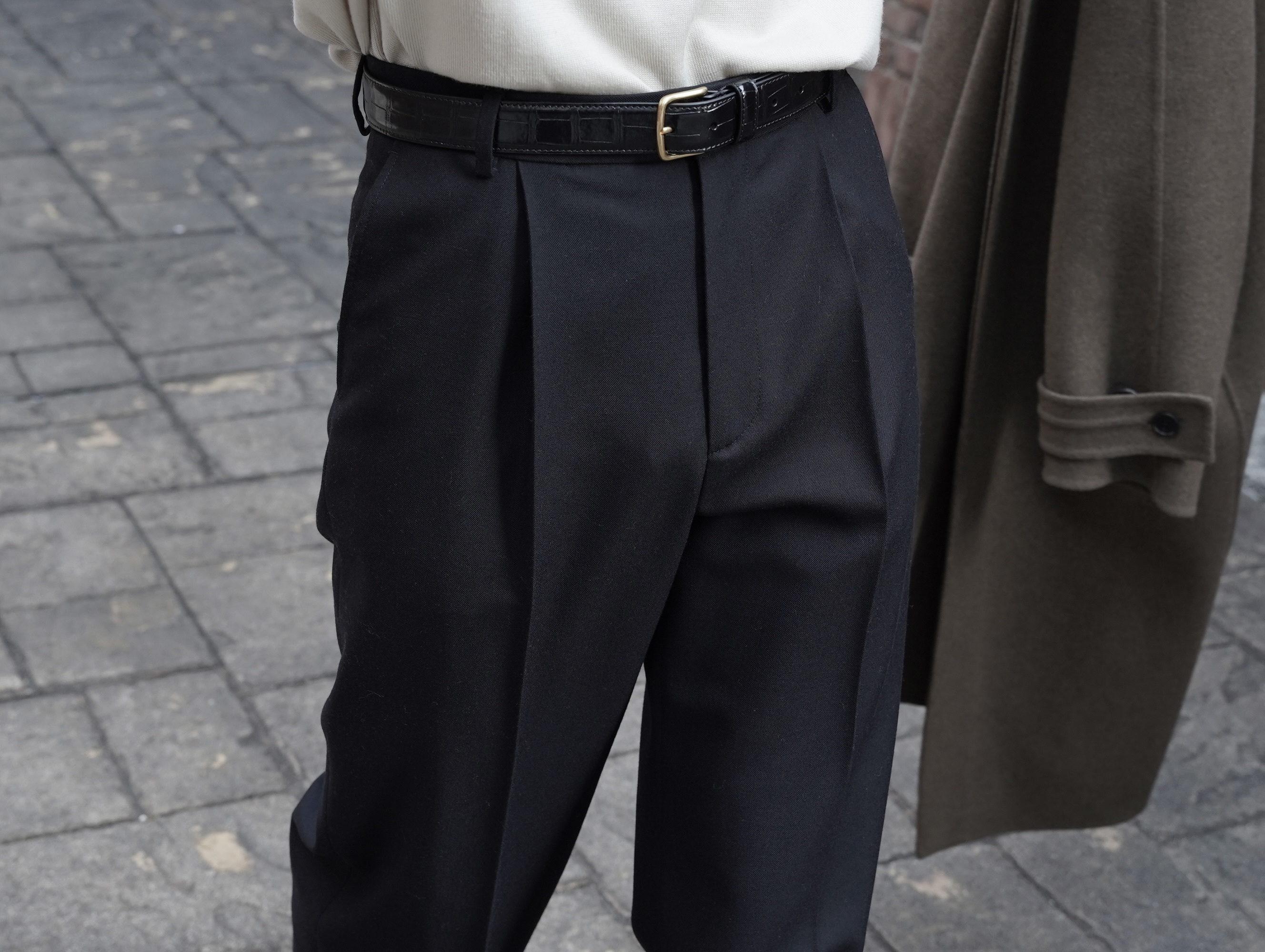 深めのフロントプリーツなどが、美しい縦ラインを強調しています。