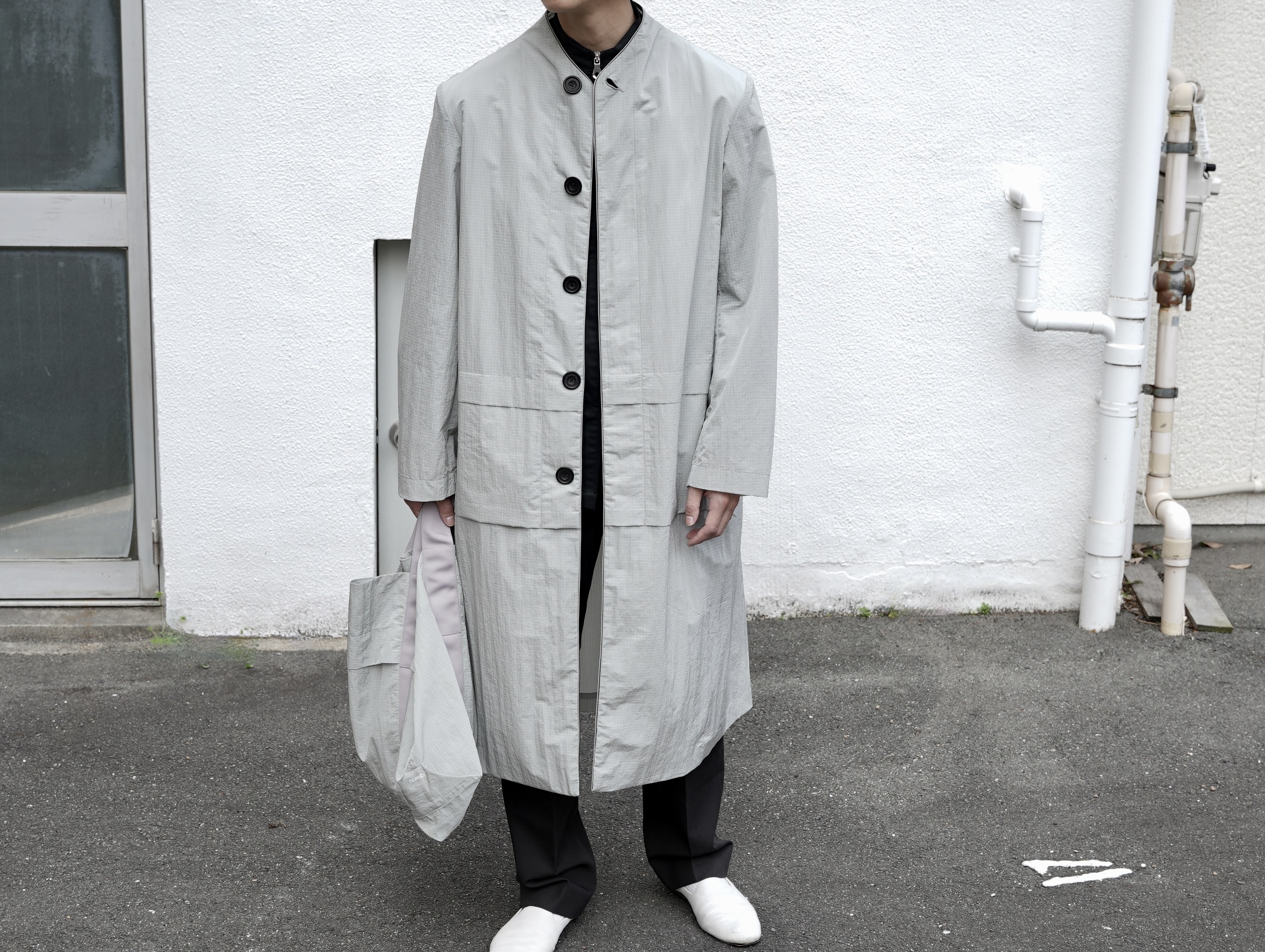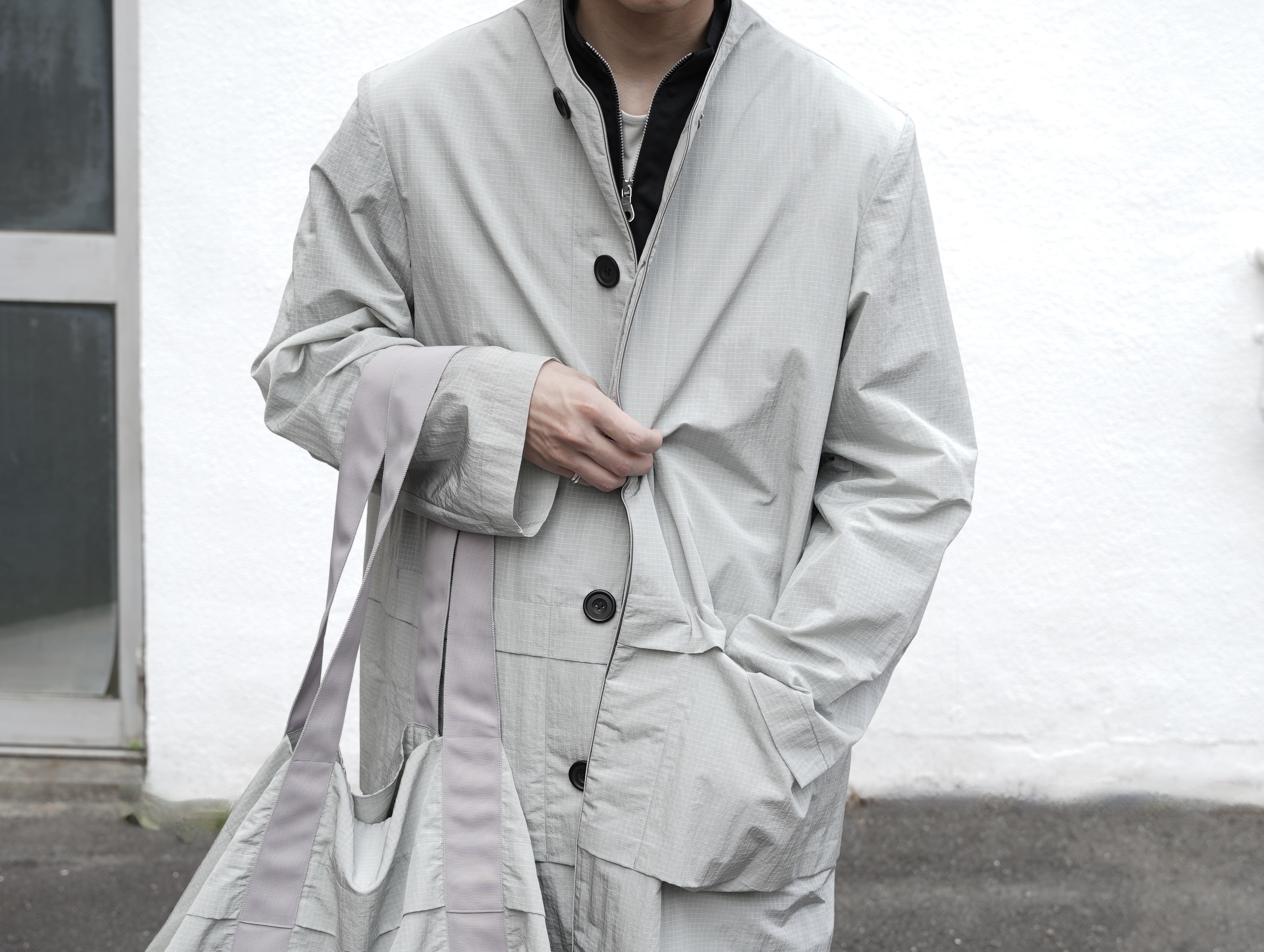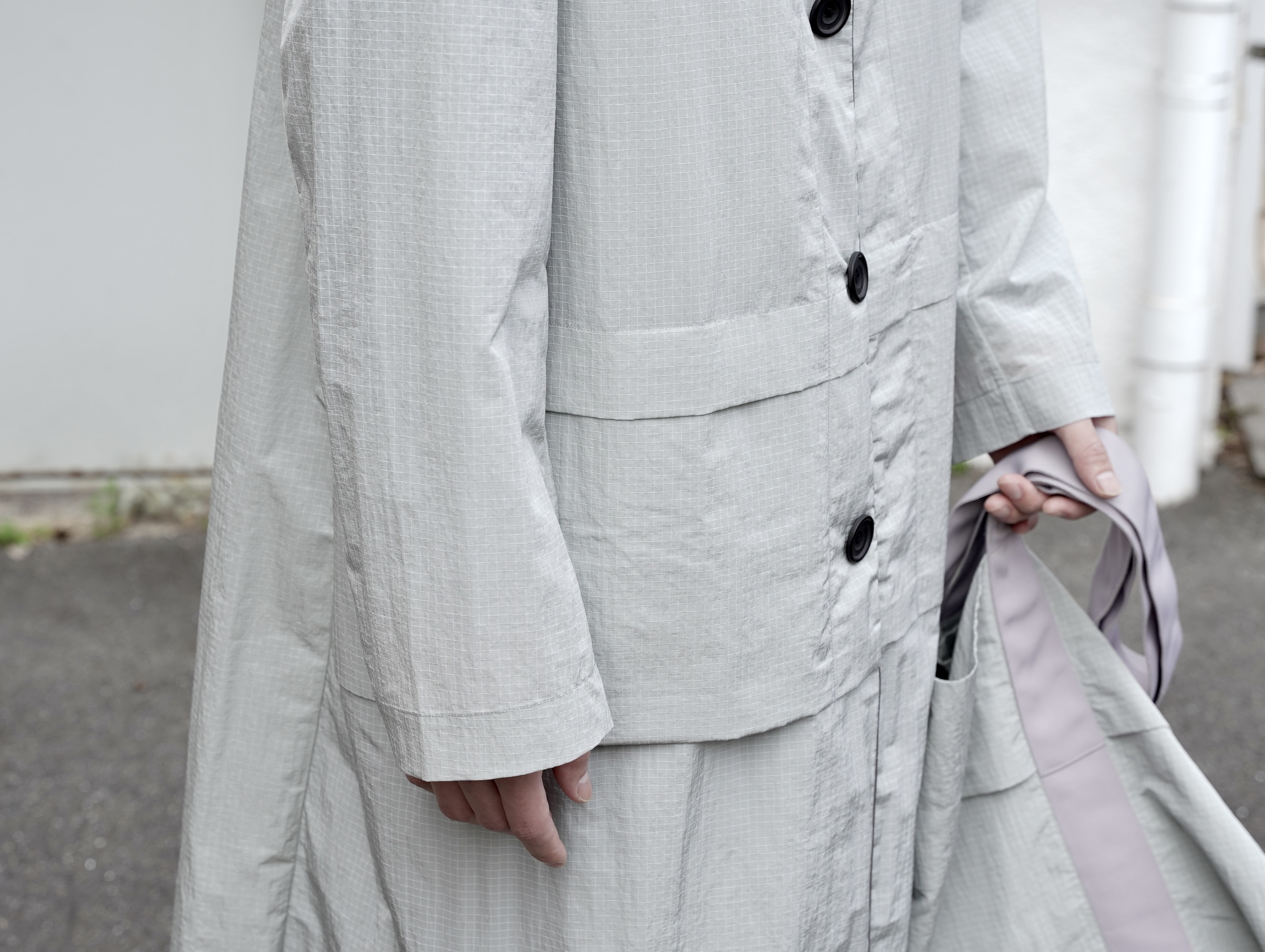 モノフィラメントナイロンリップストップを用いた、非常に軽やかなロングコート。