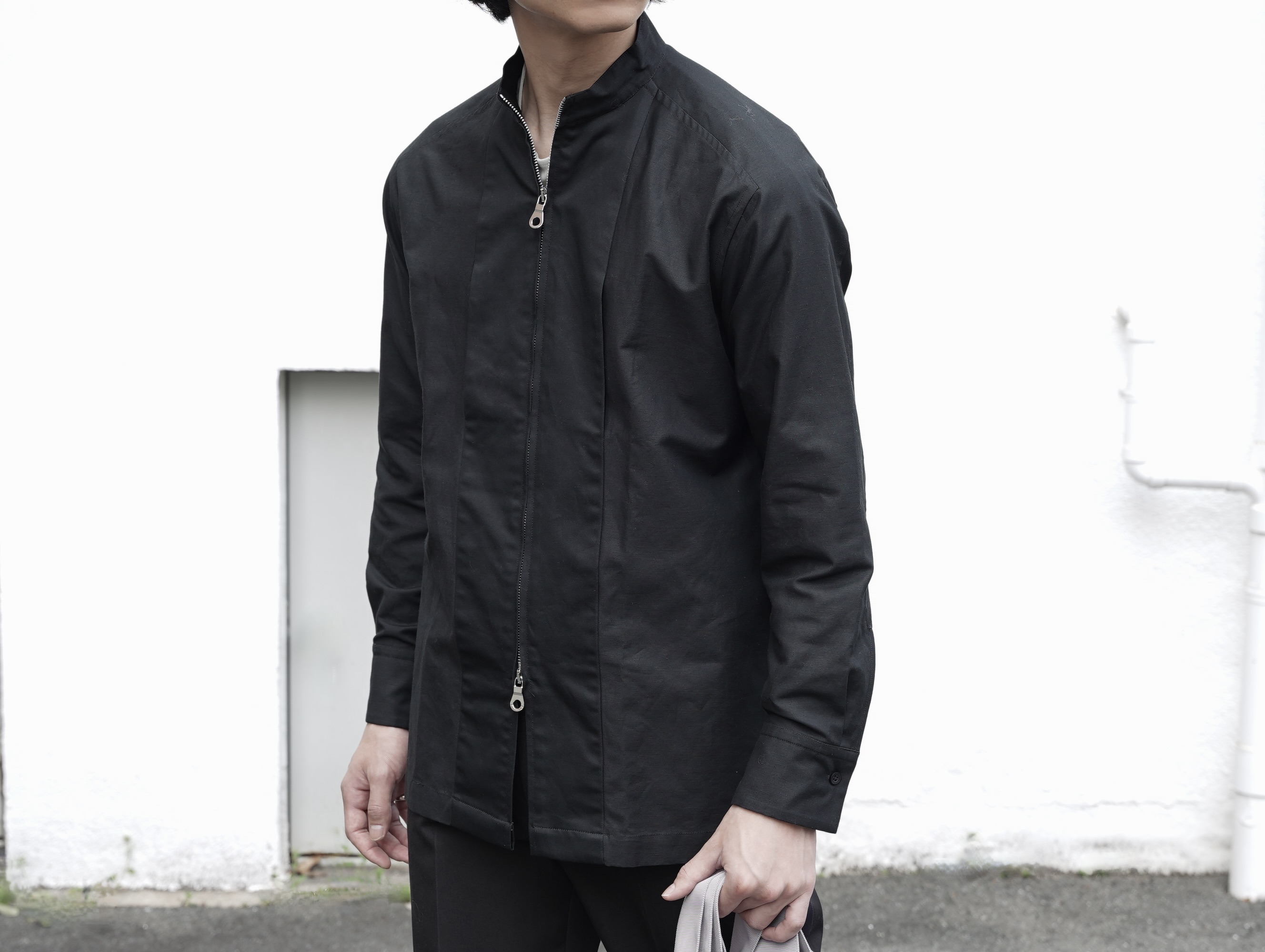 前立てをジップ仕様に置き換えることでシャツの軽やかさを残しながらも、羽織りとしての側面を合わせ持ちます。