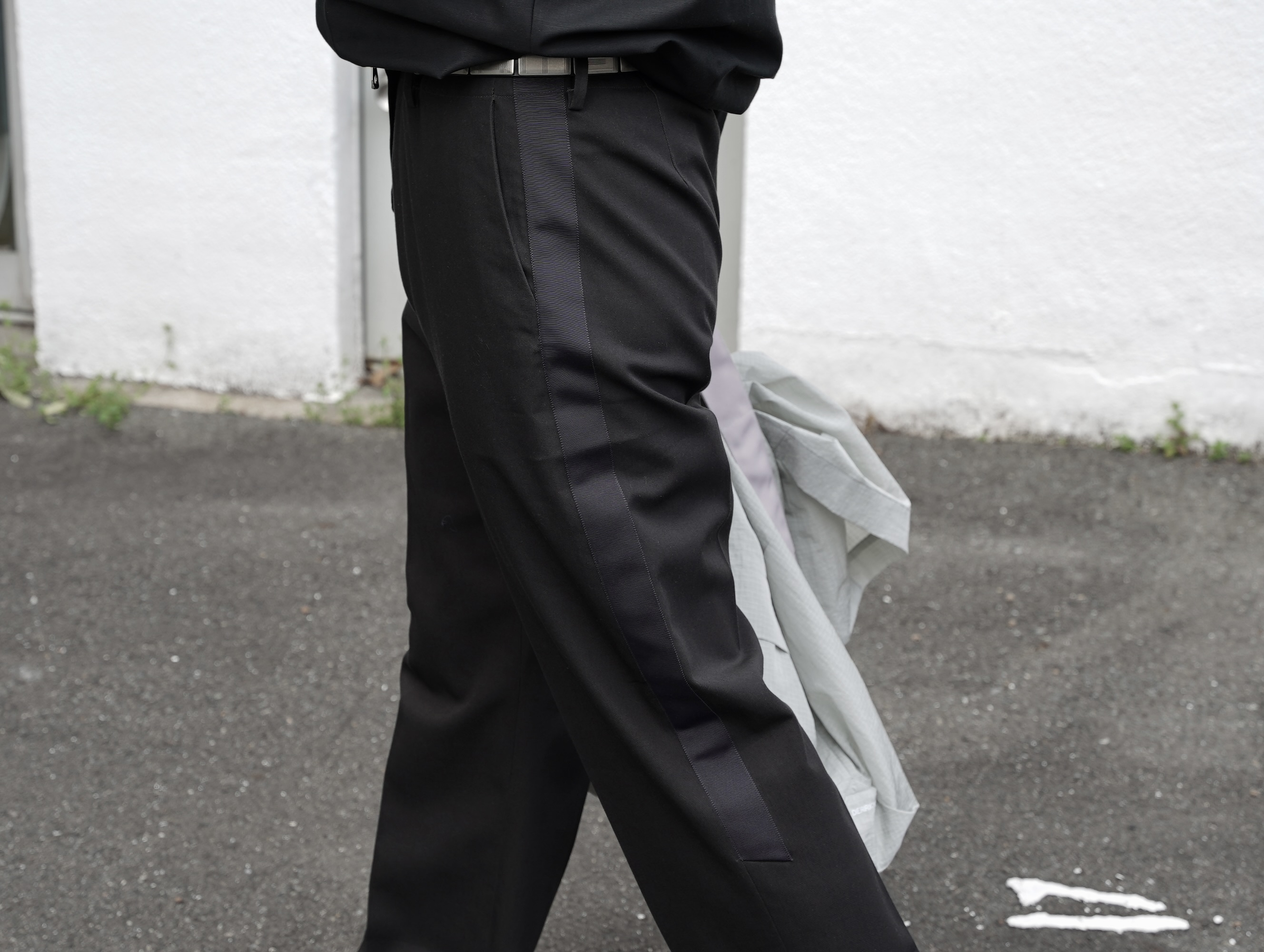 トラックパンツのようなサイドラインを途中で区切る事でコンテンポラリーなムードを見せます。