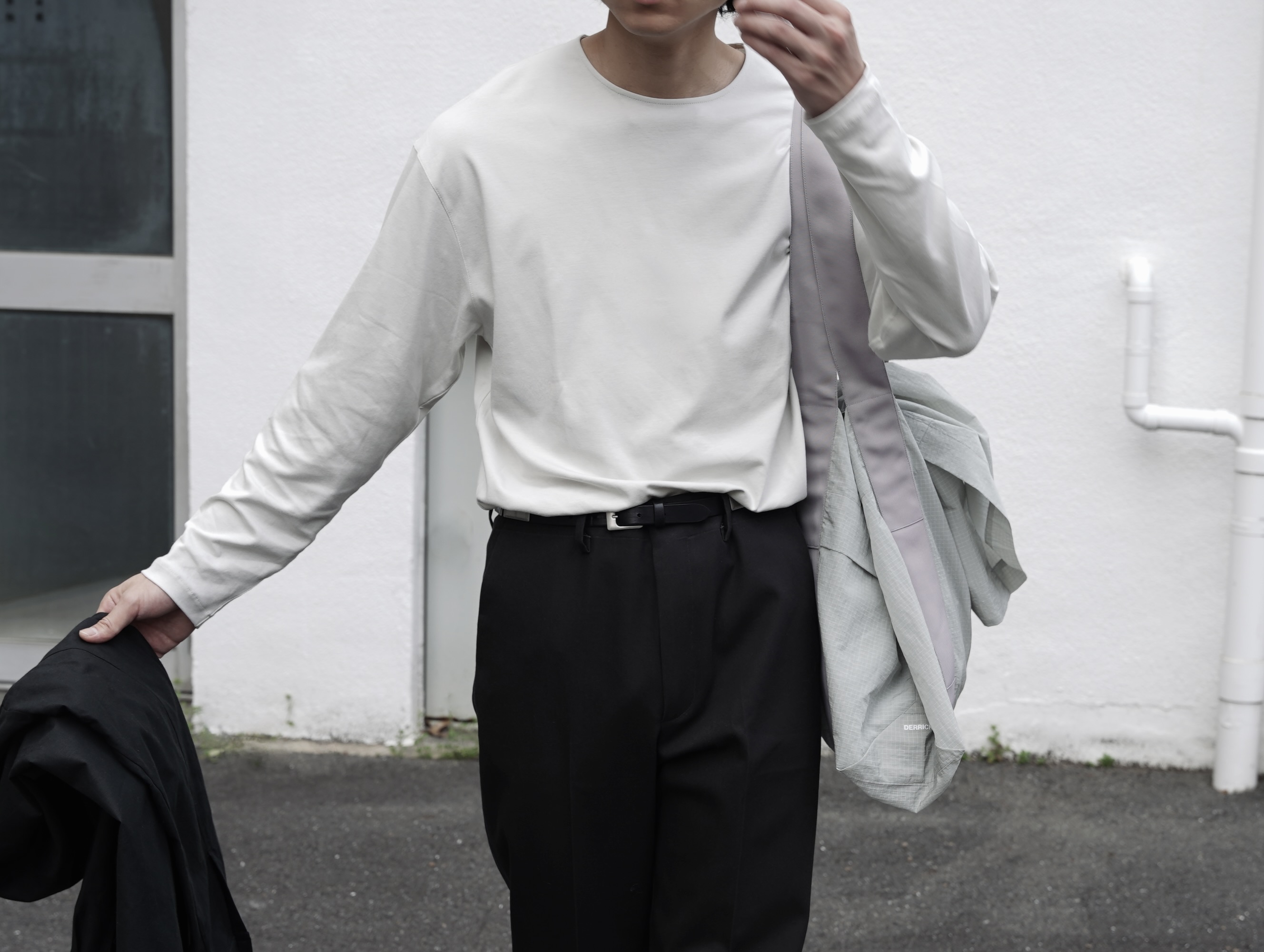 撥水性・通気性・防シワ性を備えた高機能ナイロンは、わずかなハリとドライな質感があり動きに合わせて輪郭を保つ独特の表情を持ちます。