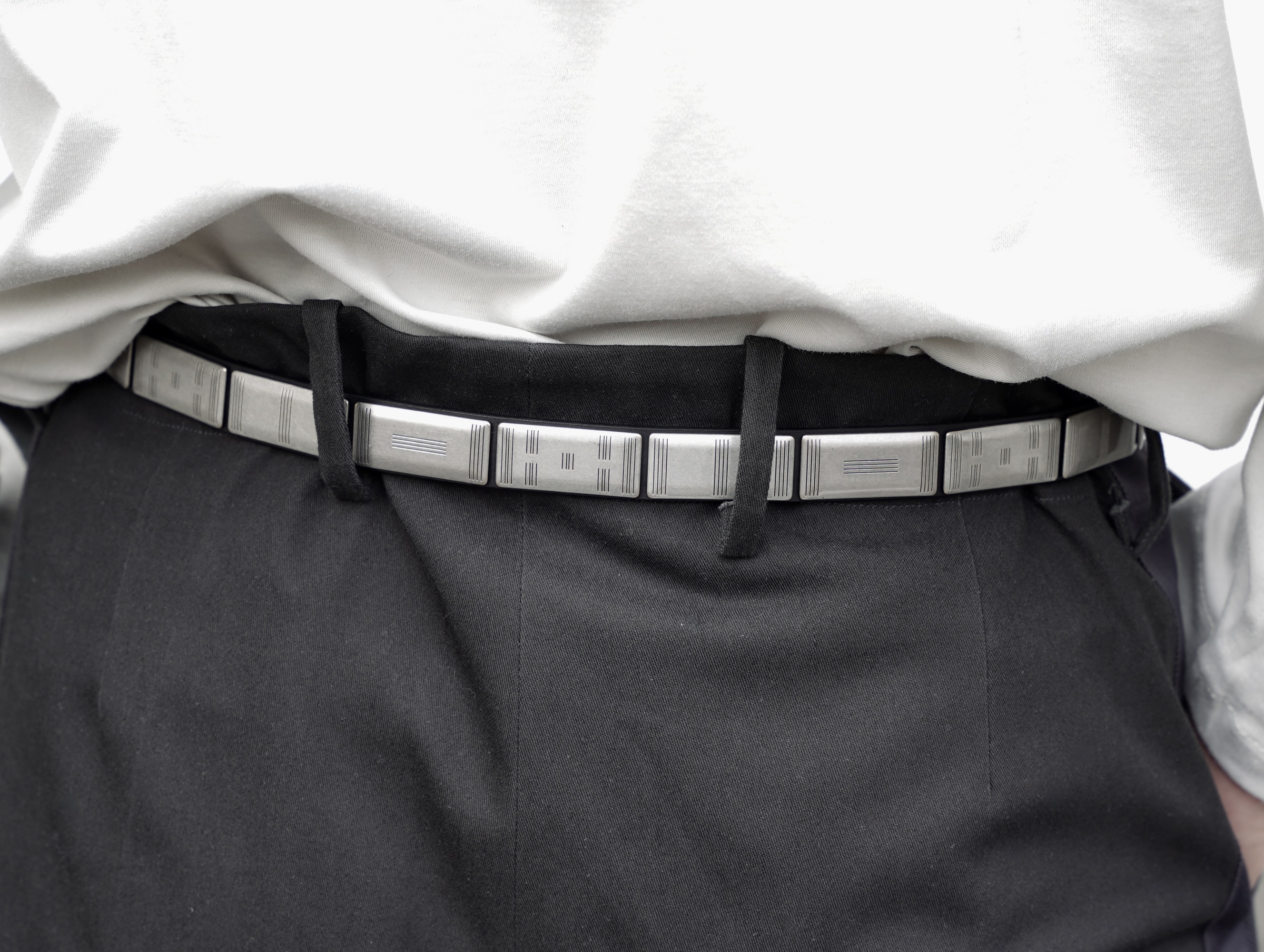 等間隔に配されたメタルパーツは、水牛の首輪や馬具、民族装飾を思わせる無骨なニュアンスを持ちながらも端正な配置によって上品な印象に仕上げられています。装飾性の中にもLEMAIREのミニマルさが感じられます。
