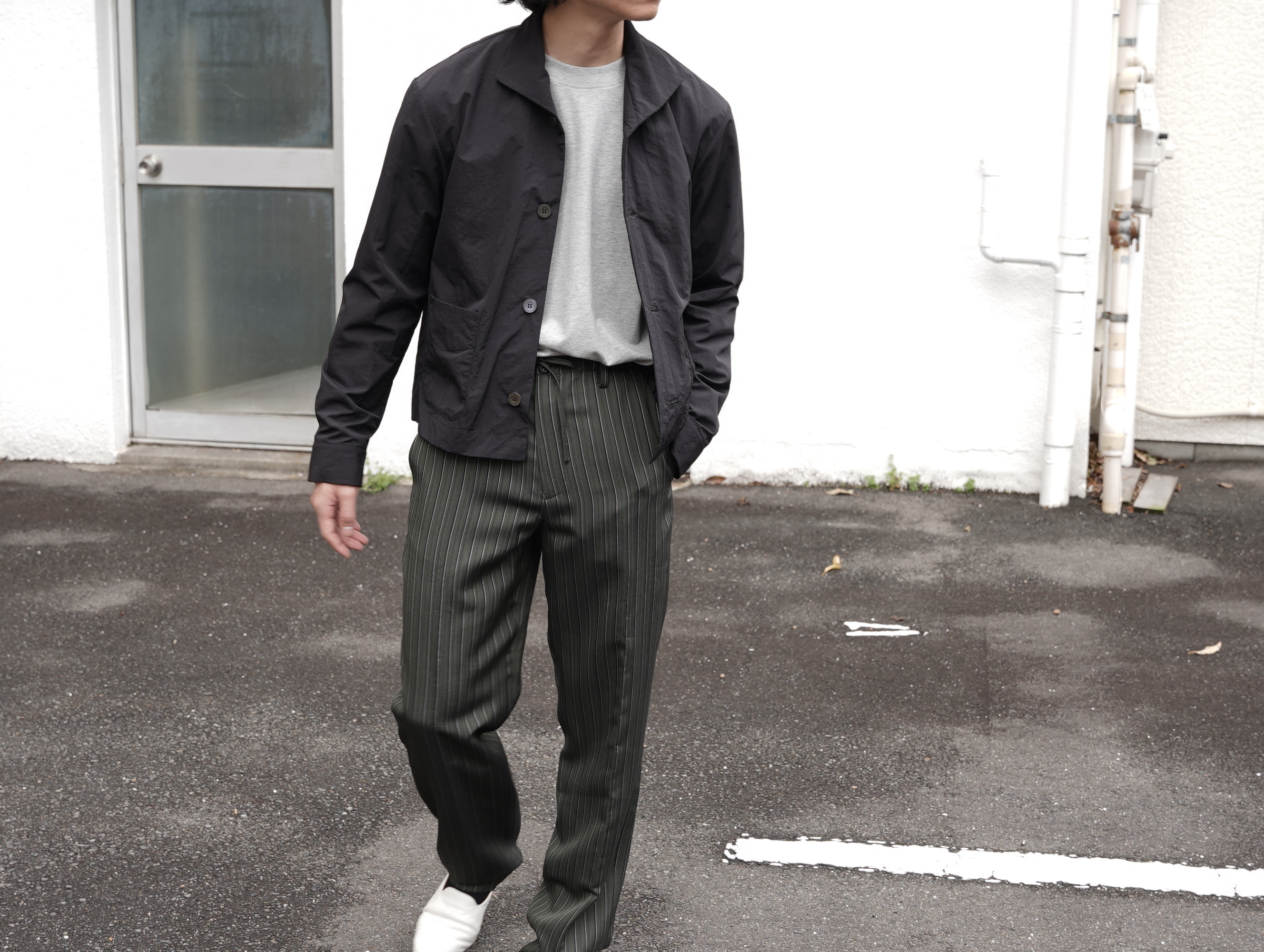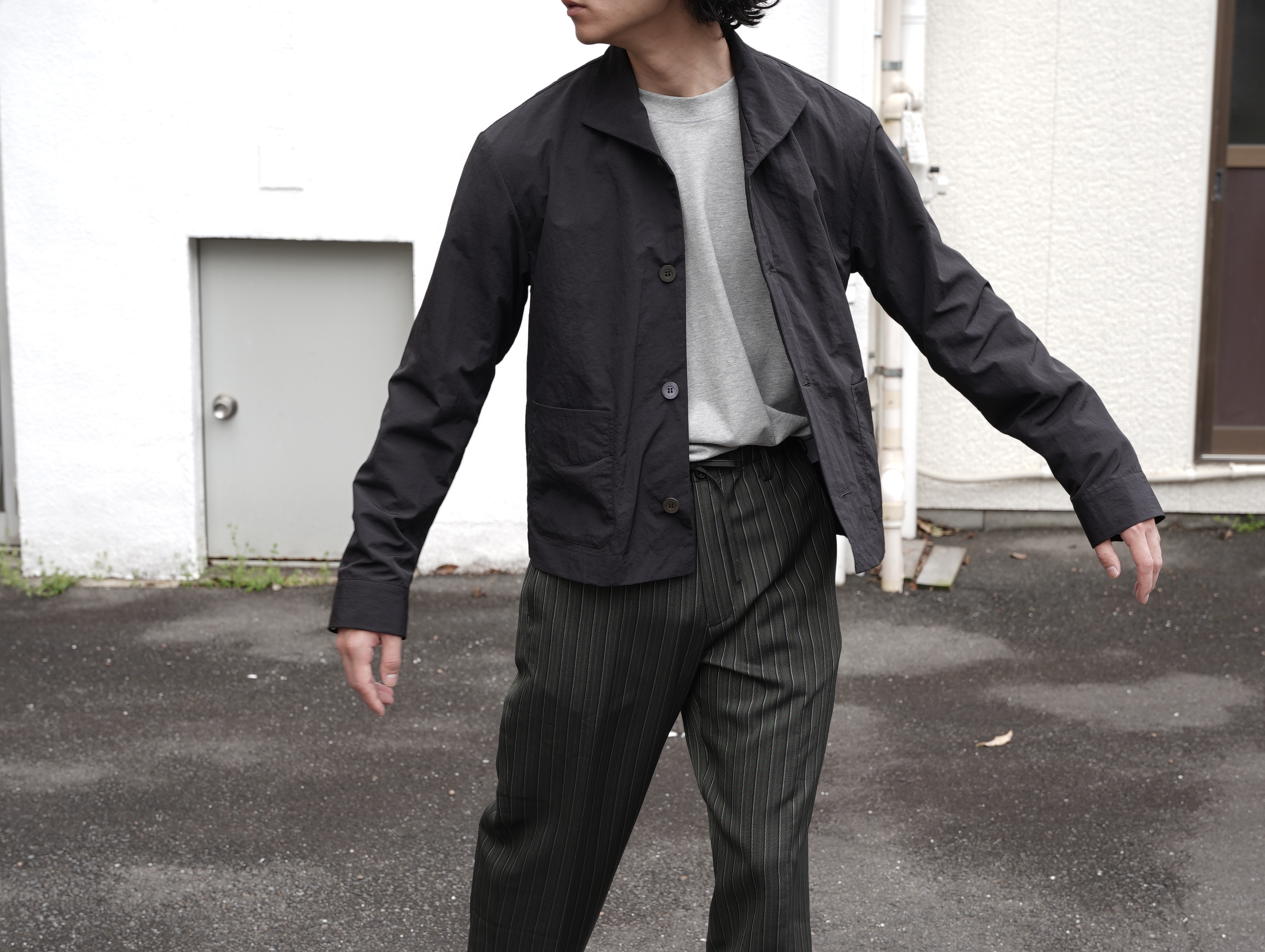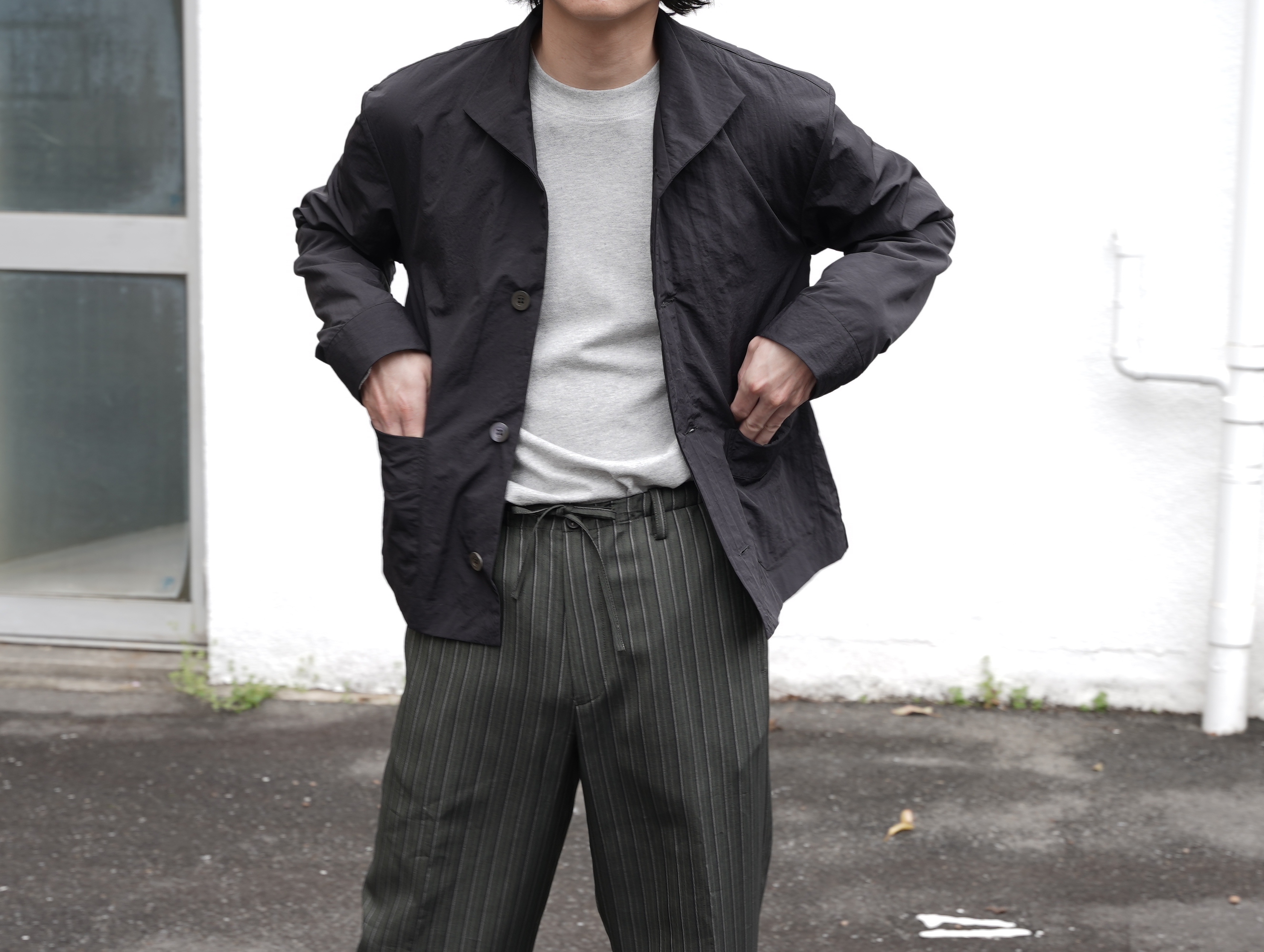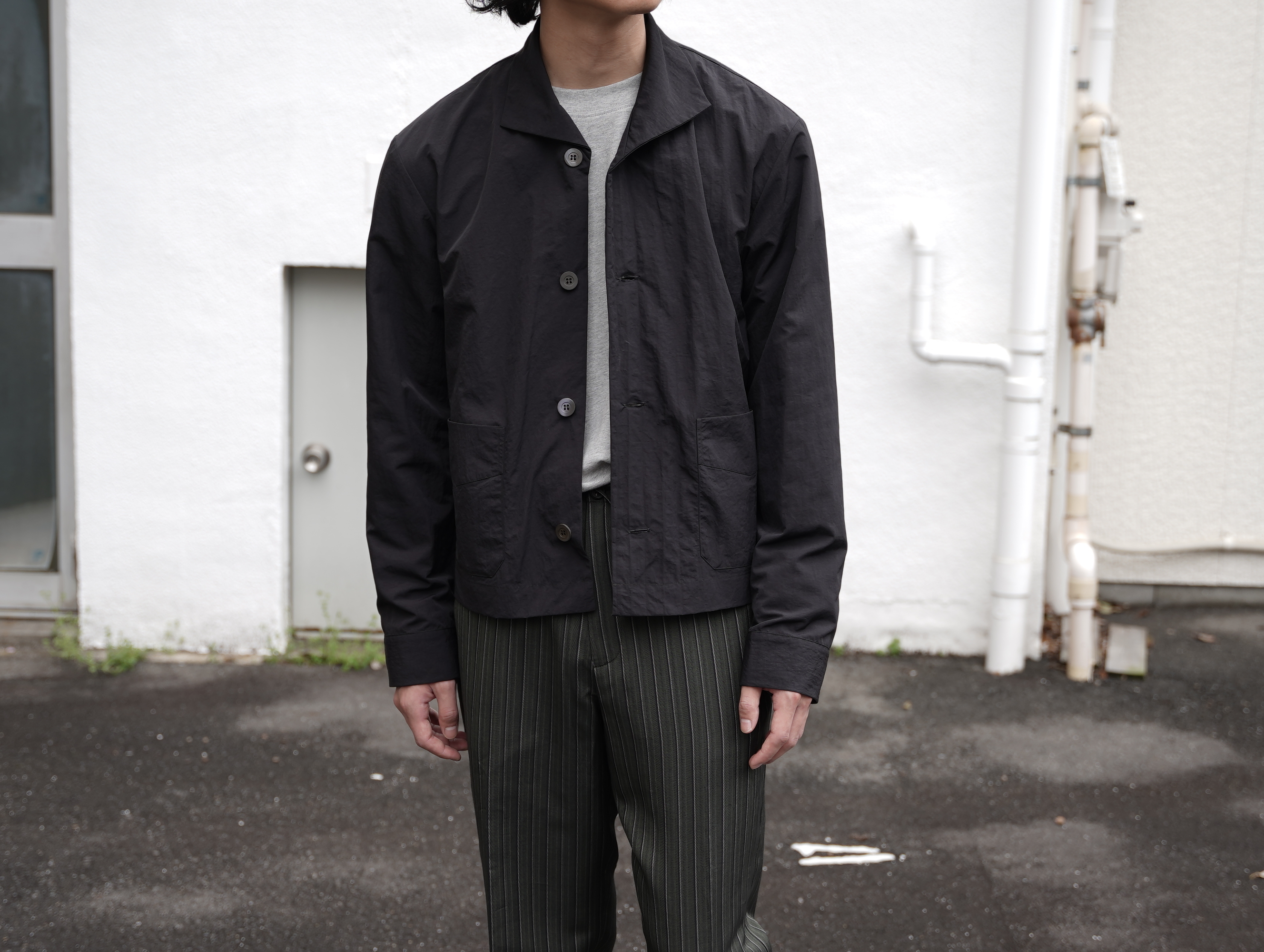 フロントは3ボタン仕様、ゆとりを持たせた身幅と短めの着丈により’90s的なバランスに仕上げられています。大きめのパッチポケットが程よいワークテイストを添えつつ、モダンな襟元のデザインとの対比で’90sのモードな印象に。ワイドパンツからスリムパンツまで幅広いコーディネートが楽しめます。