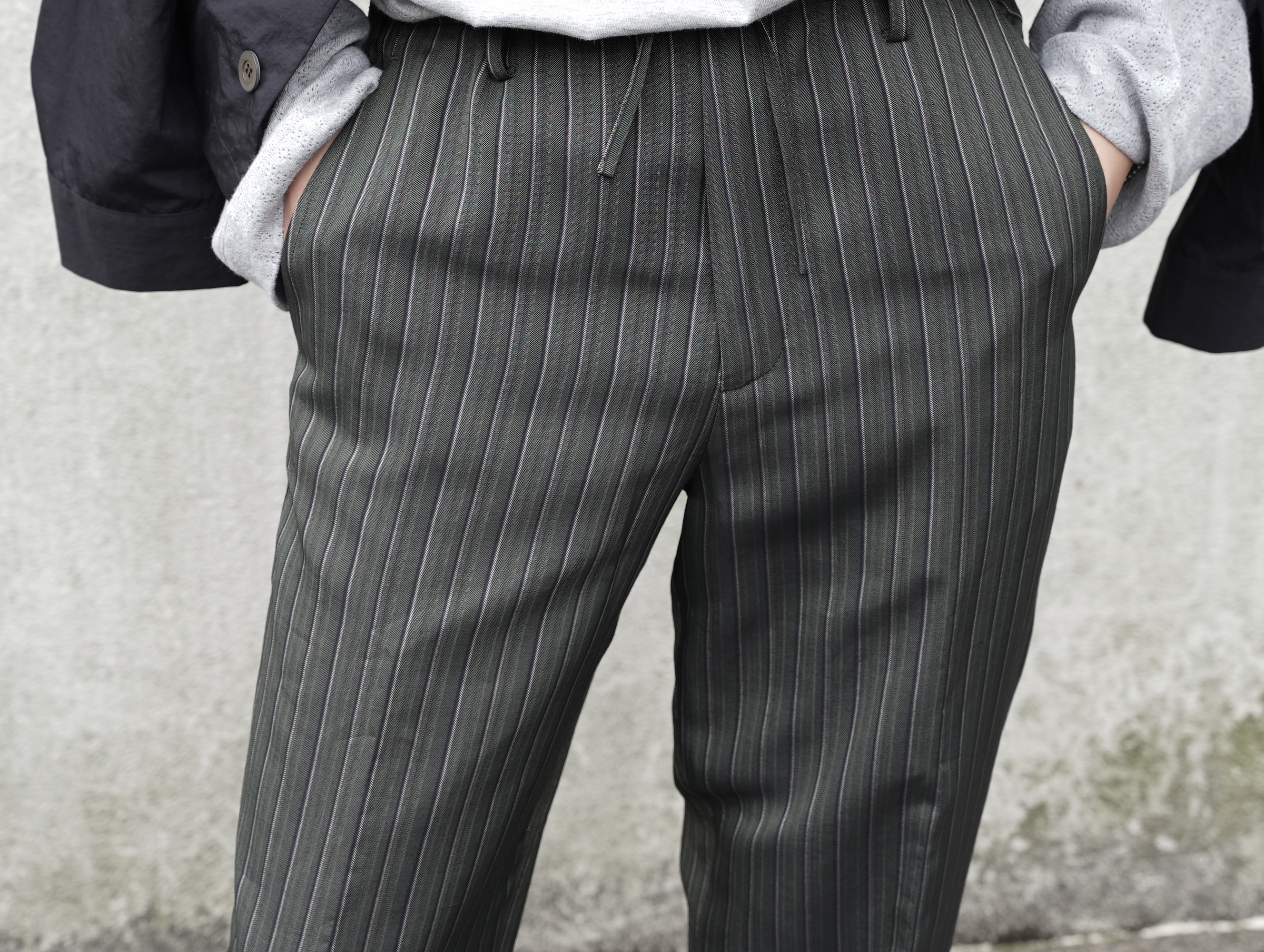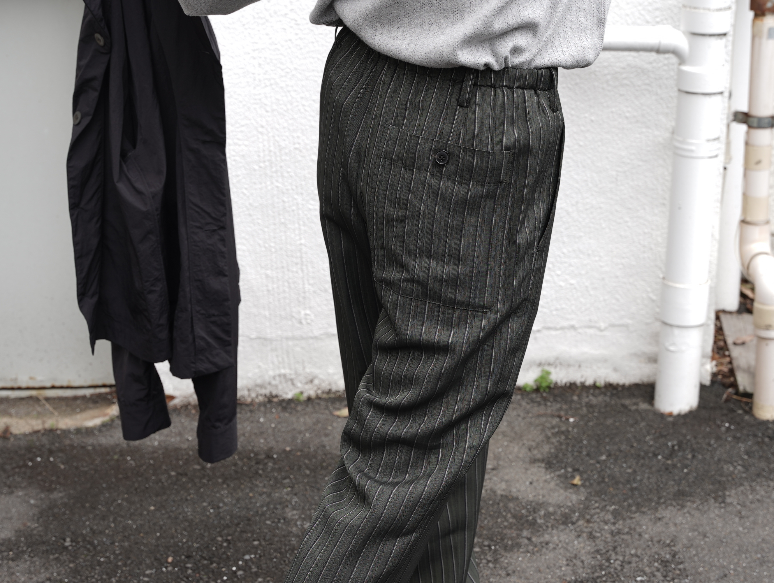 クラシックなストライプトラウザーの側面を保ちながら、流動的な素材使いによってDries Van Notenらしい静かなるエレガンスへと昇華された一本です。