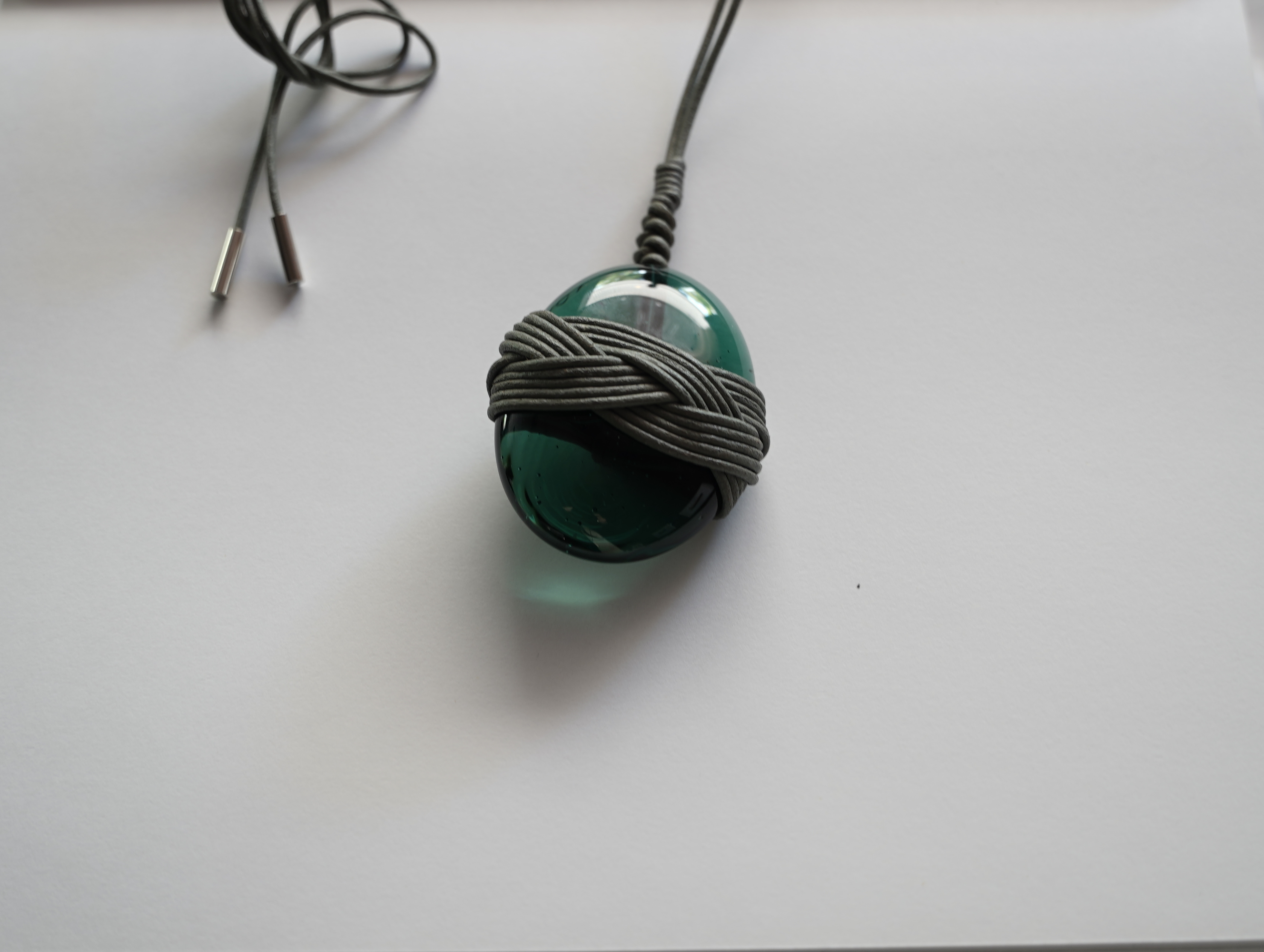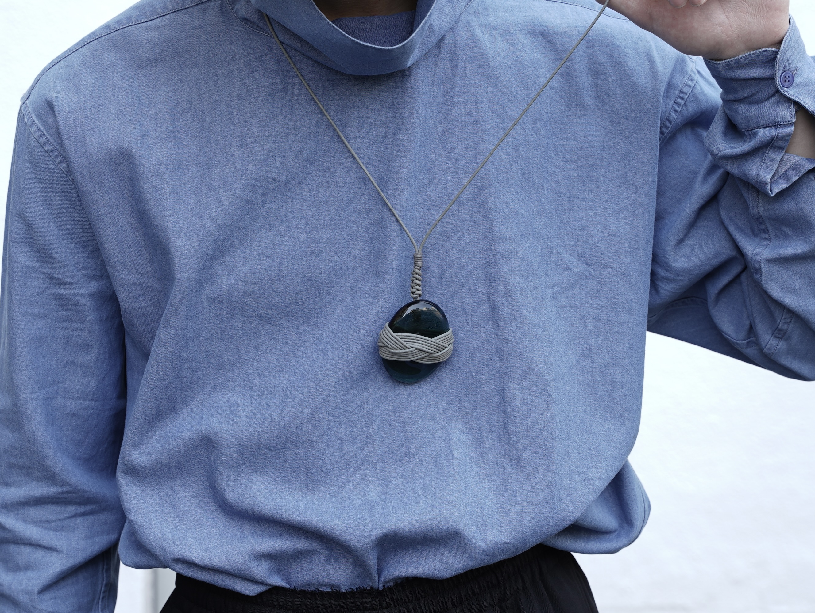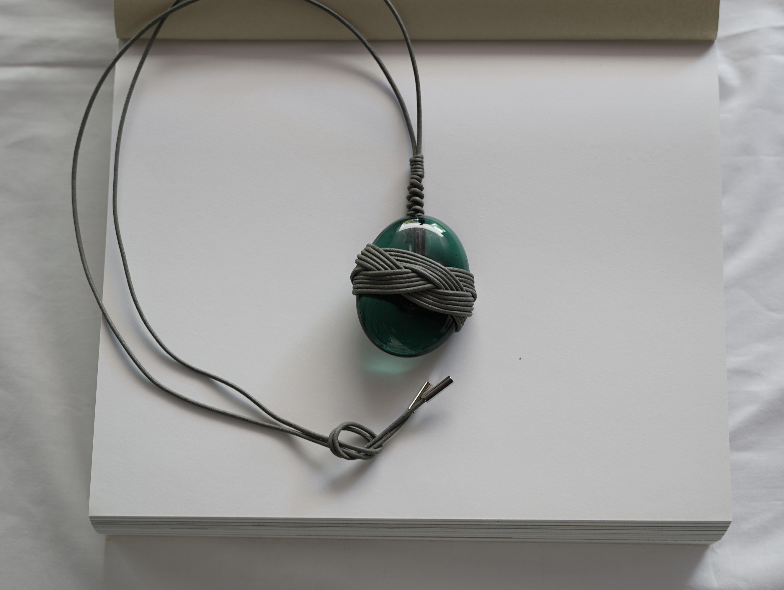 噴火で沖縄に流れ着いた軽石を長い時間をかけて加工した再生ガラス。周りに革紐で日本の造形の文化である結びを施しました。