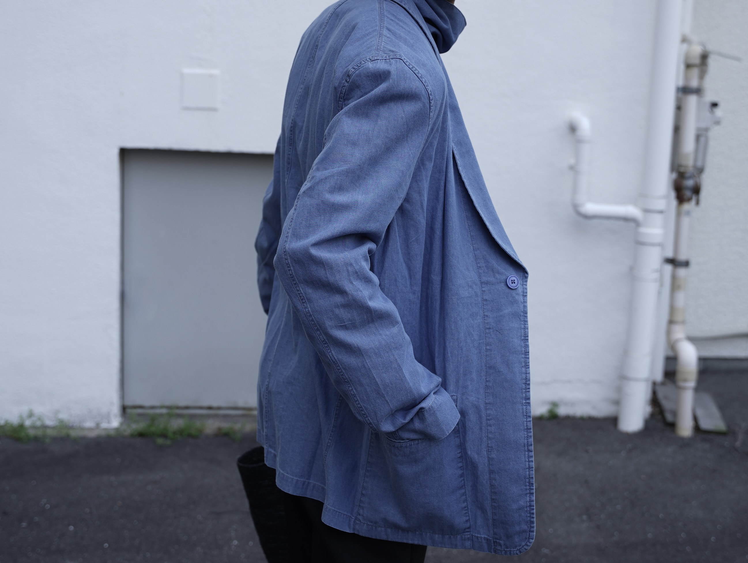 印象的なショールカラー、シングルボタンのミニマルな構成により、リラックス感がありながらも洗練された佇まいに。
