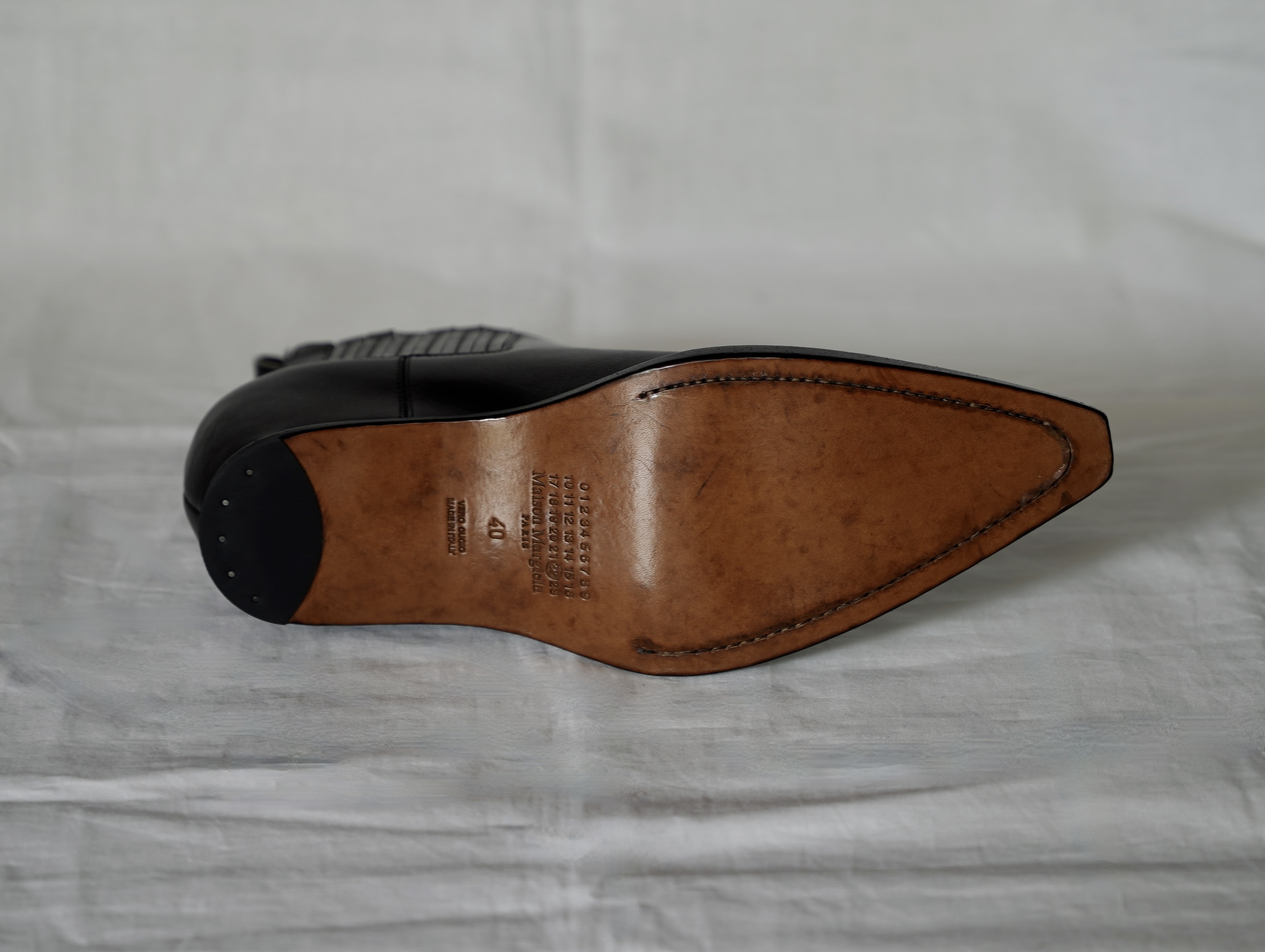 メゾン マルジェラのアーカイブを再解釈した「ヒールレス」ブーツ。隠されたヒールを包み込むように描かれた曲線的なソールが印象的な一足。ヴィンテージ加工を施したレザーアッパーはハンドメイドで仕上げられ、クリーンでミニマルな佇まいを引き立てます。サイドのゴアパネルとポインテッドトゥが端正なラインを生み出し、一体化した構造によって、わずかに伸びやかなシルエットと安定した履き心地を実現しています。バックには、メゾンのシグネチャーである1本の白いステッチが施されています。