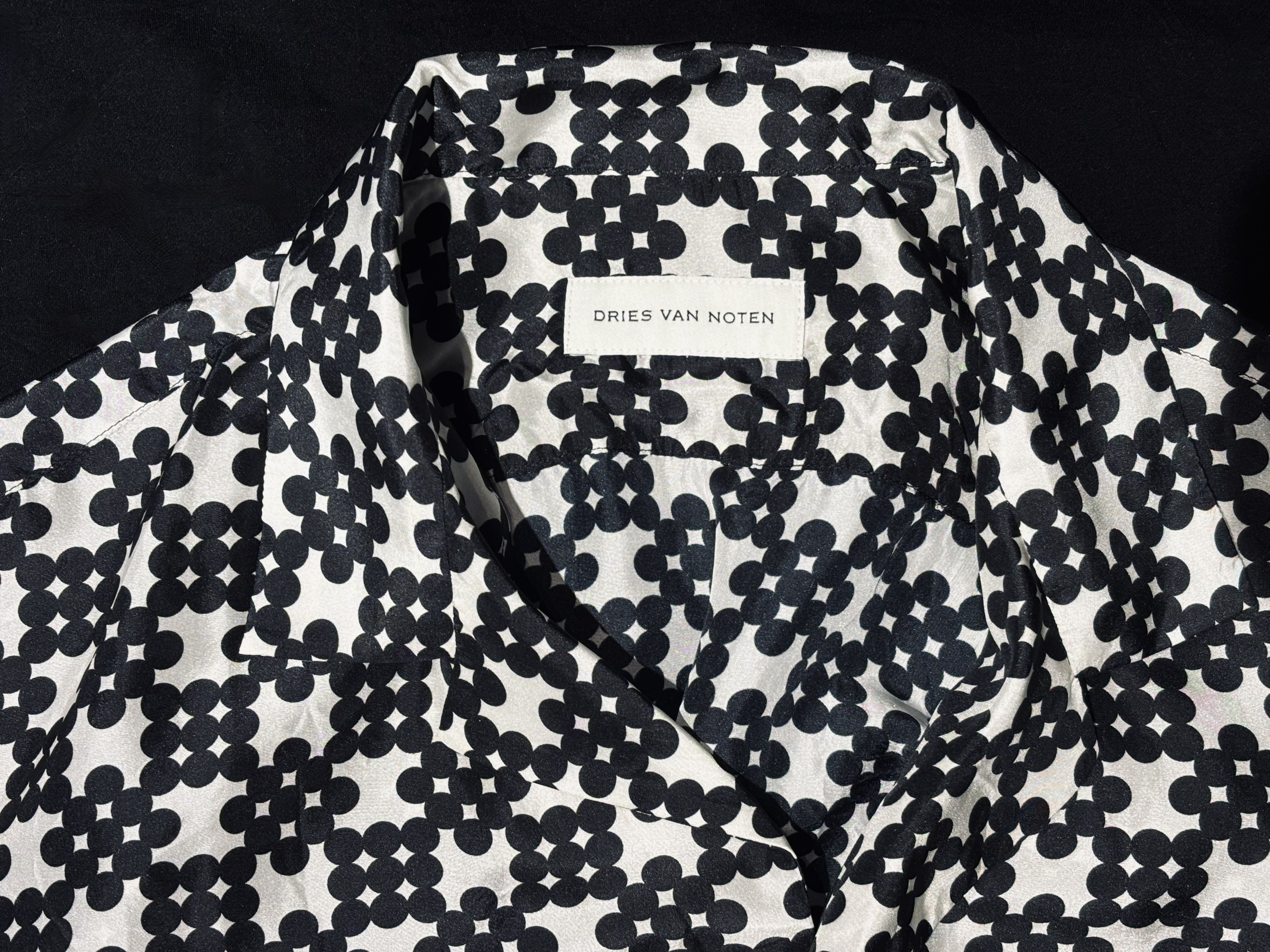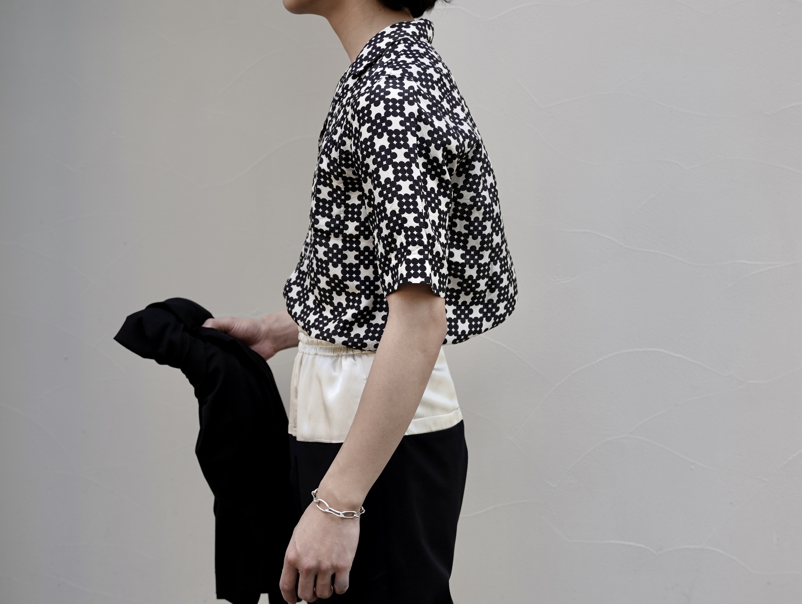モノトーンで構成された総柄は小さなモチーフを連続させることで独特のリズムと奥行きを生み出し、ミニマルでありながら強い存在感を放ちます。