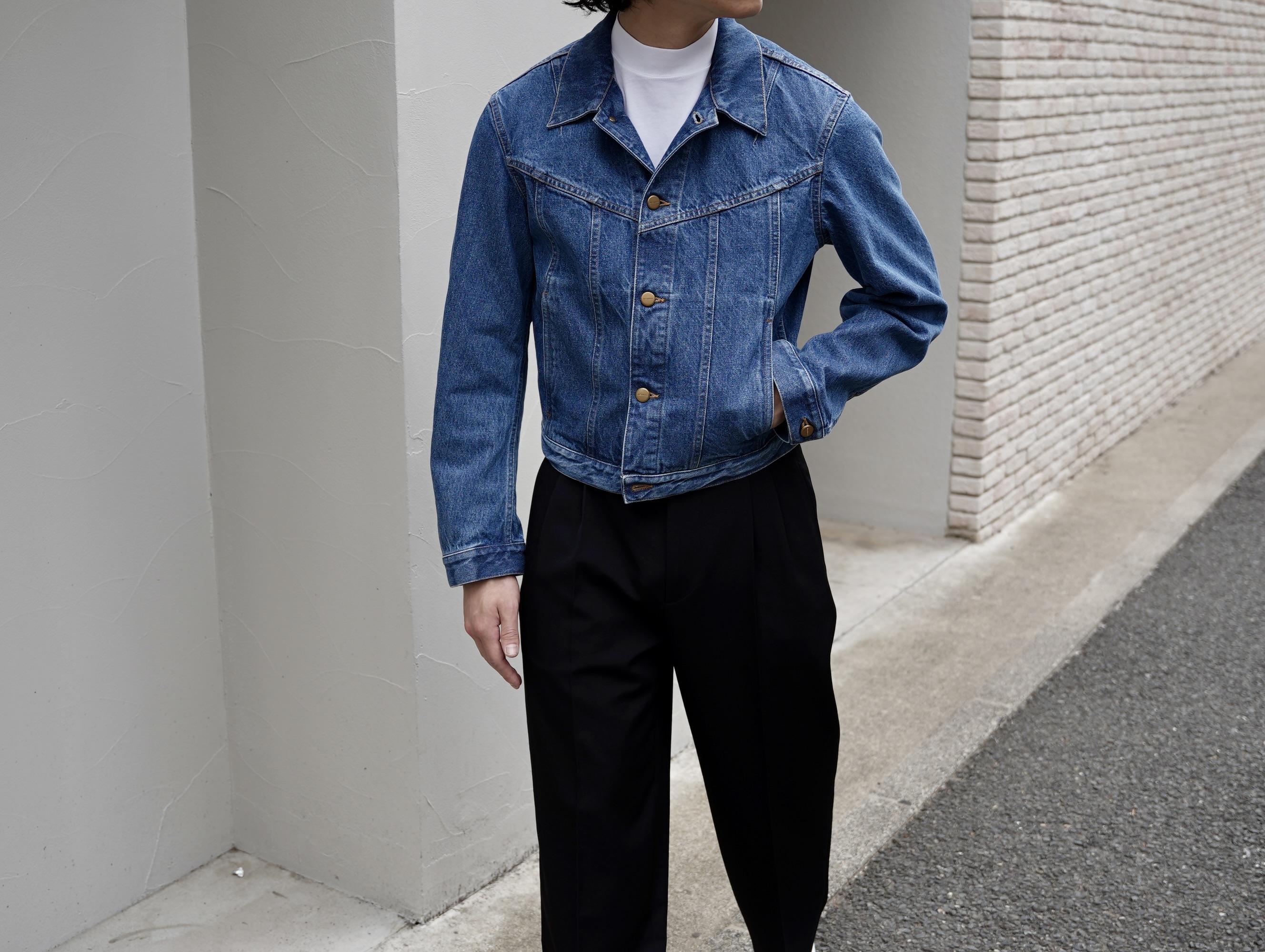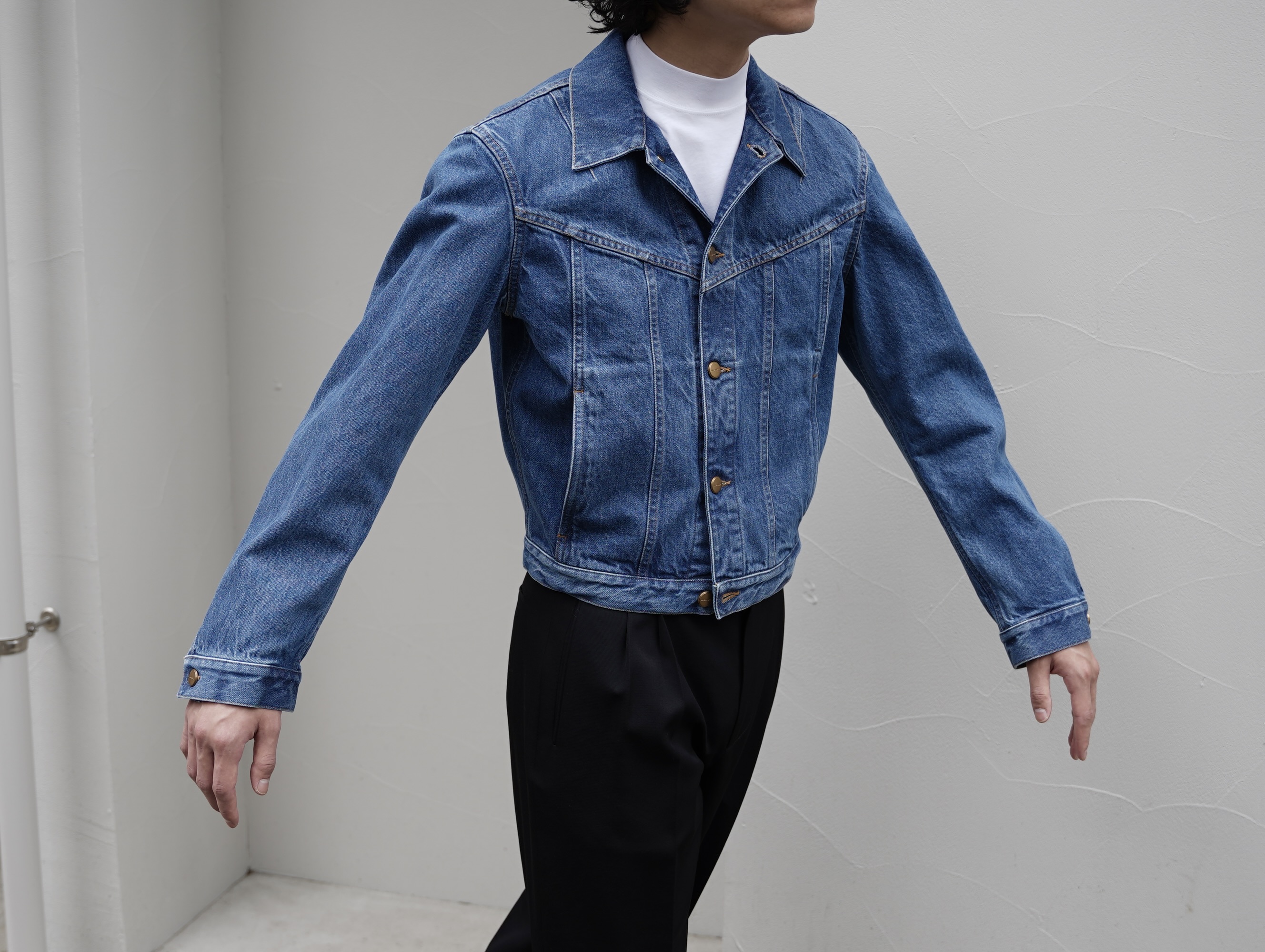 クラシックなトラッカージャケットをベースにしつつ、直線的でクリーンなカッティングで再構築されています。