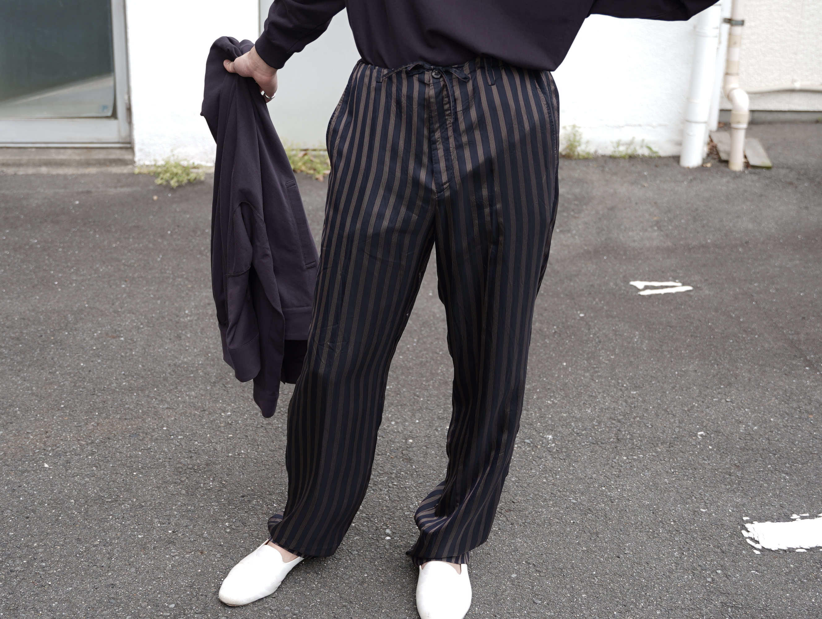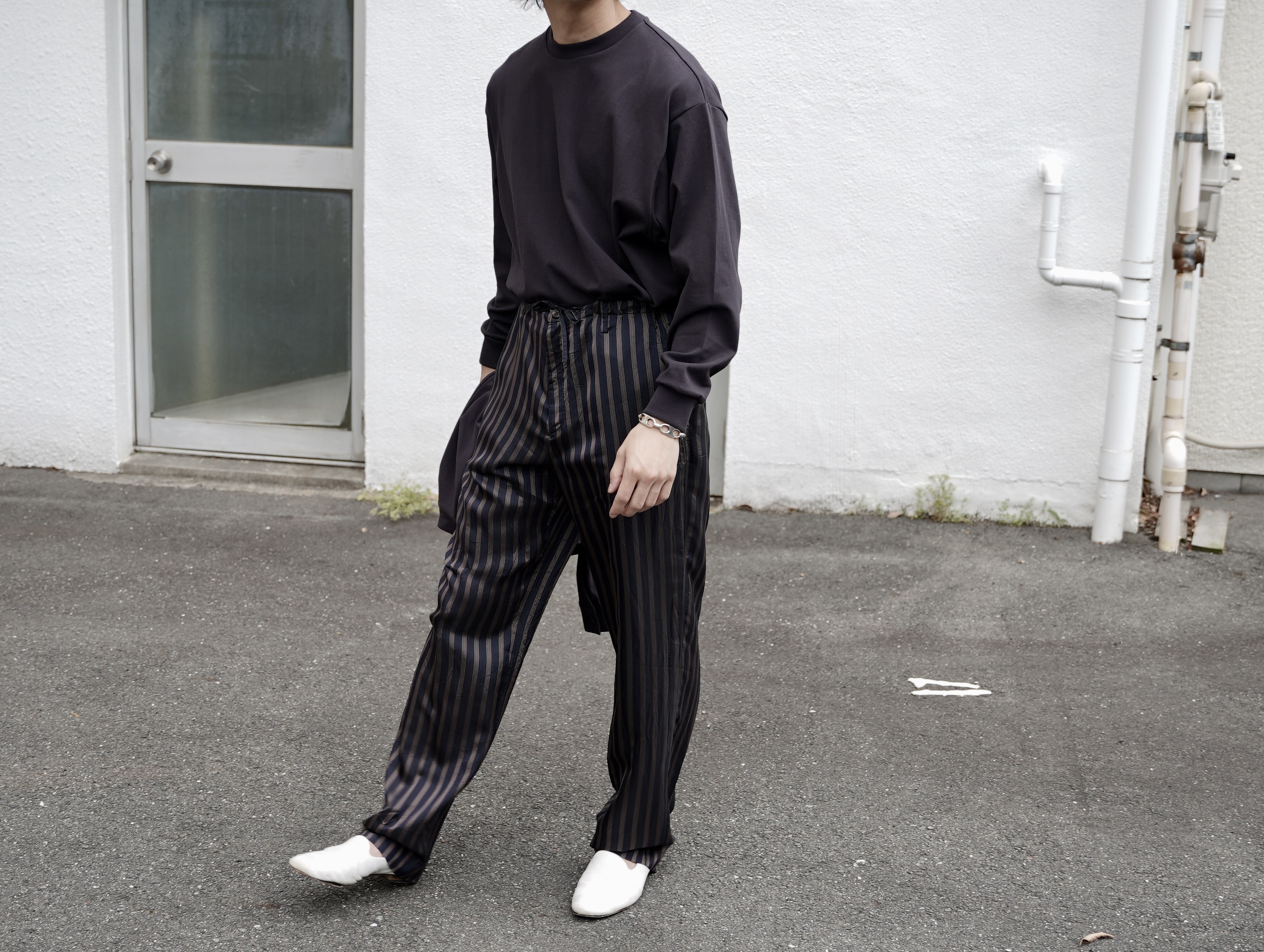 定番のイージースラックスはしなやかな素材を使用し動きに合わせて柔らかく揺れる事で、縦のラインをより美しく引き立てます。