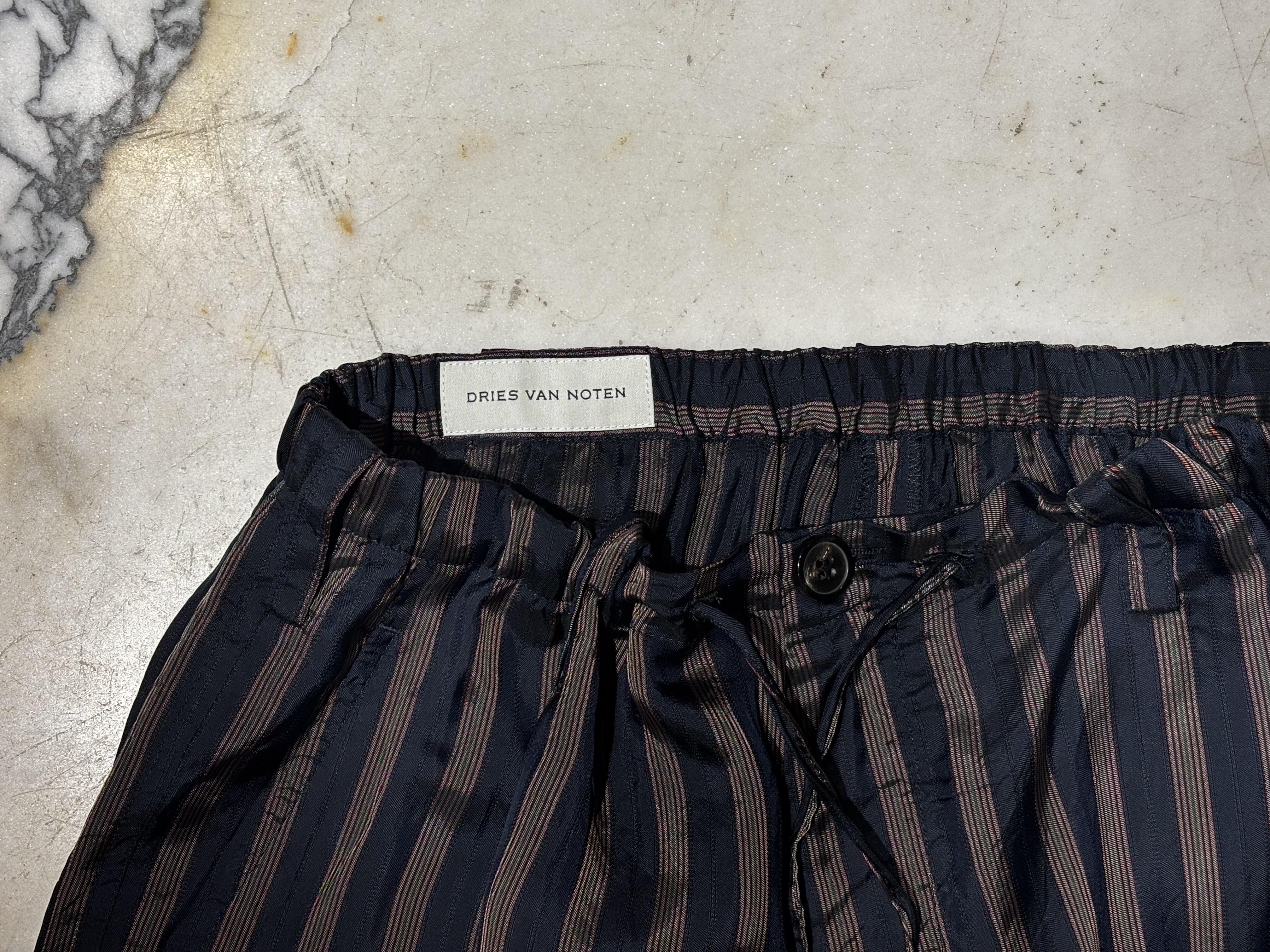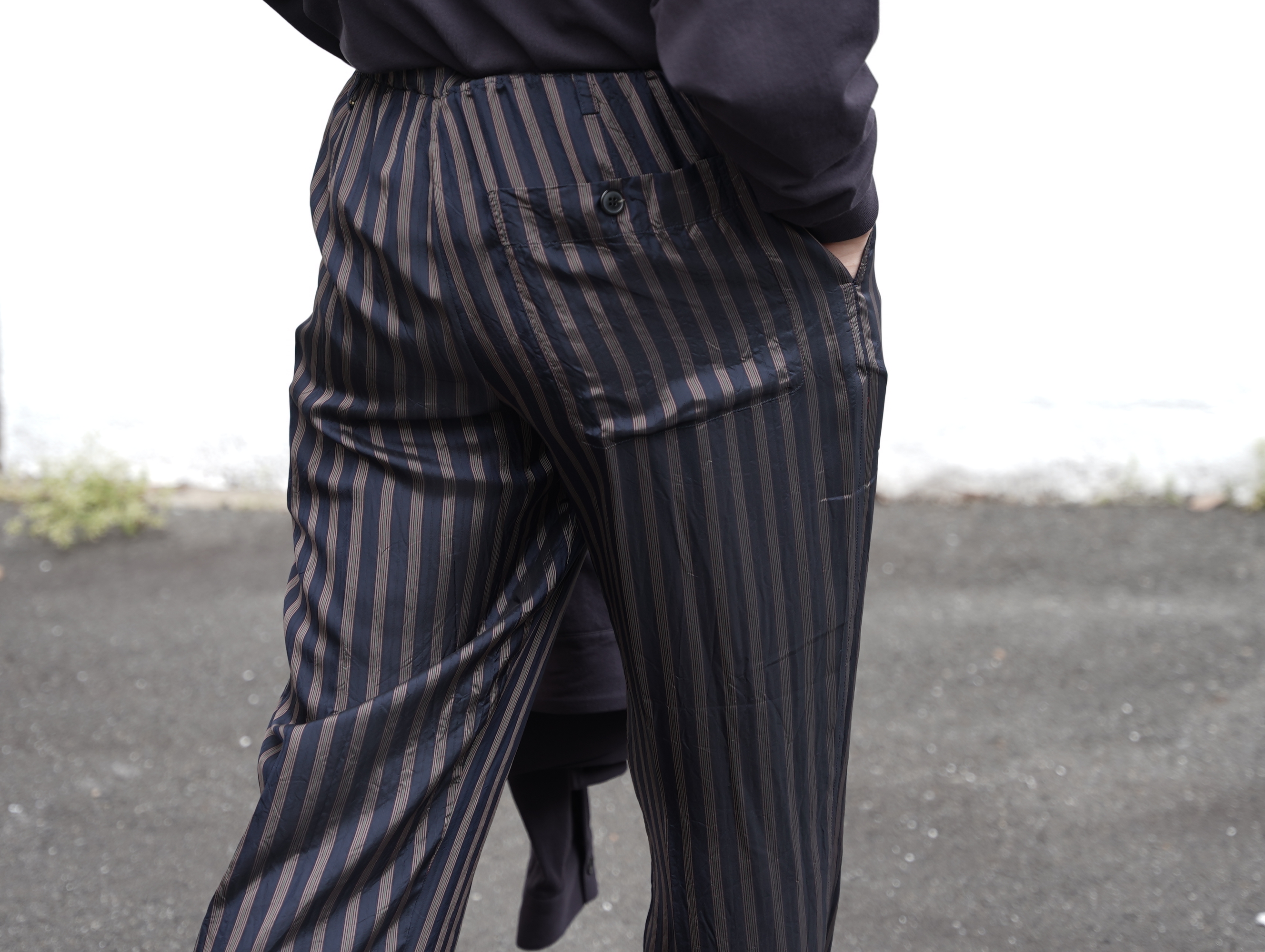 クラシックなストライプトラウザーの側面を保ちながら、流動的な素材使いによってDries Van Notenらしい静かなるエレガンスへと昇華された一本です。